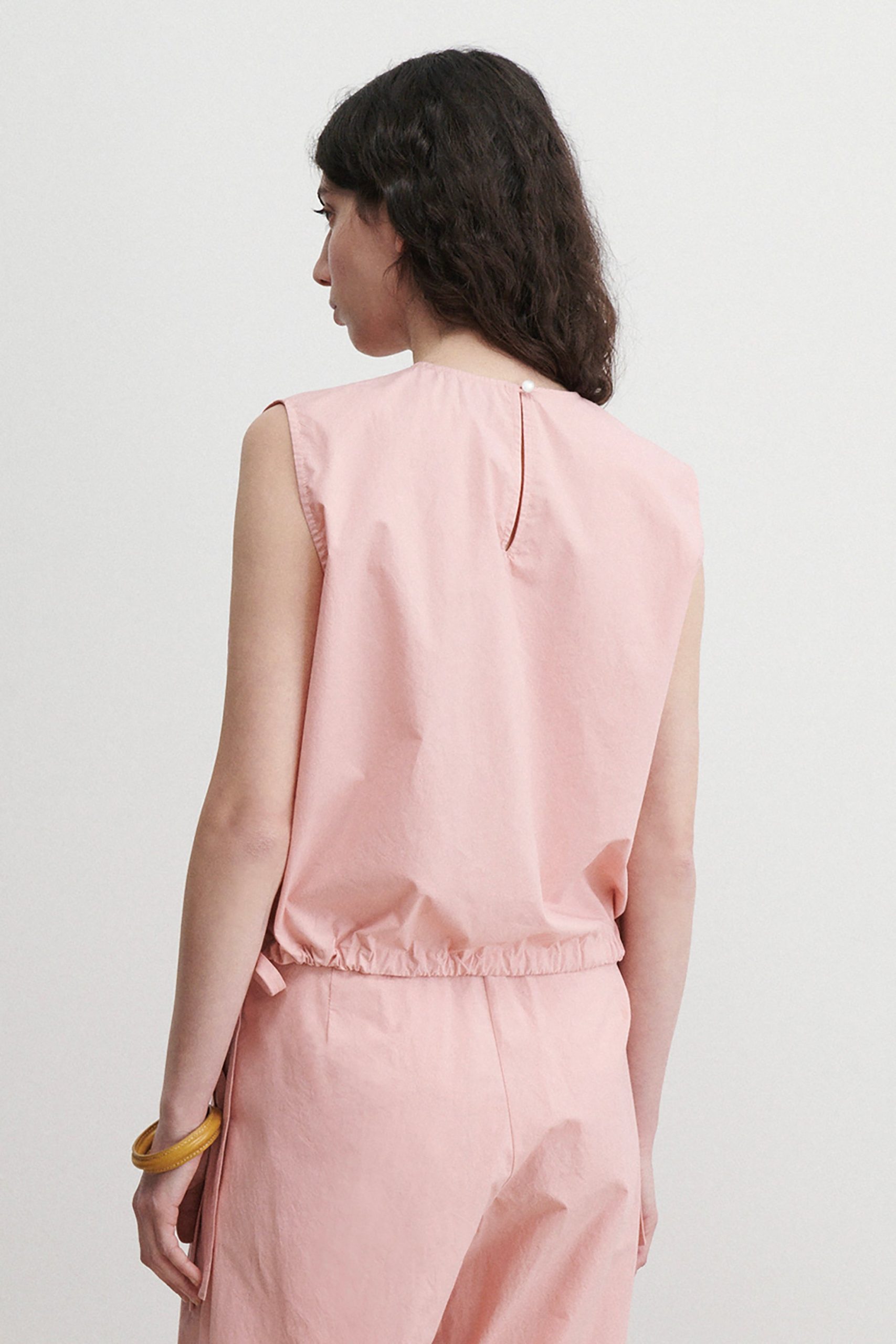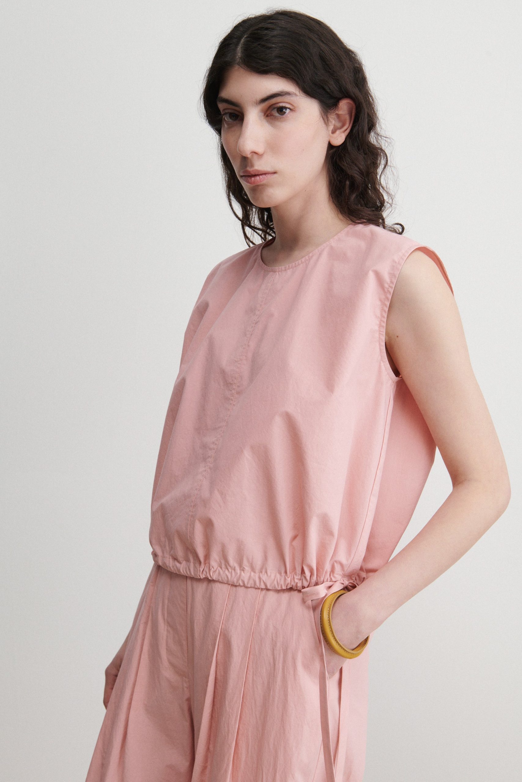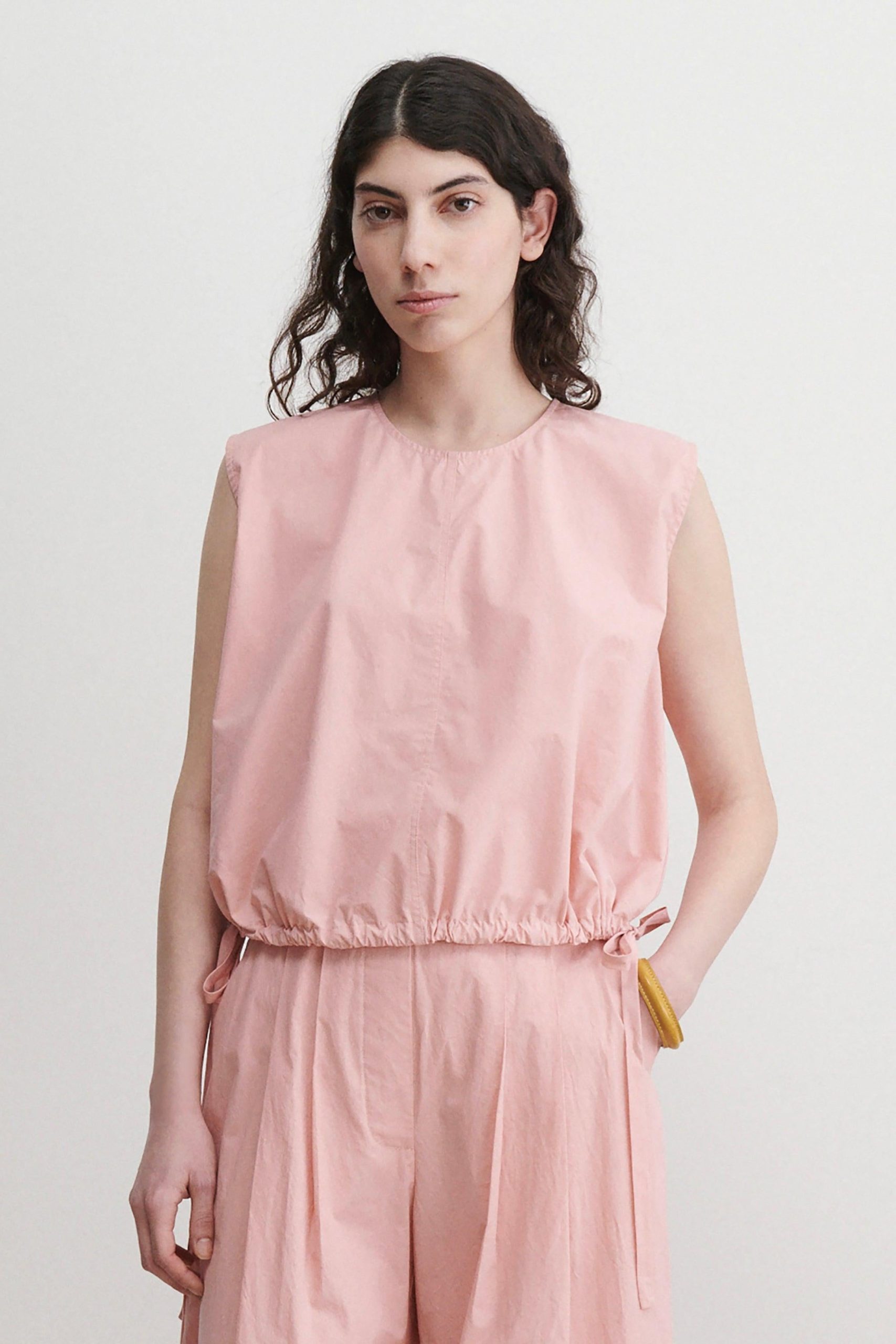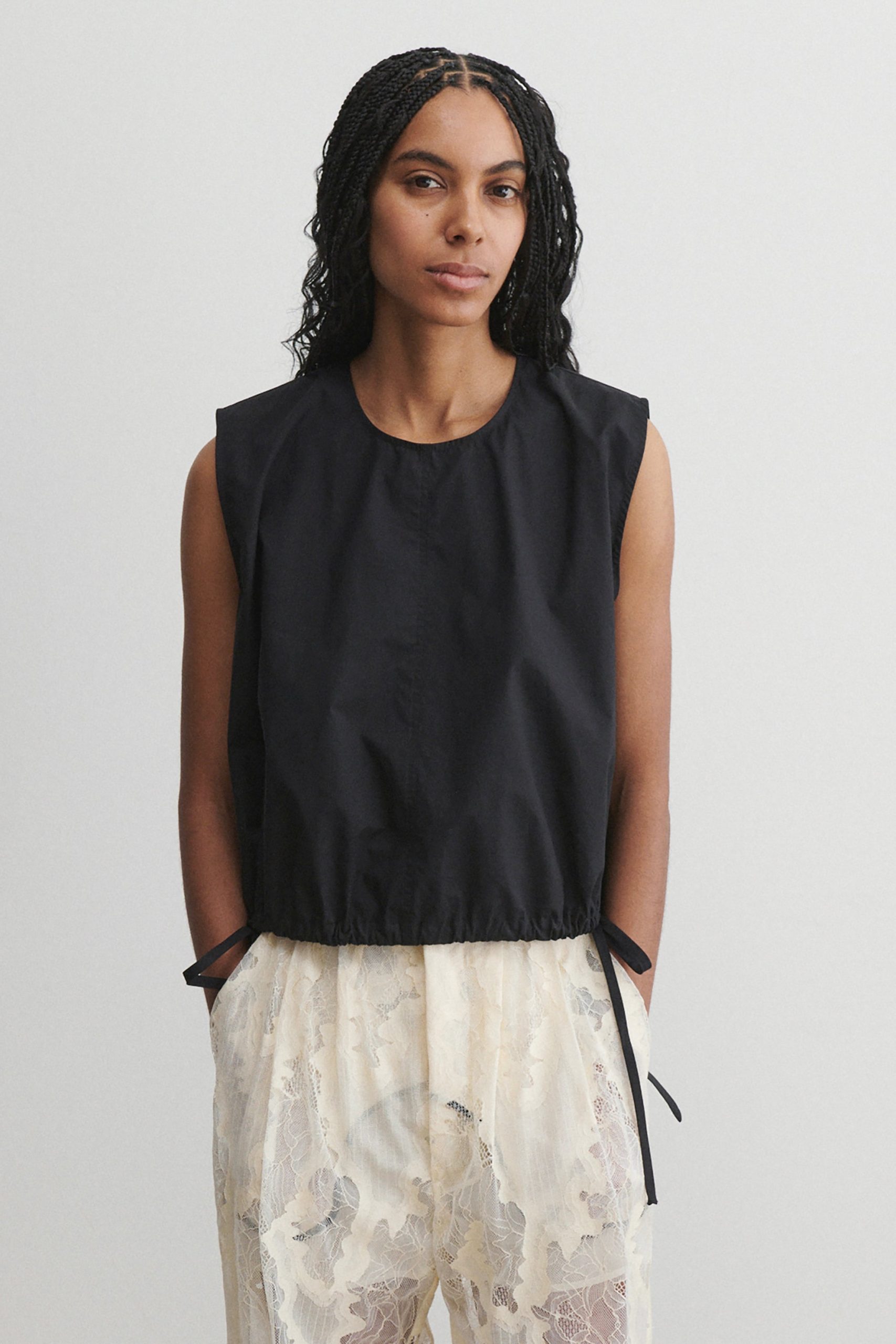 Sleeveless round neck top cut from crisp cotton. Finished with a drawsting at the hem.