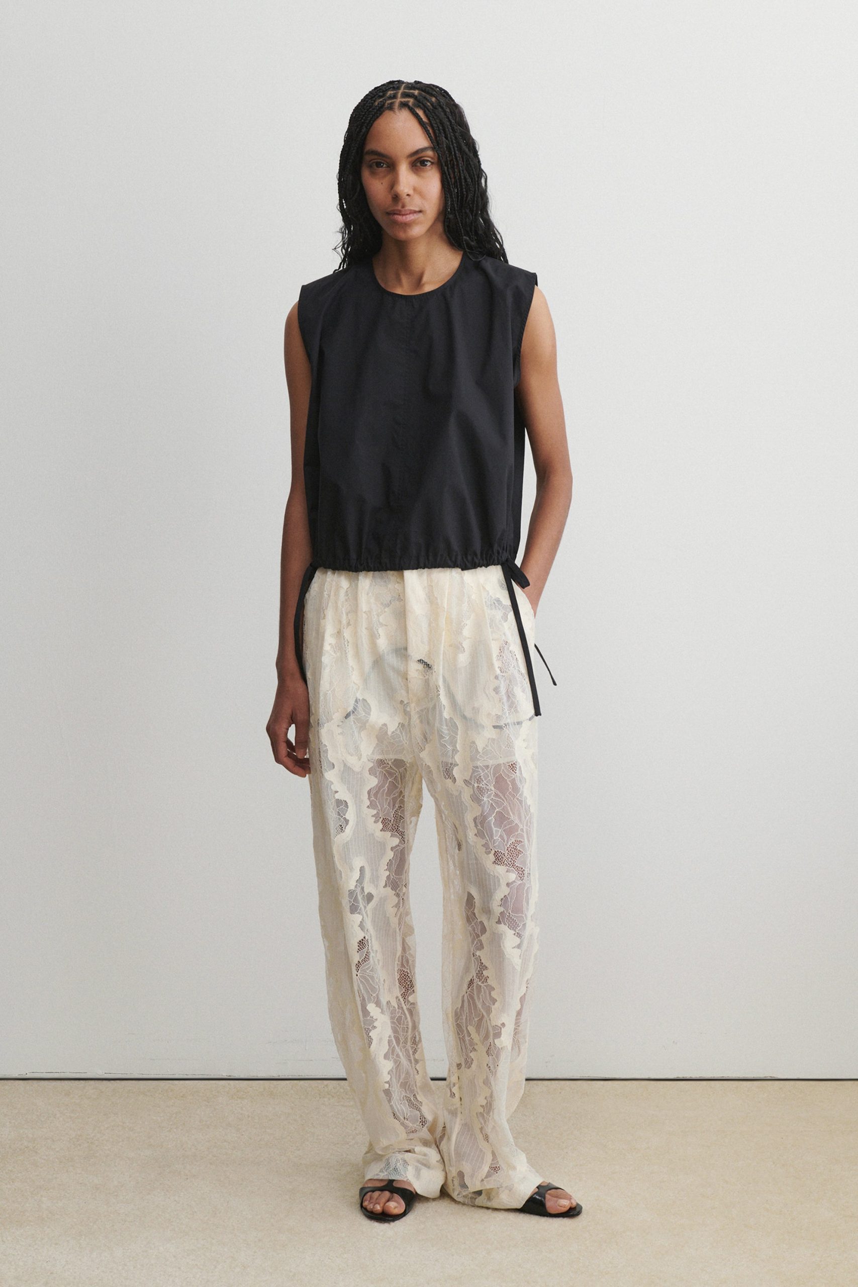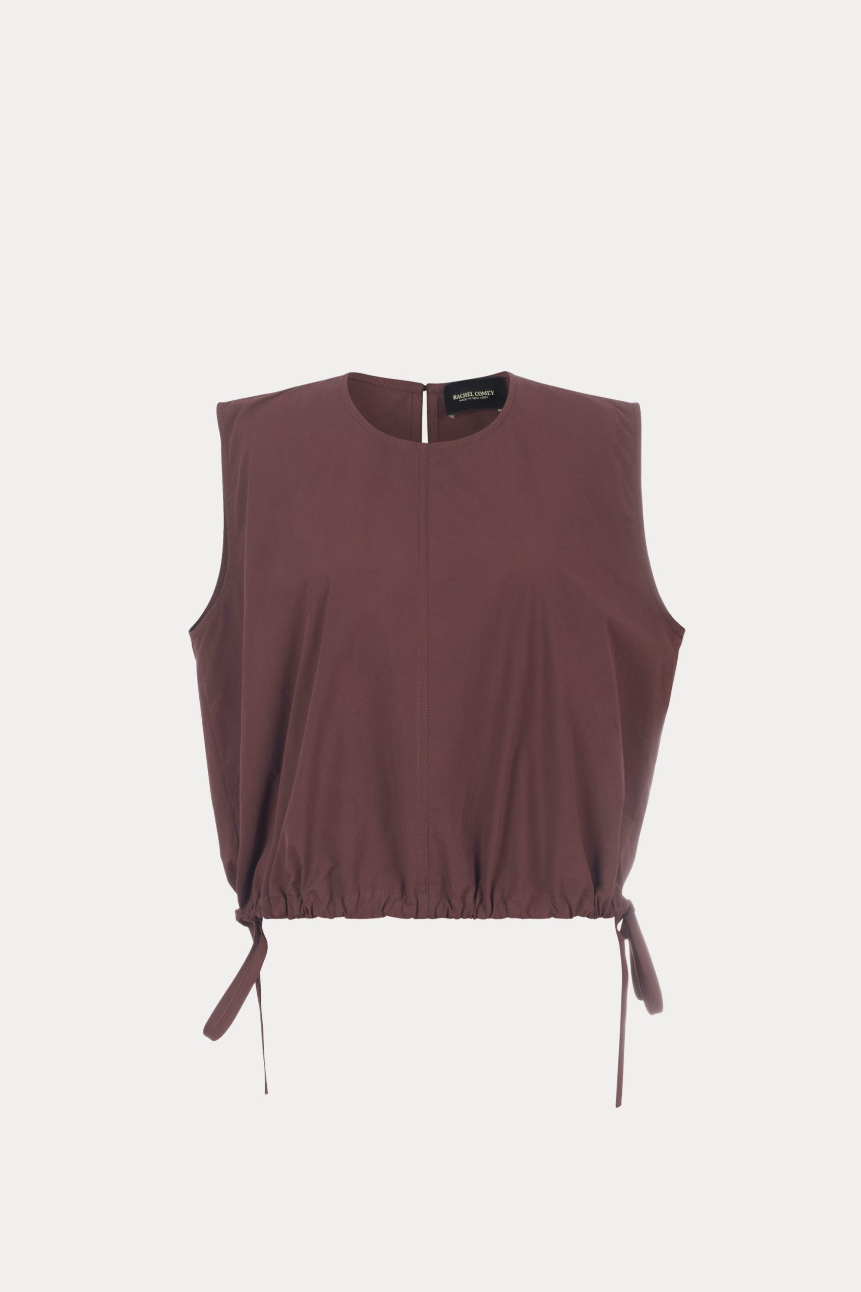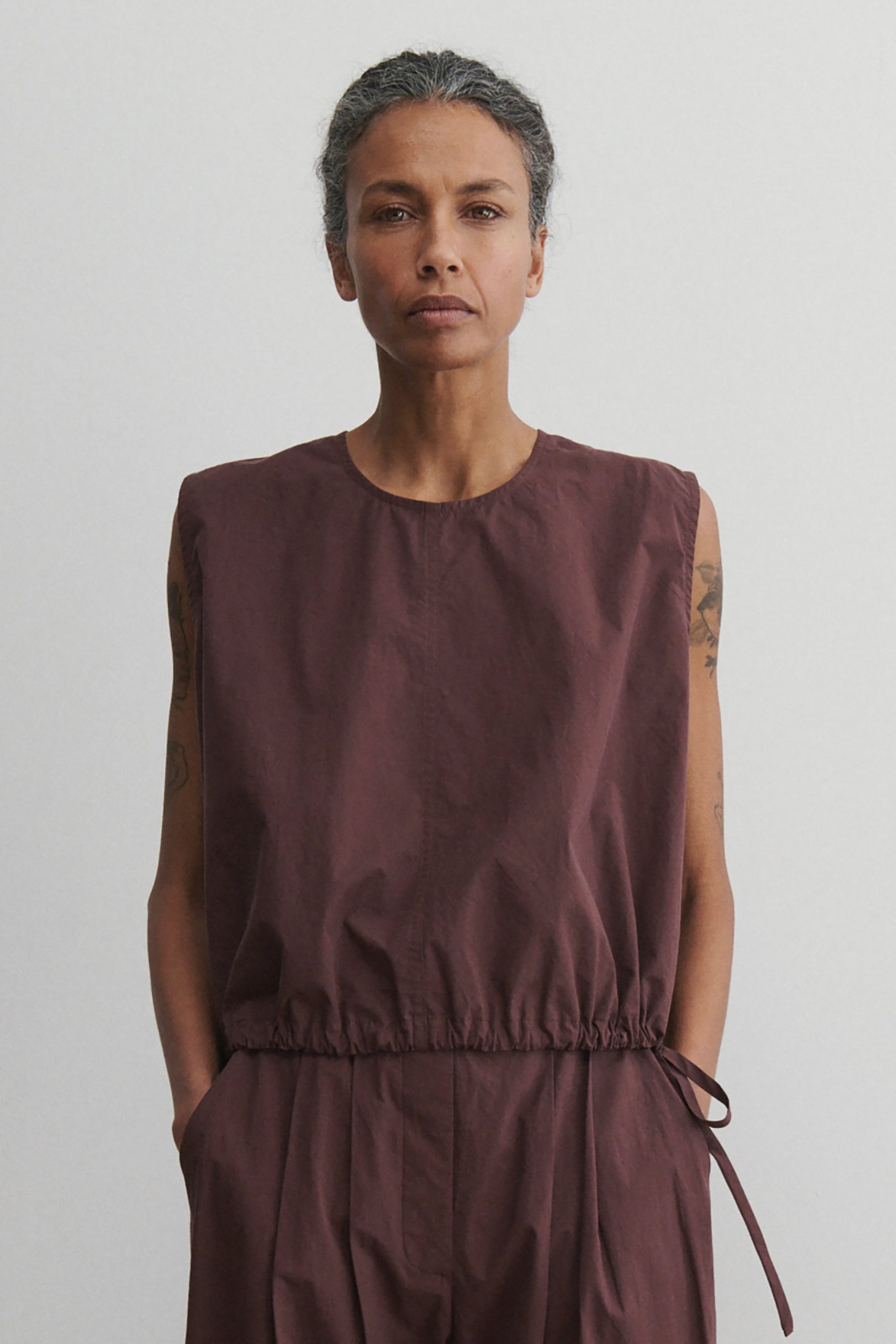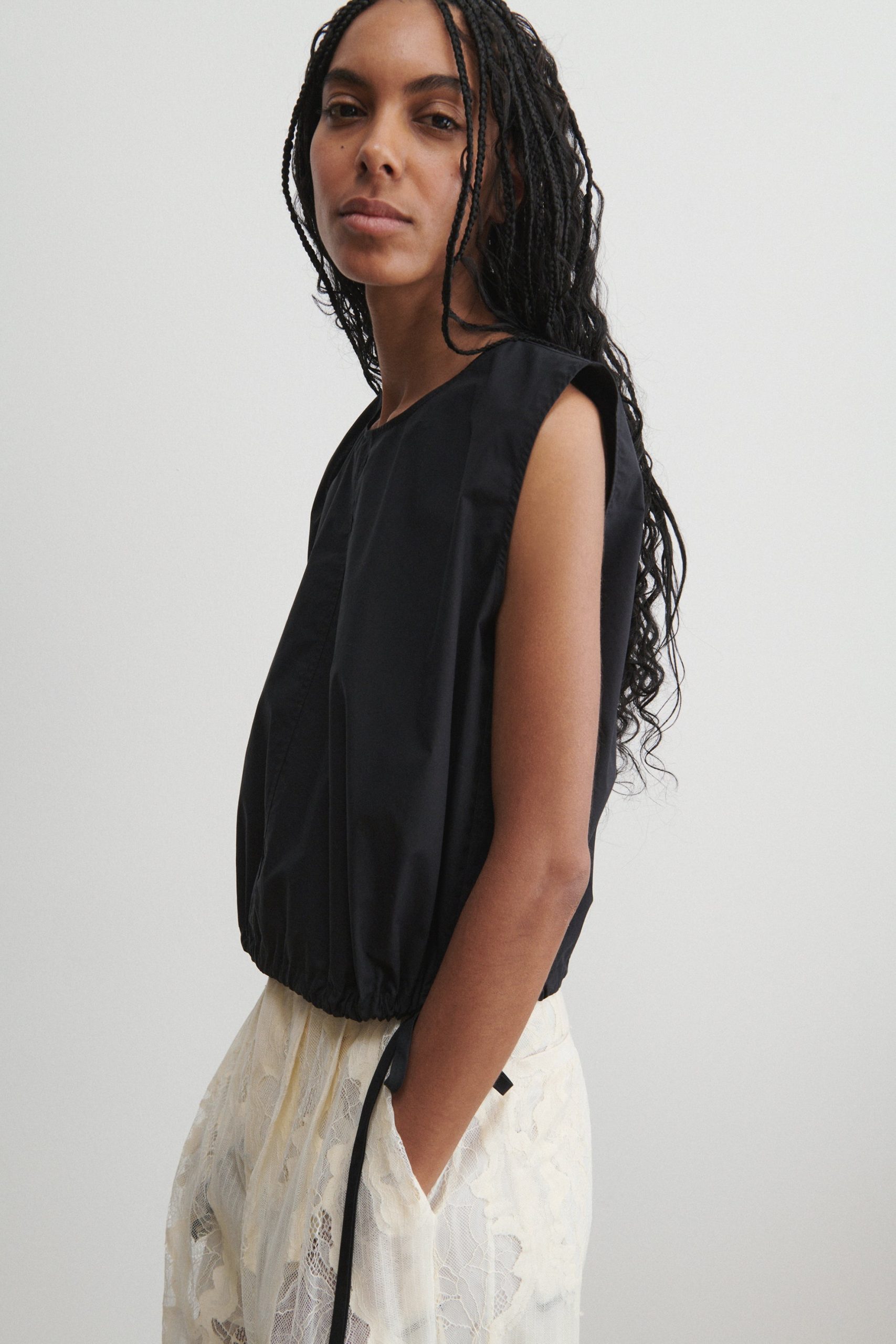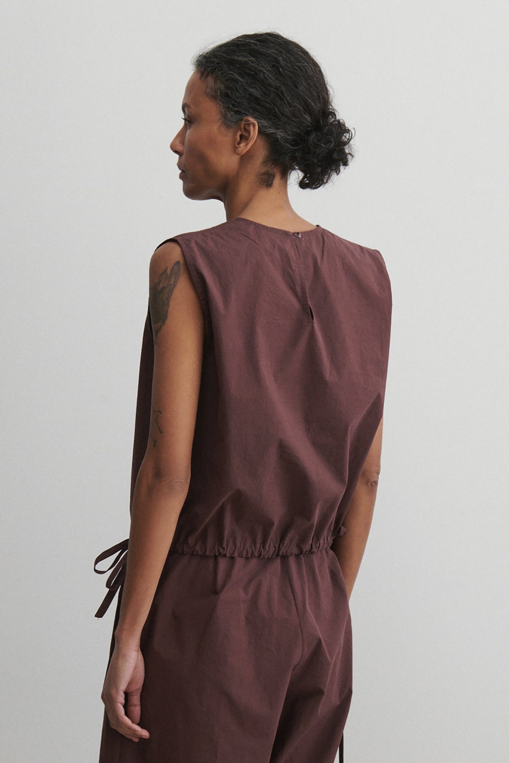 Sleeveless round neck top cut from crisp cotton. Finished with a drawsting at the hem.