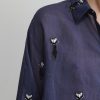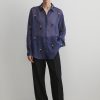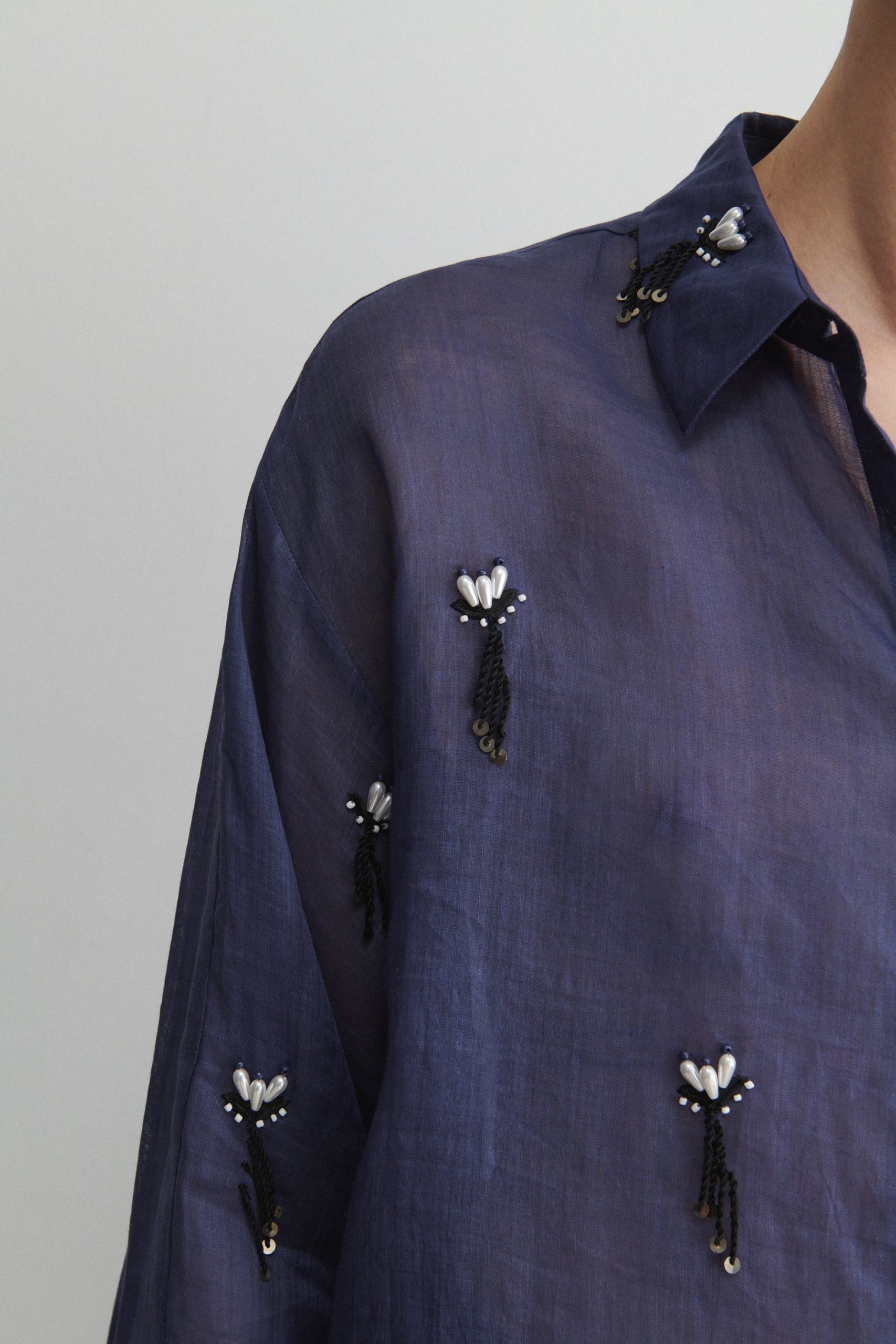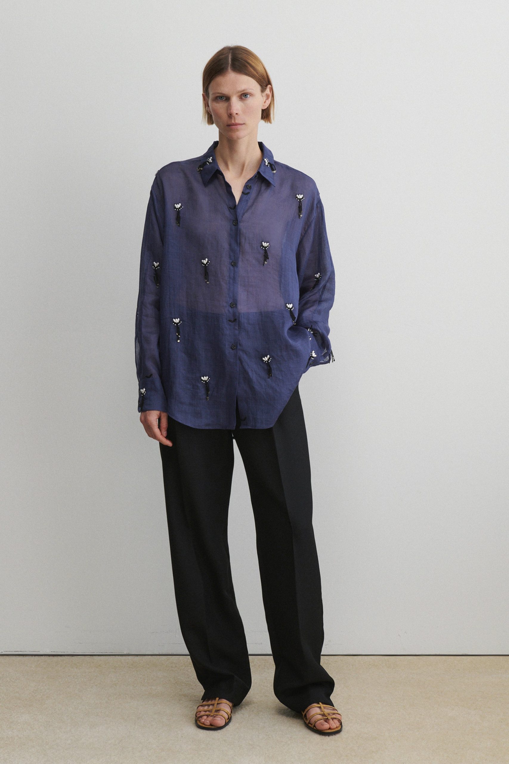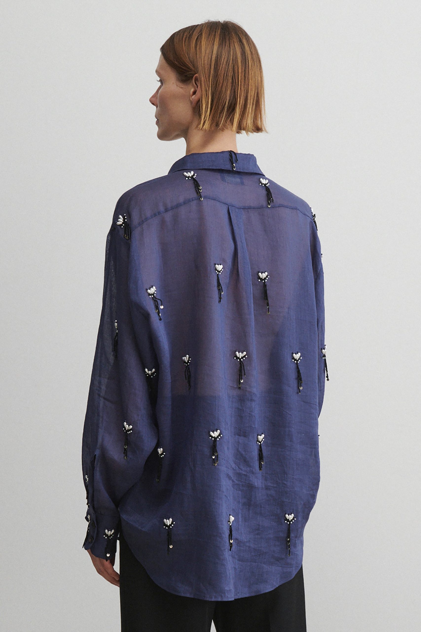Sheer long-sleeve dress shirt with beaded floral embroidery and button-front. Wear with our matching Gayton Short for a breezy statement-making set.