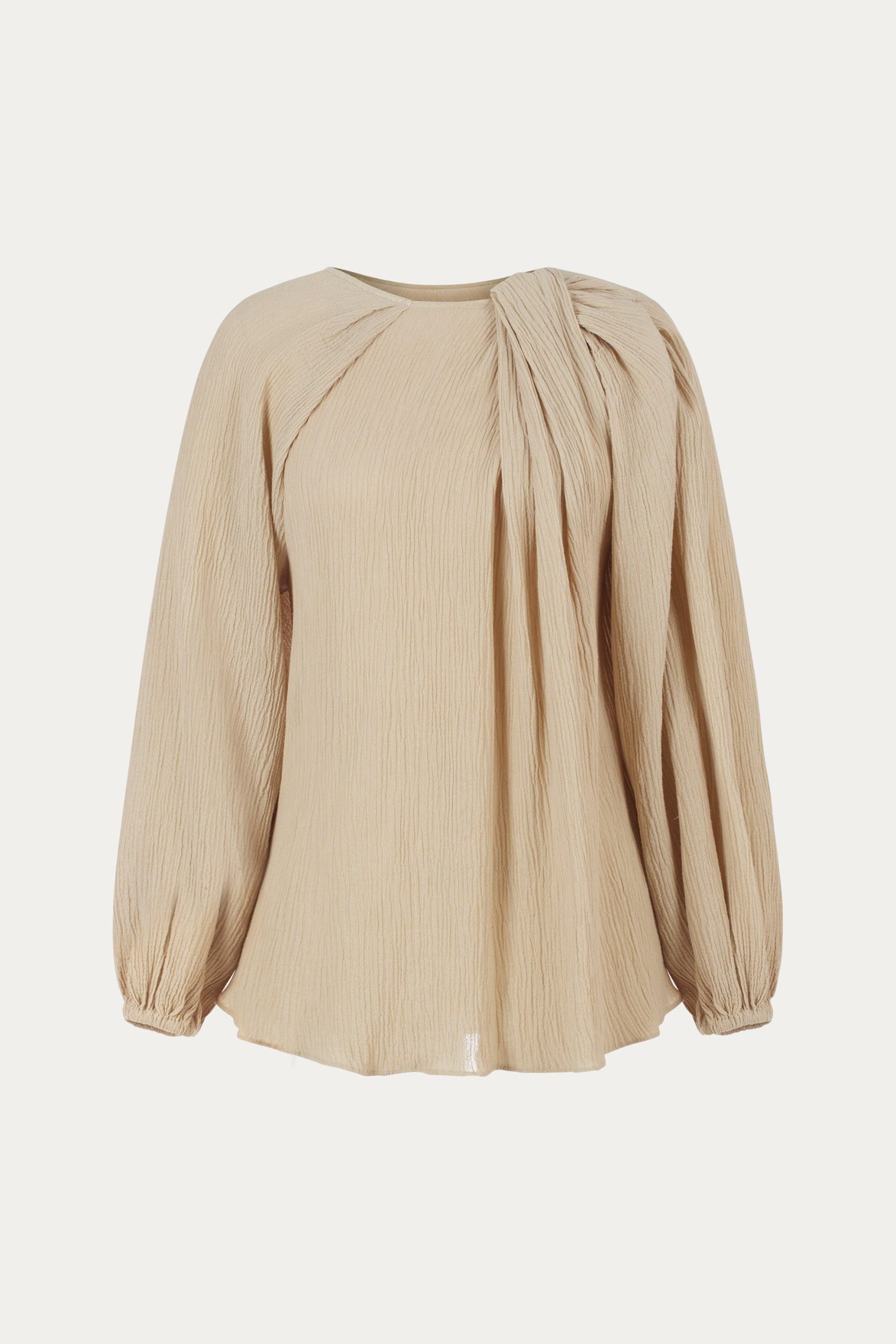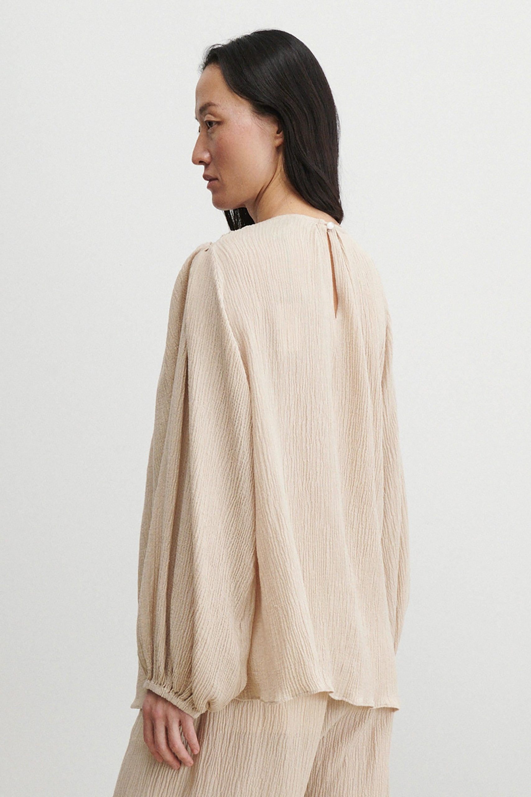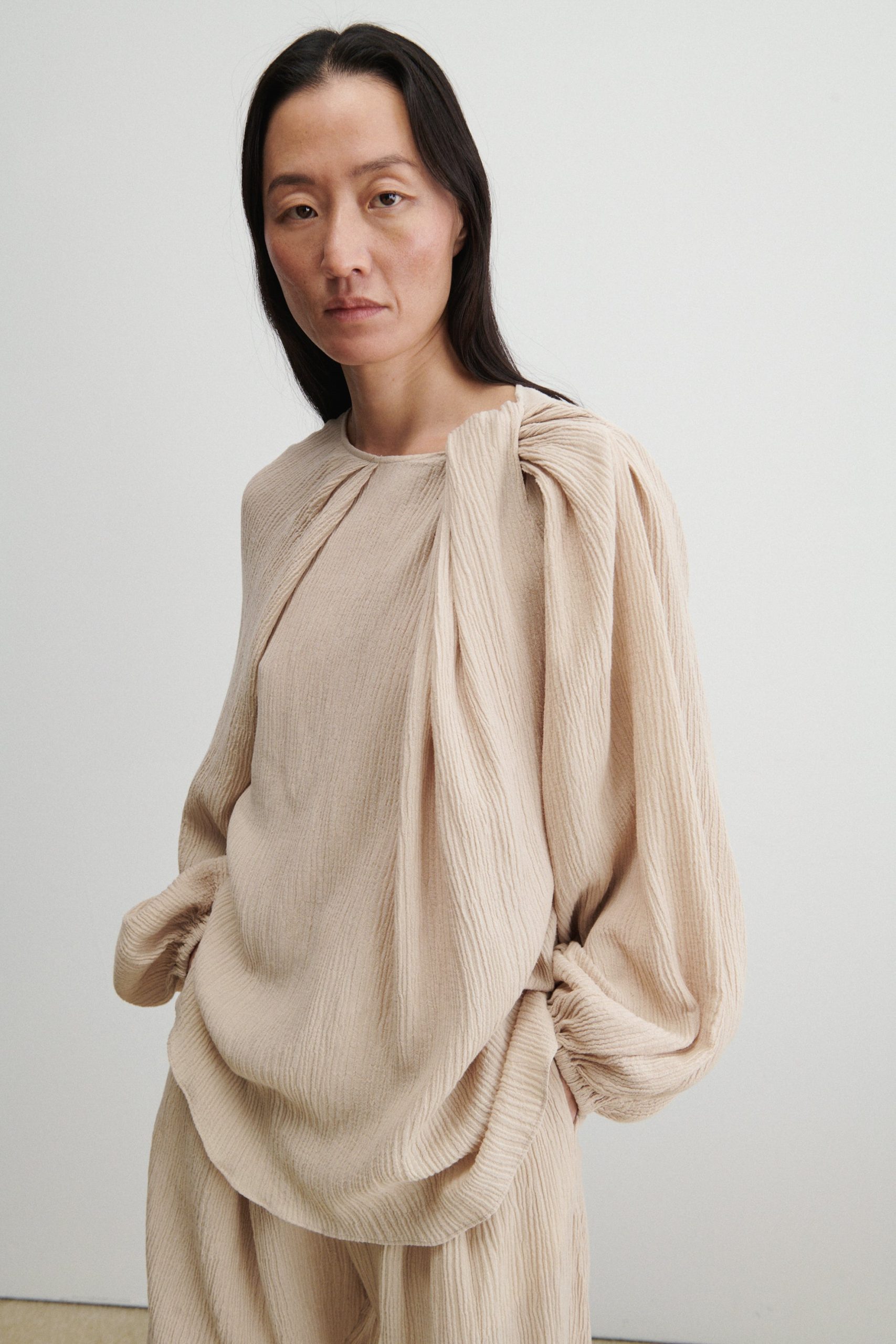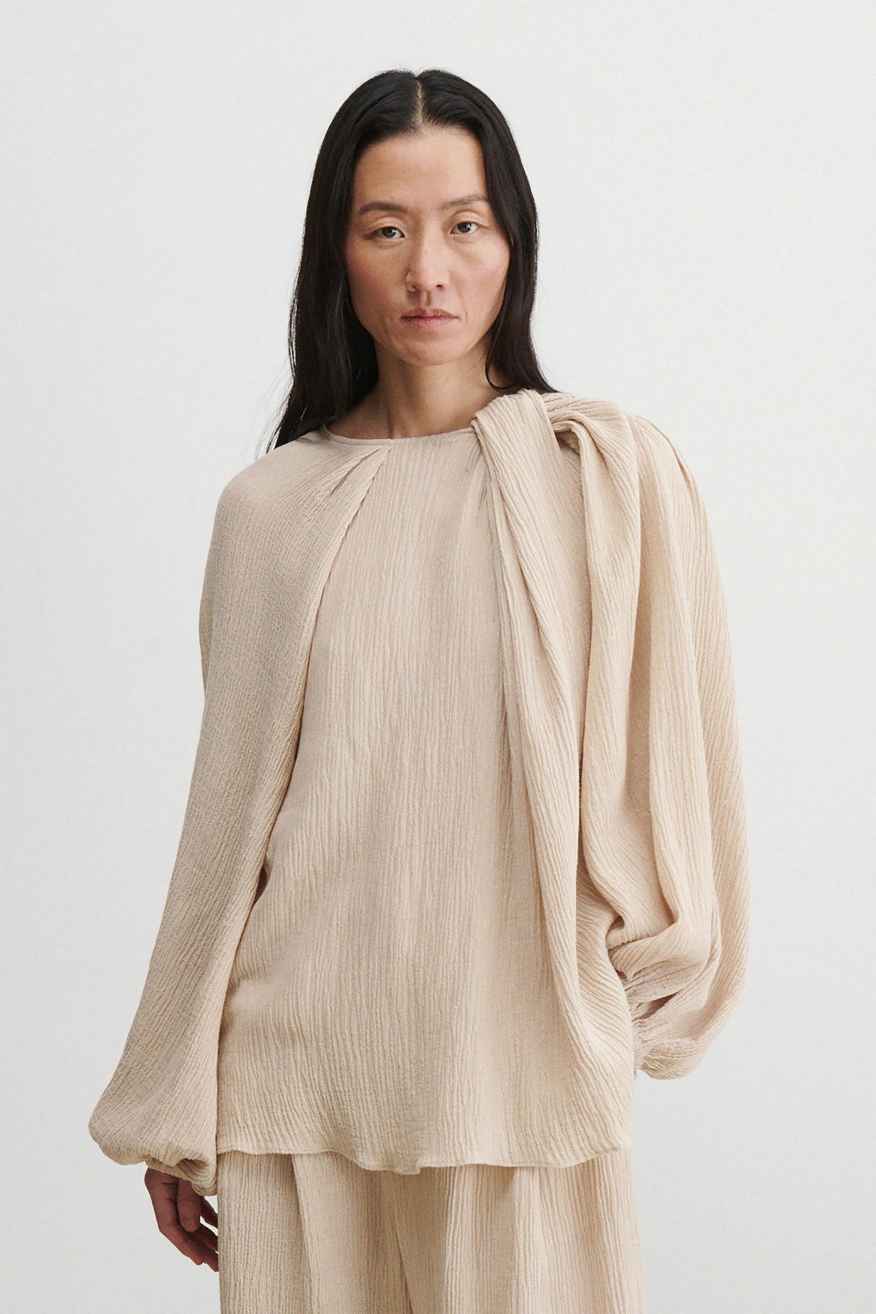 Elegant long-sleeve blouse with drape detailing. Cut from airy Ramie linen gauze, which has a lightweight and textured quality. Pair with matching Dawn Pant.