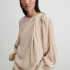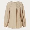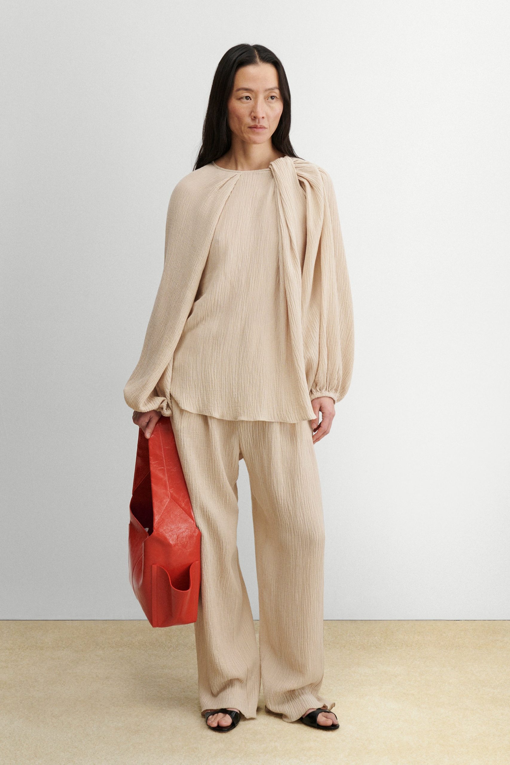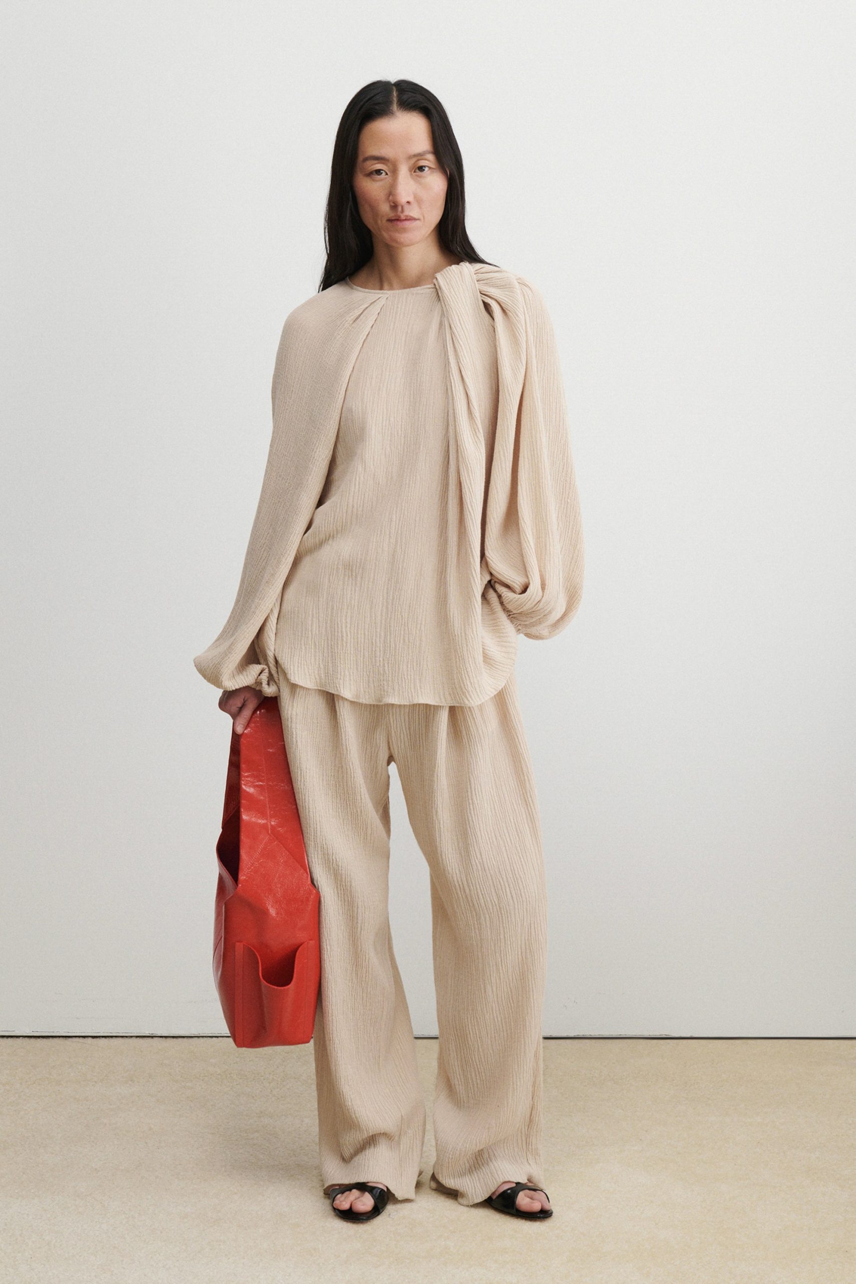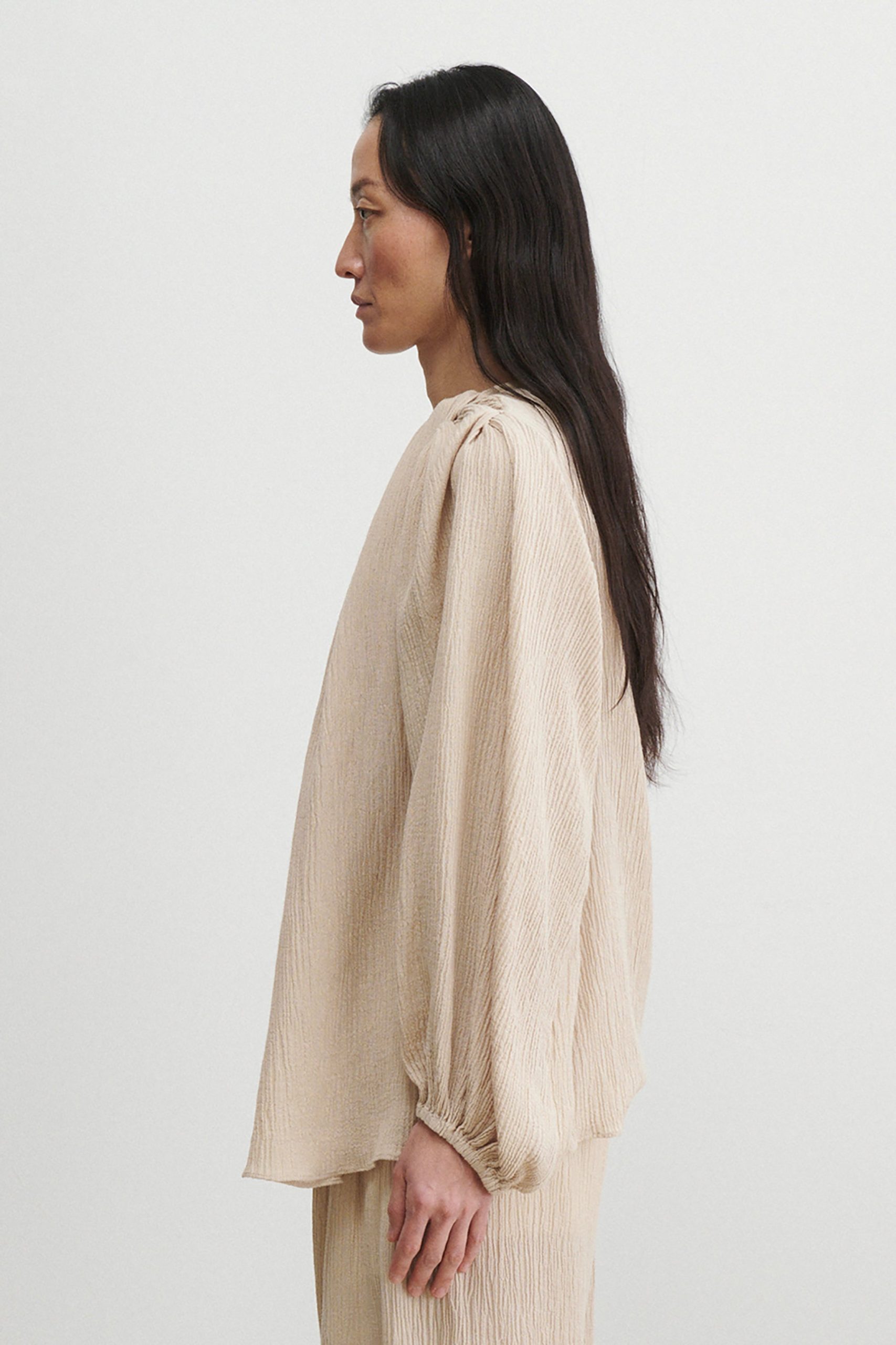 Elegant long-sleeve blouse with drape detailing. Cut from airy Ramie linen gauze, which has a lightweight and textured quality. Pair with matching Dawn Pant.