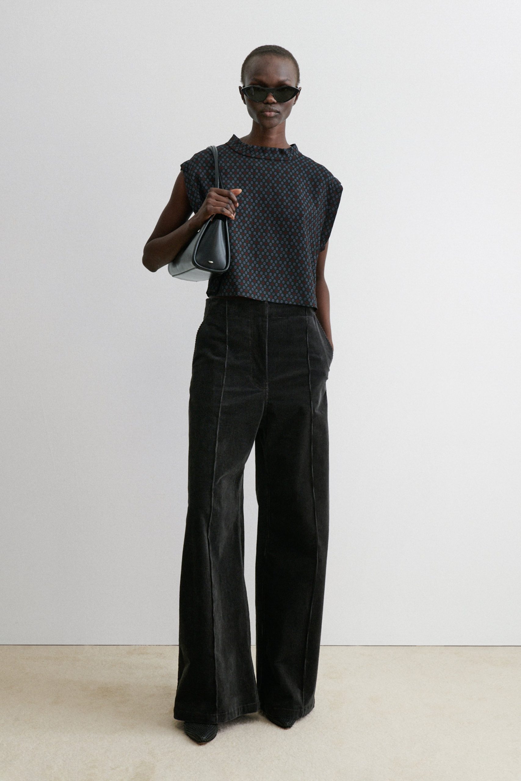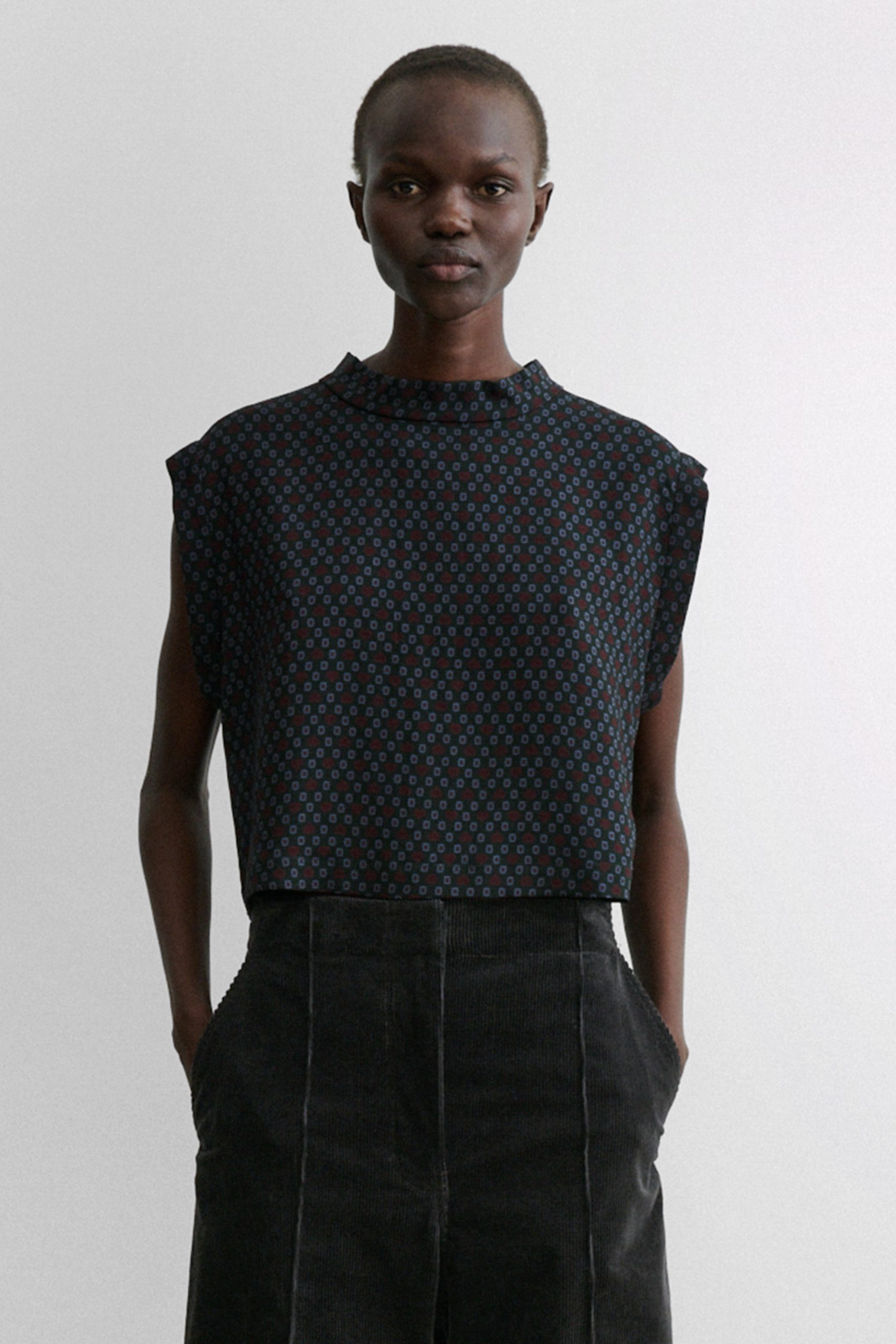 Oversized, boxy mock neck crop top in our Dandy print, a pattern reminiscent of men’s ties. Wear with the matching Hede Pant for a perfect party look.