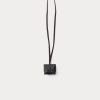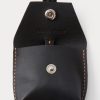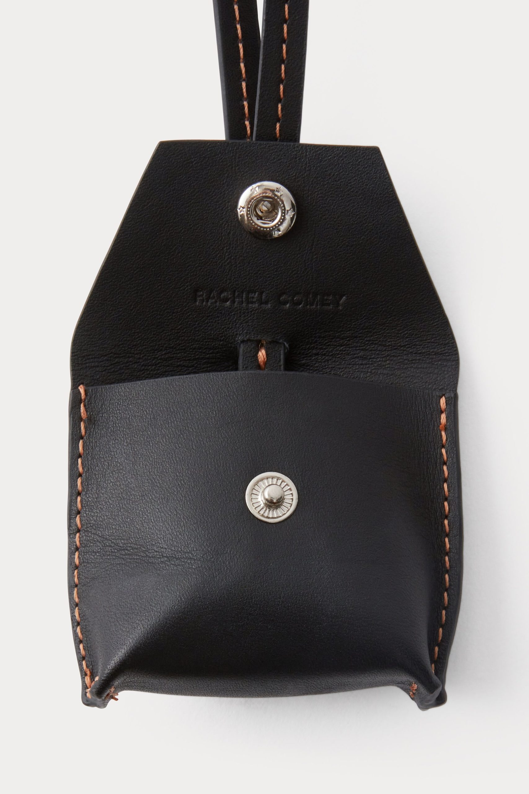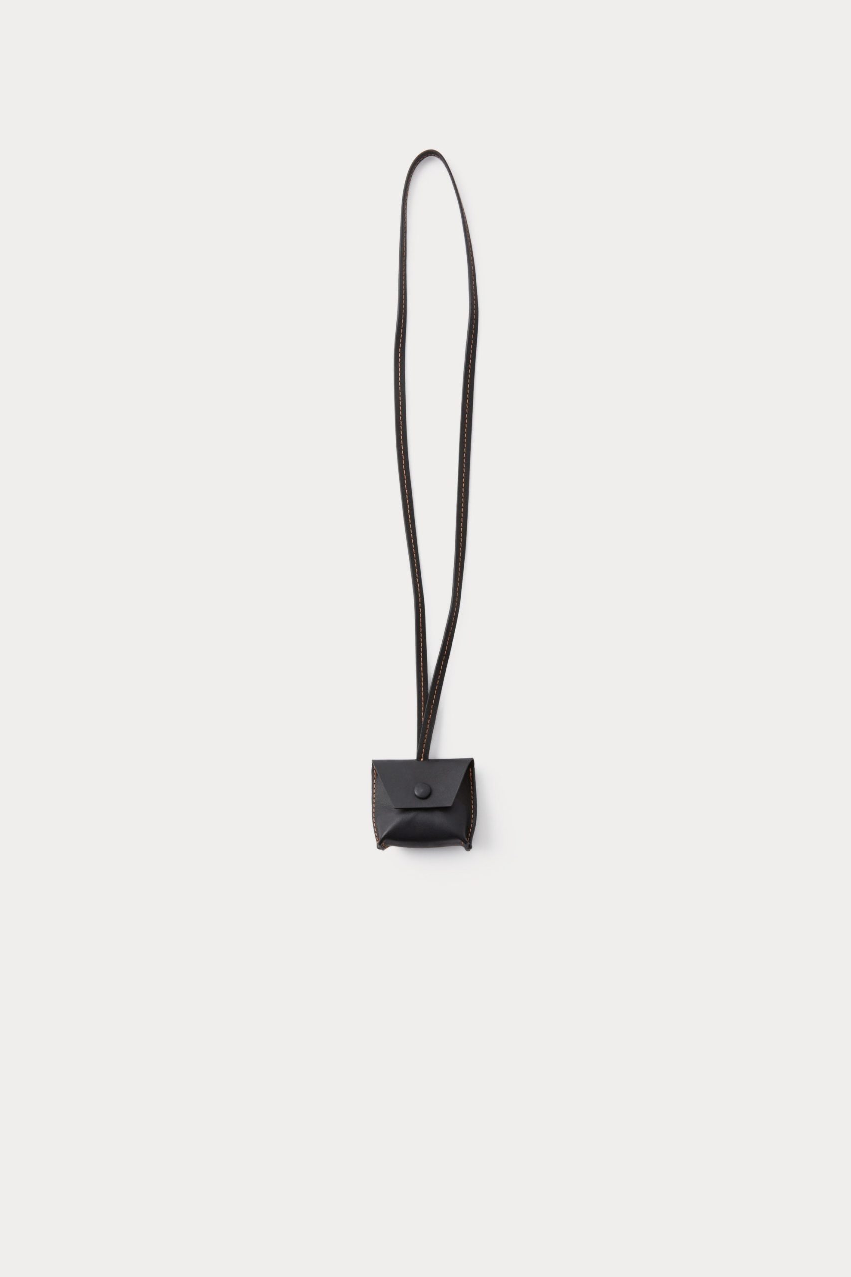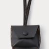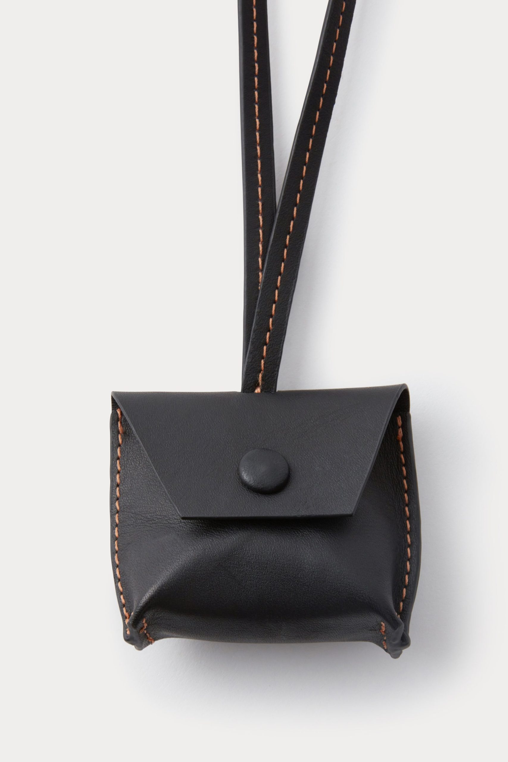 Leather air tag holder suspended from slim cord. Features contrast stitching and a leather-covered snap closure.