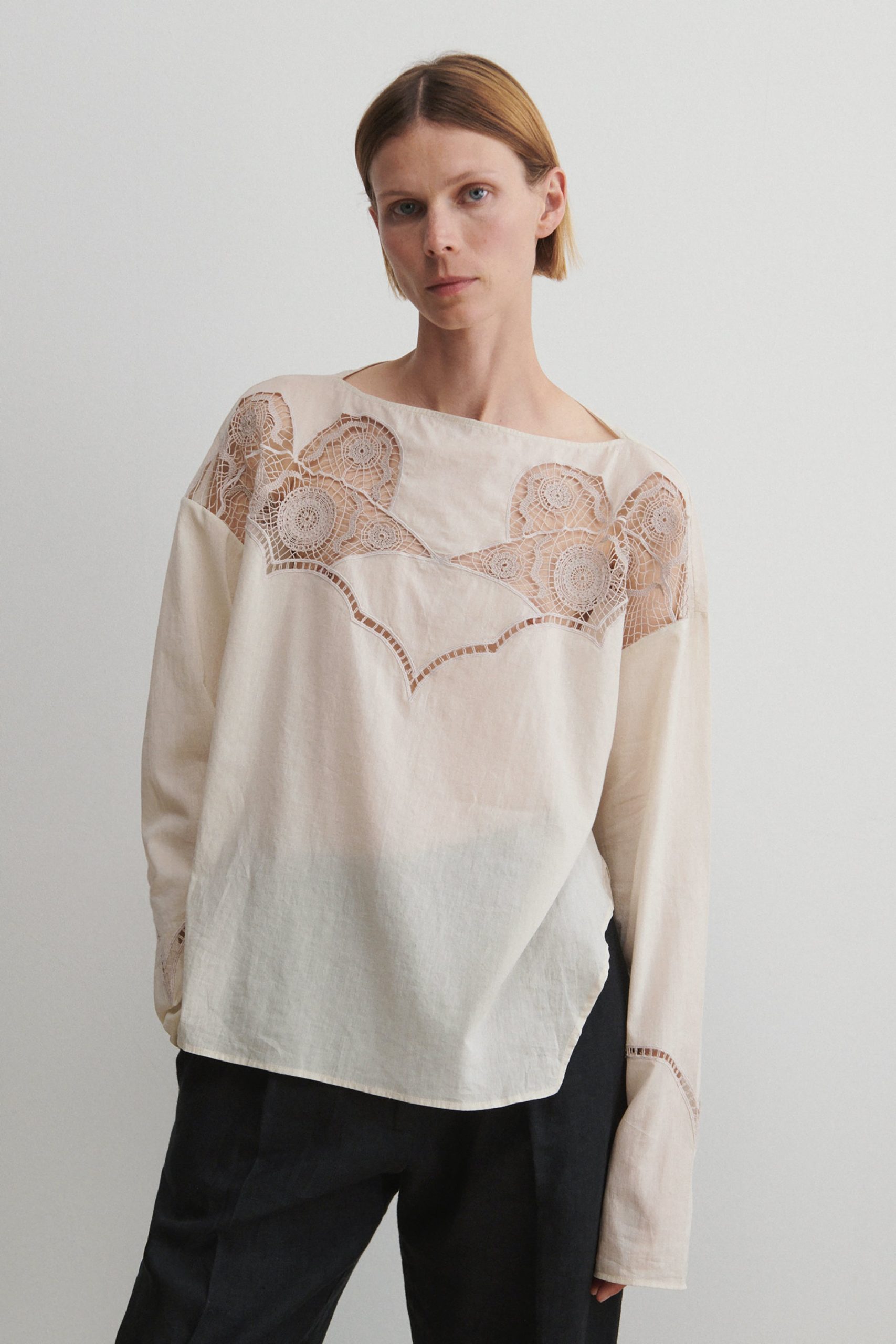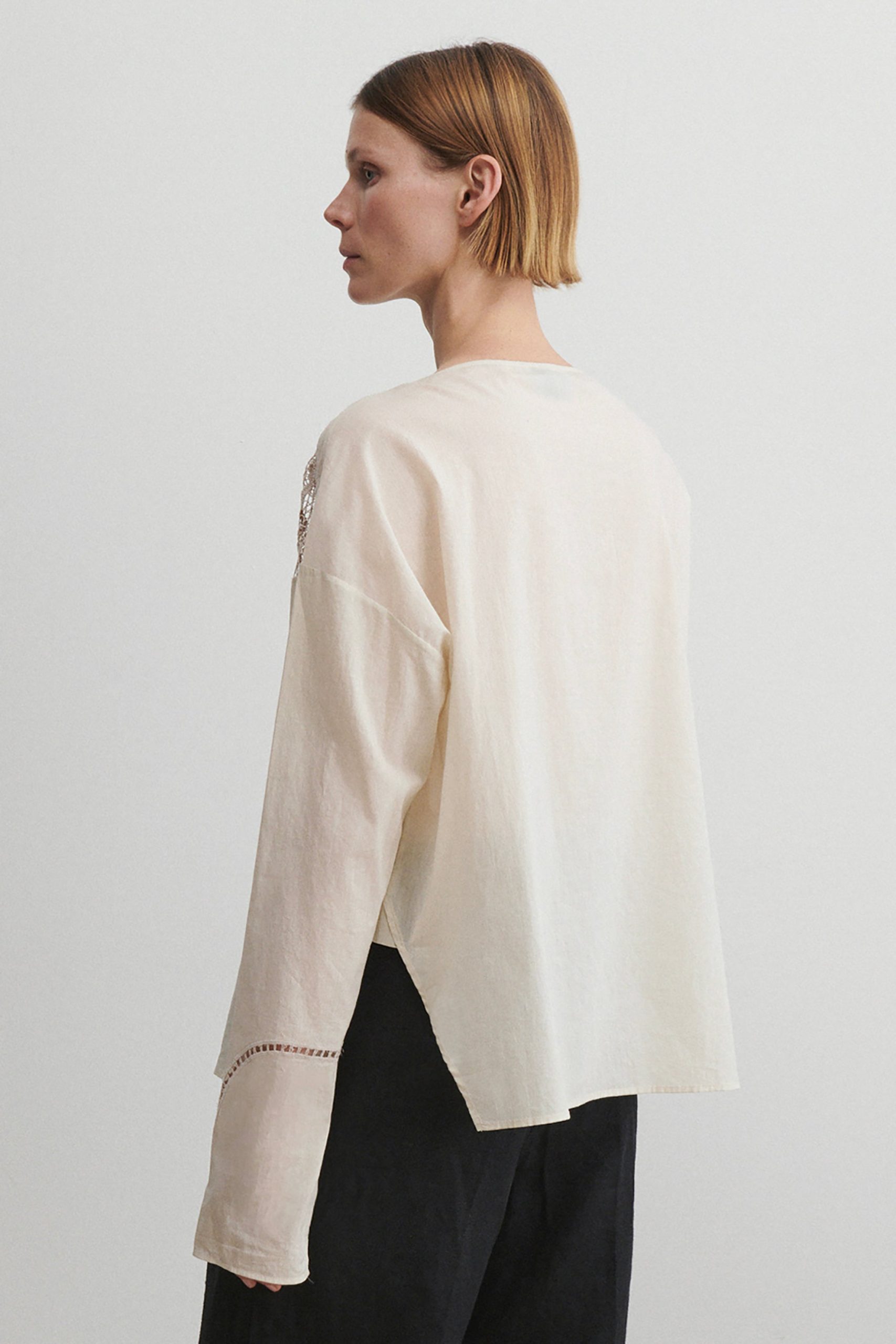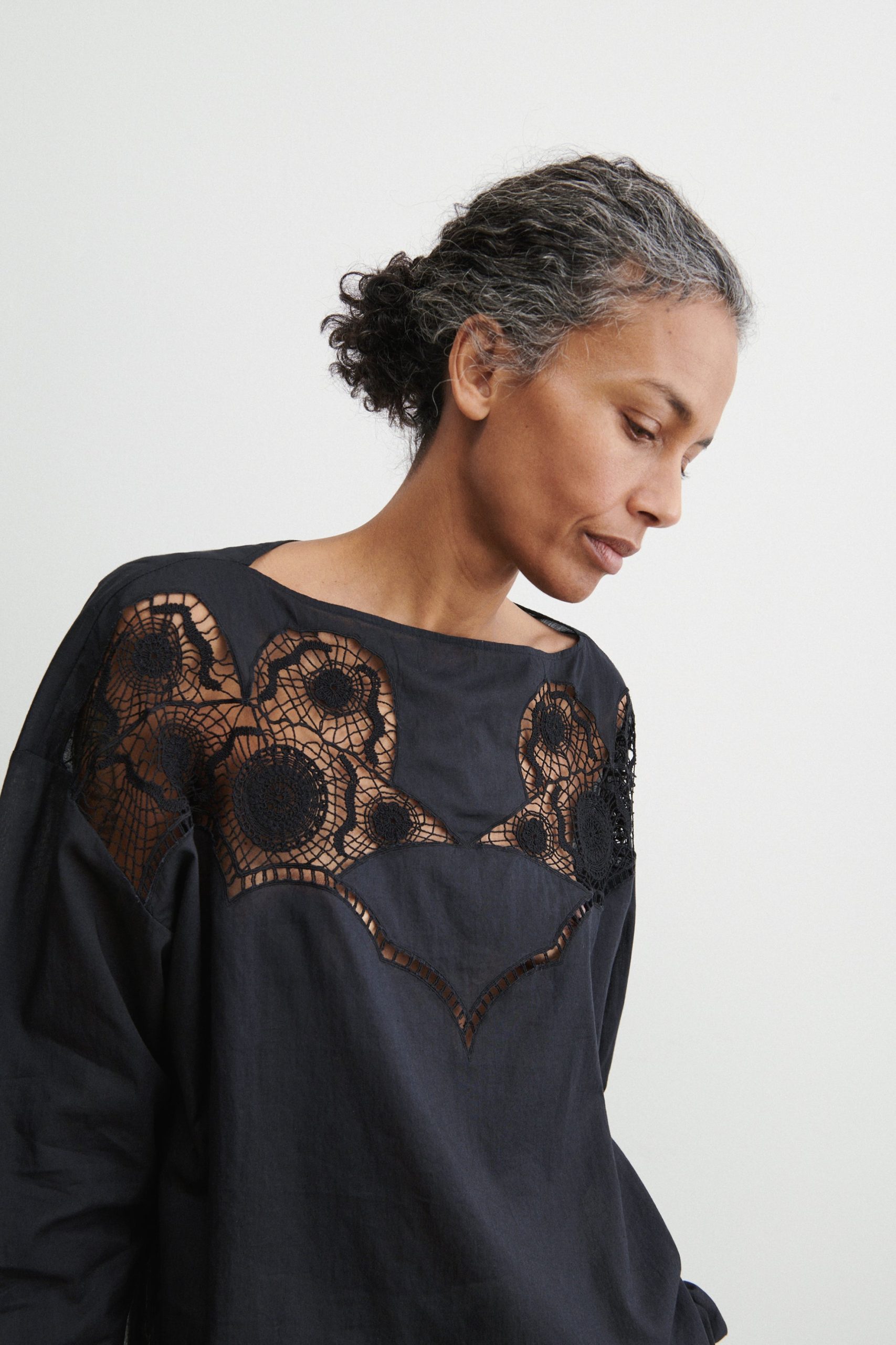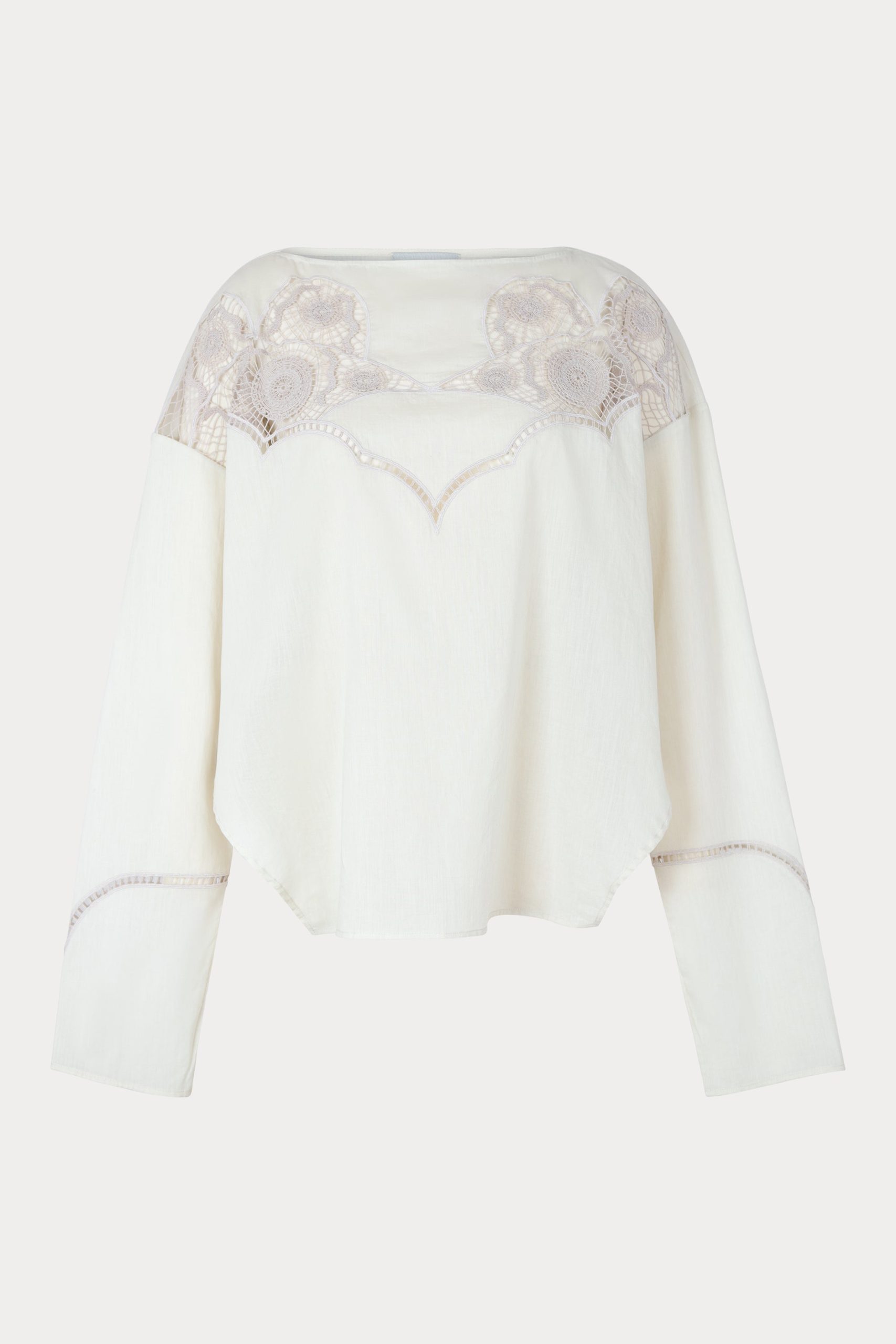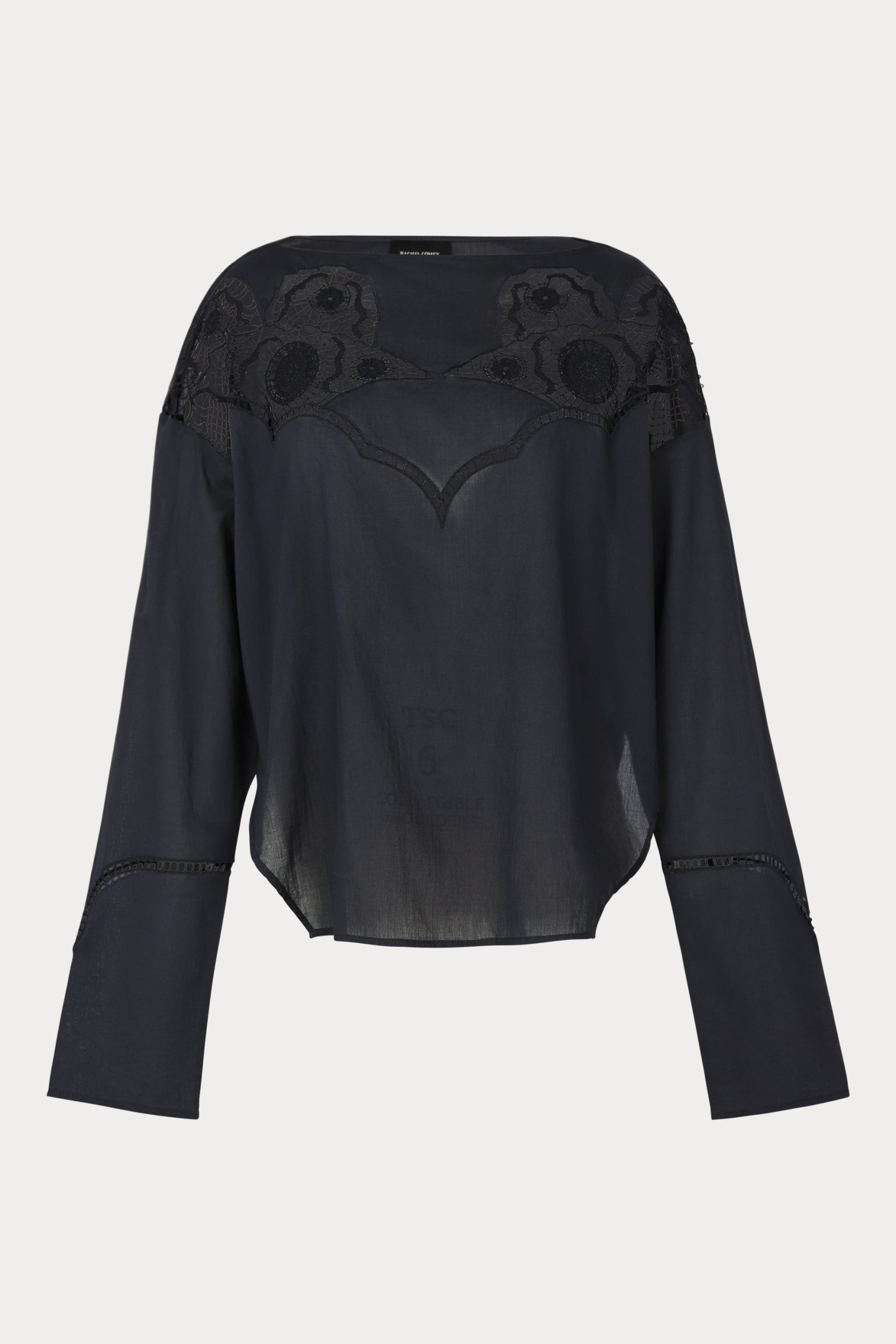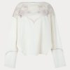Long sleeve boat neck top with drop shoulders and embroidered lace details.