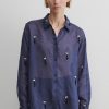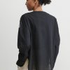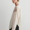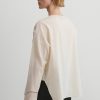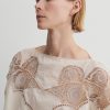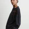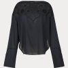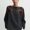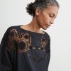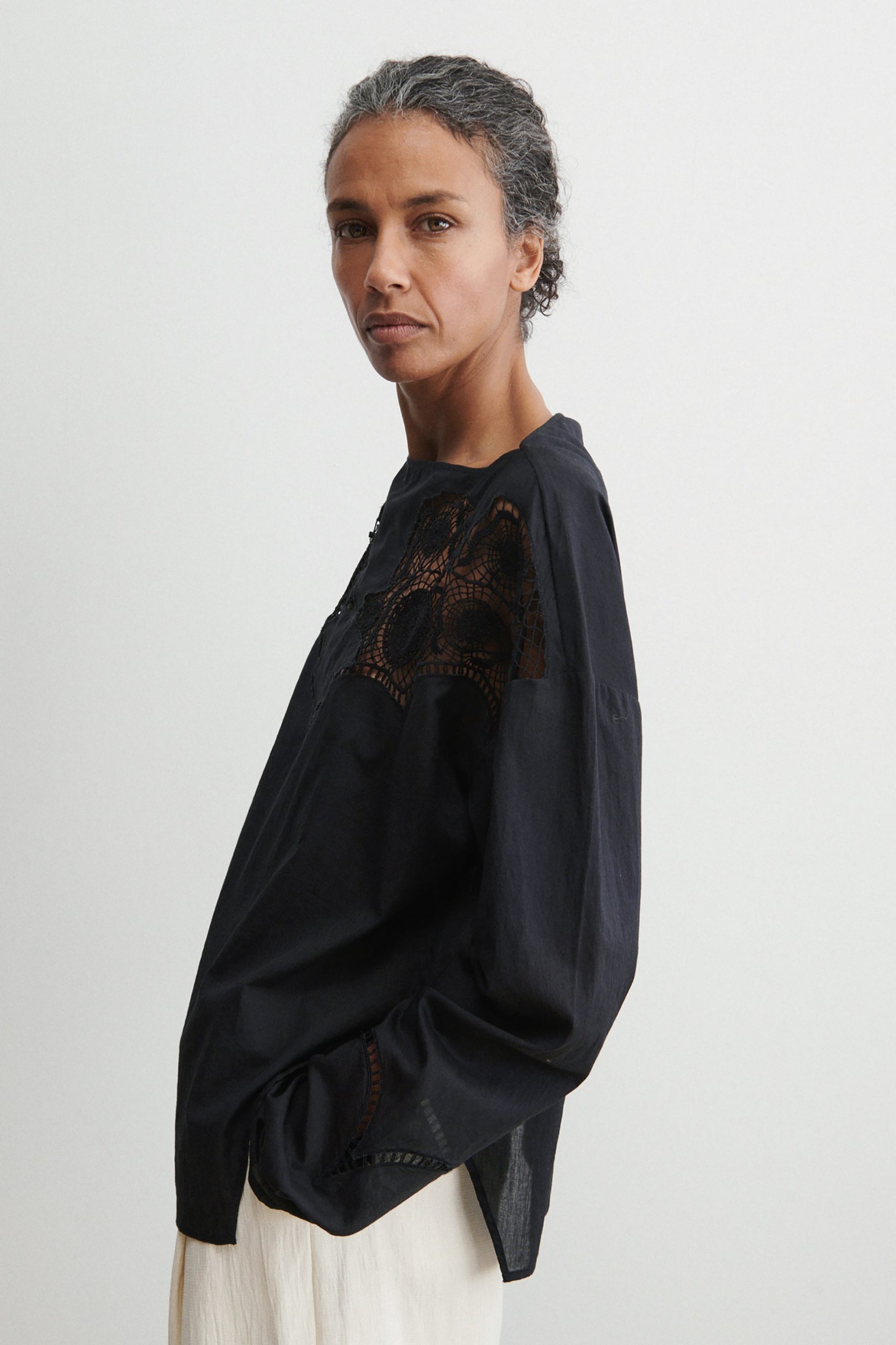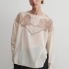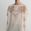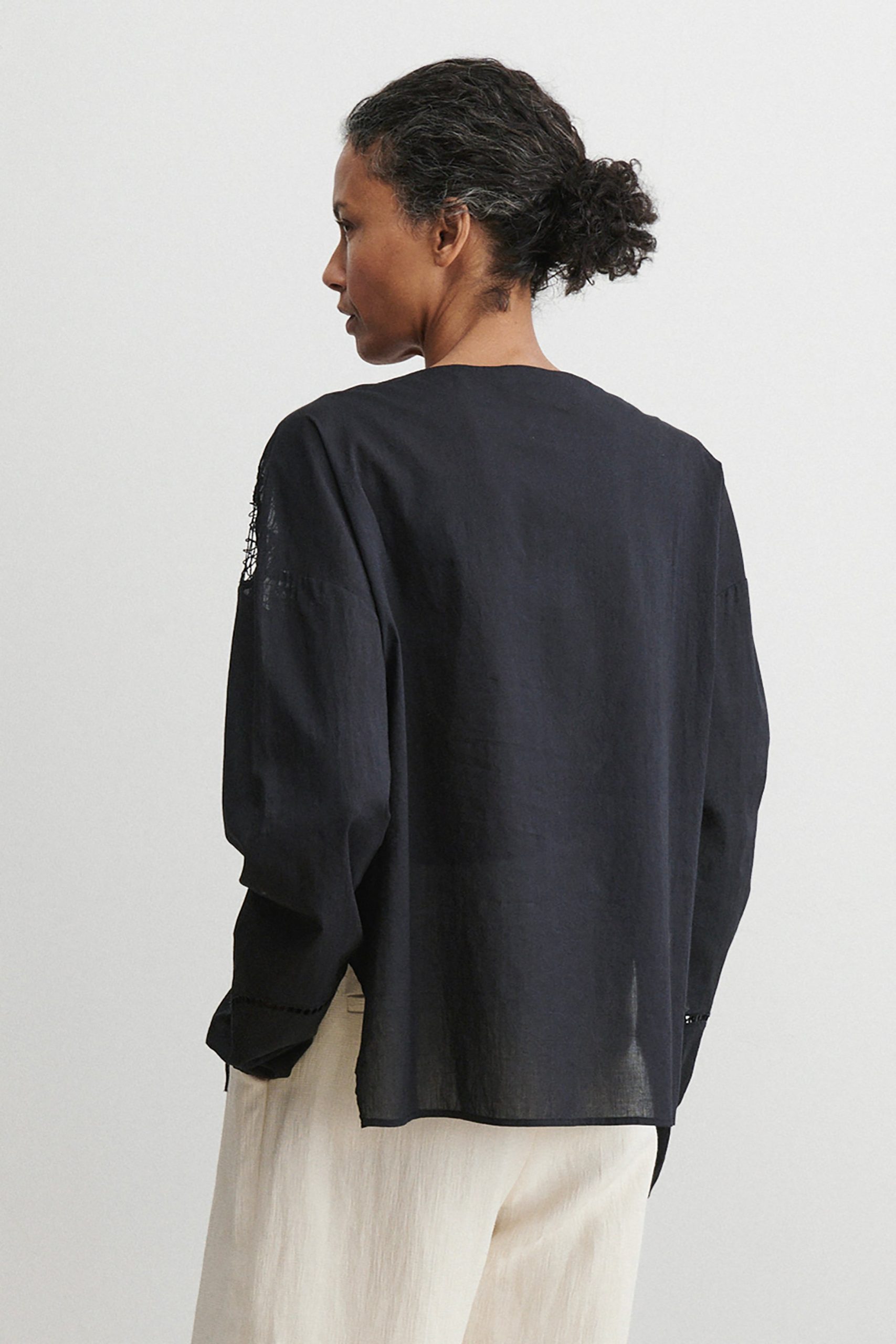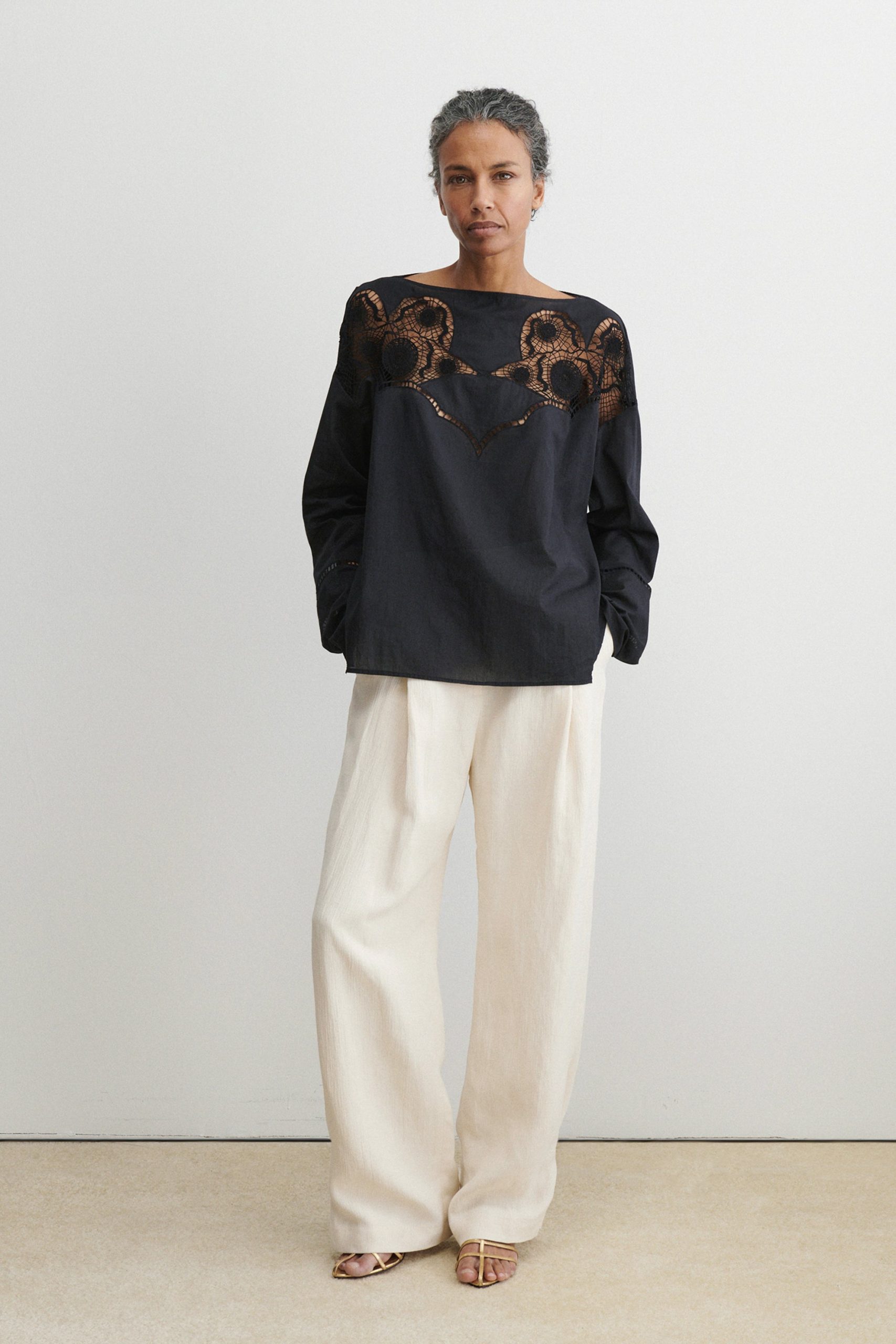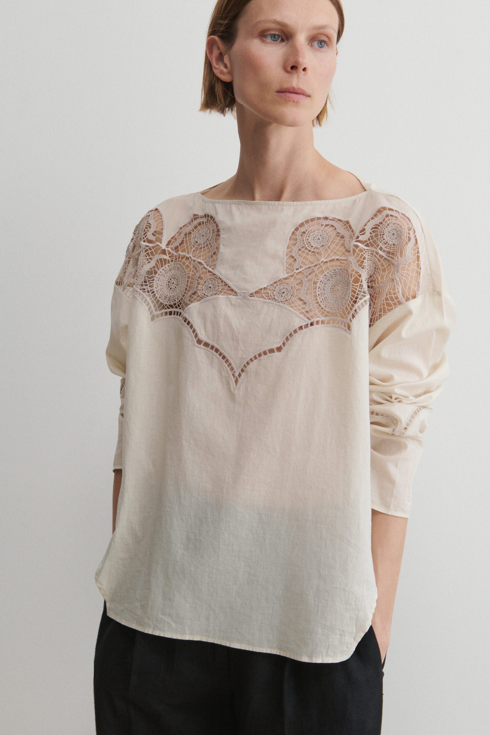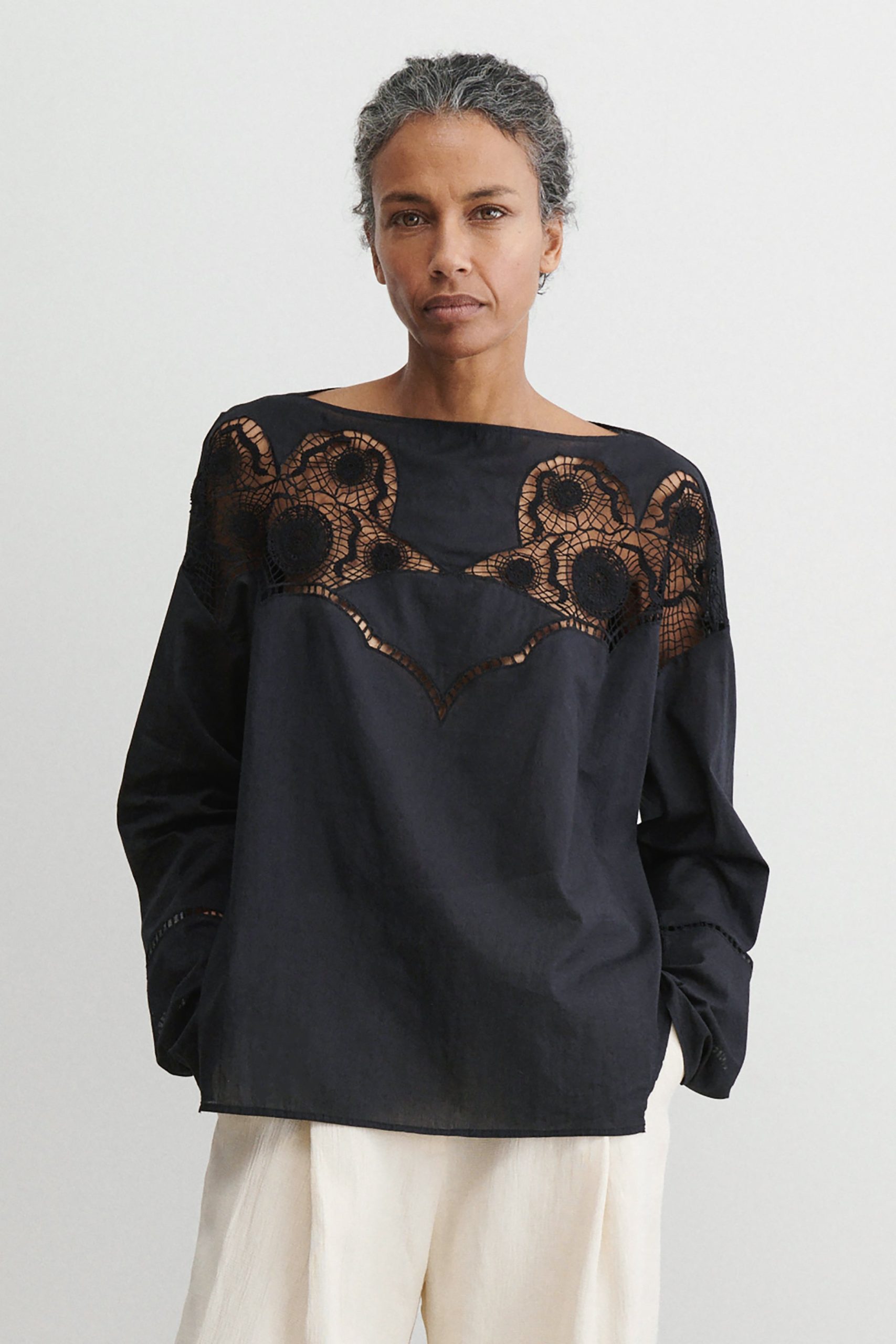 Long sleeve boat neck top with drop shoulders and embroidered lace details.