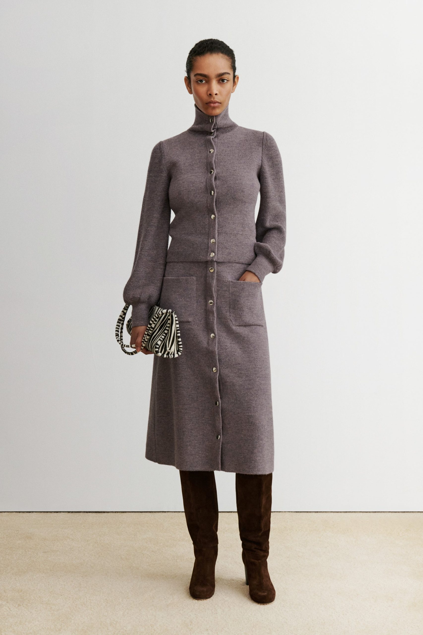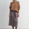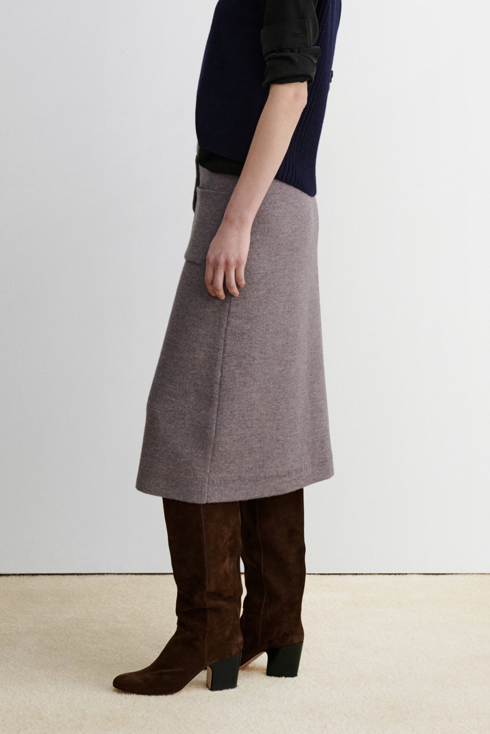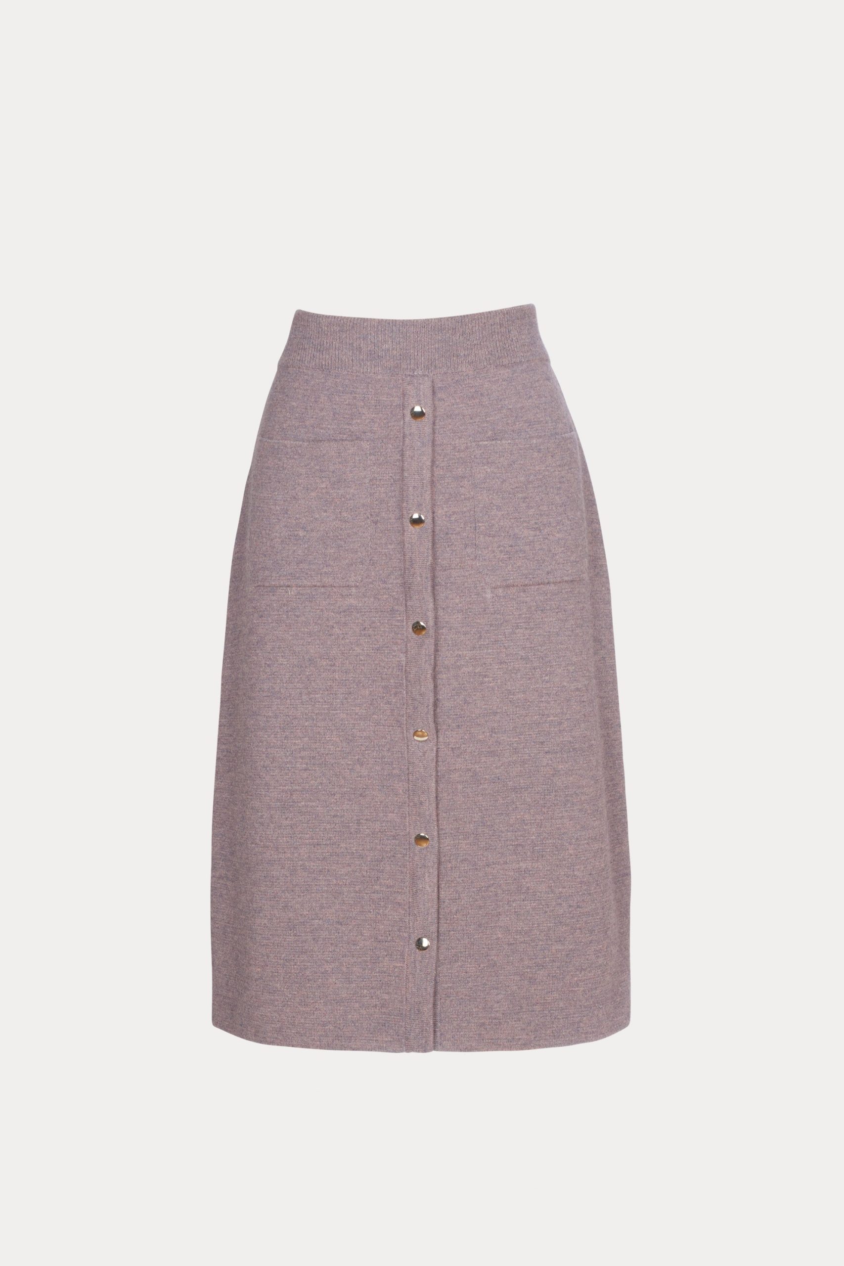 Pull on, high-waisted, A-line skirt with sporty snap buttons and patch pockets, in our smooth, polished Cria knit, which spins soft baby alpaca into a compact Milano stitch. The first few snaps are fixed to prevent gaping. Pairs with the matching Abe Jacket.