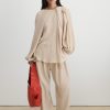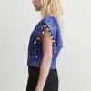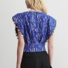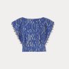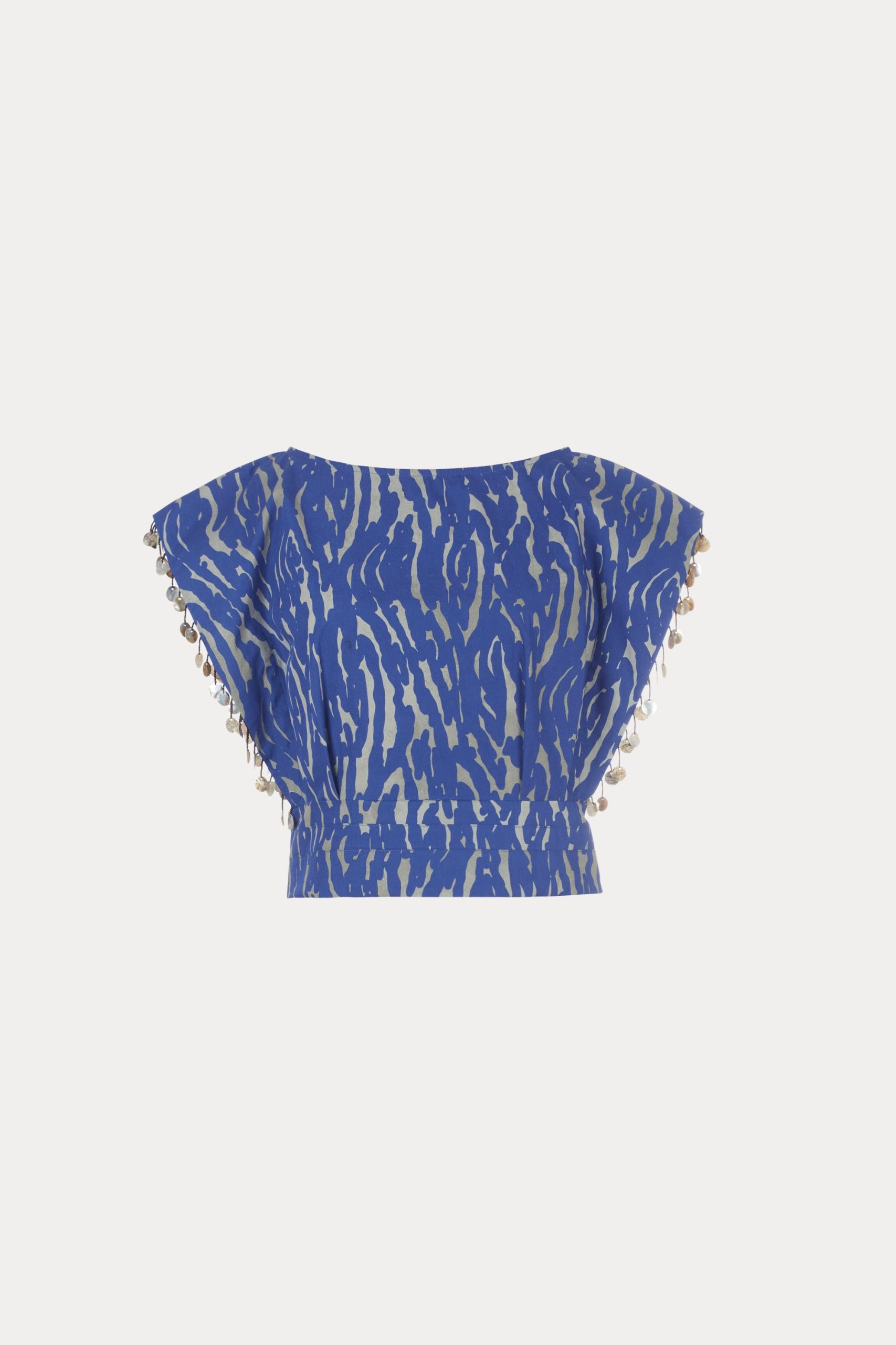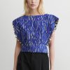 Sleeveless top cut from our exclusive Tiikeri print cotton. Features a boat neckline and exaggerated cap sleeves that create a structured, angular shoulder silhouette. The back button closure and double-layered waistband offer a tailored fit.