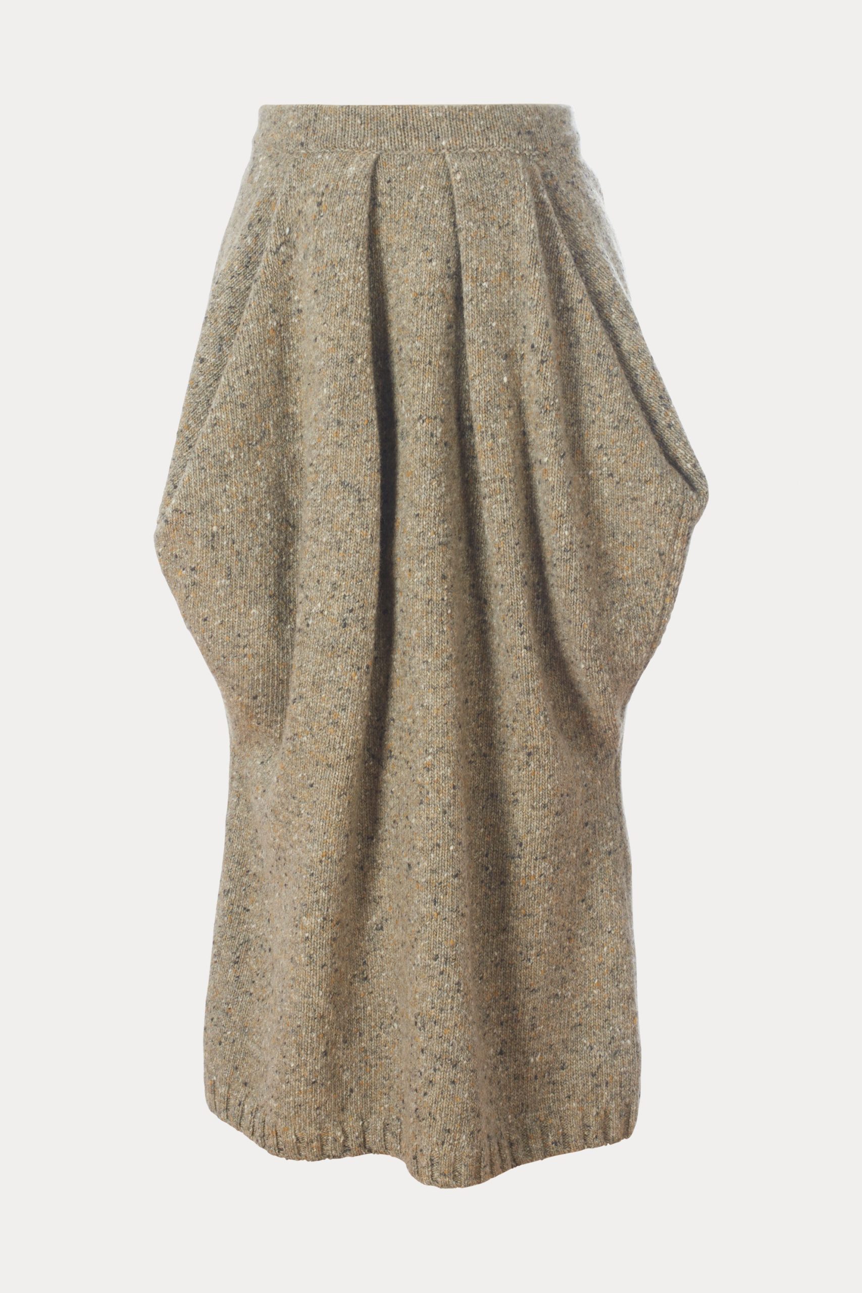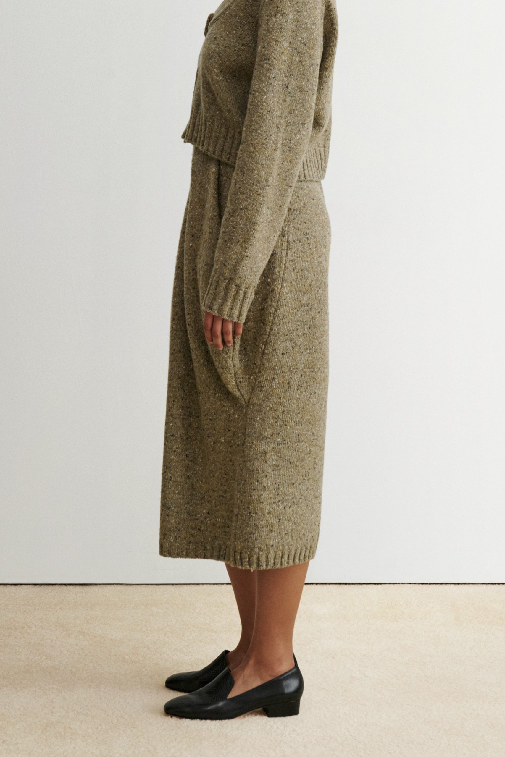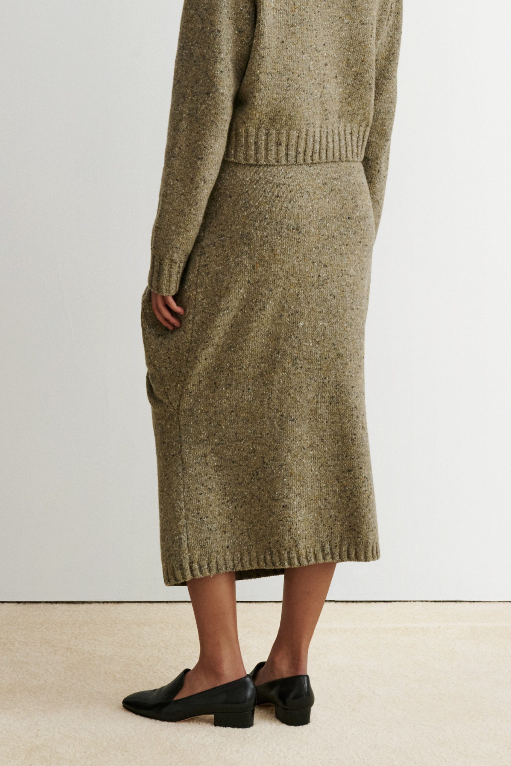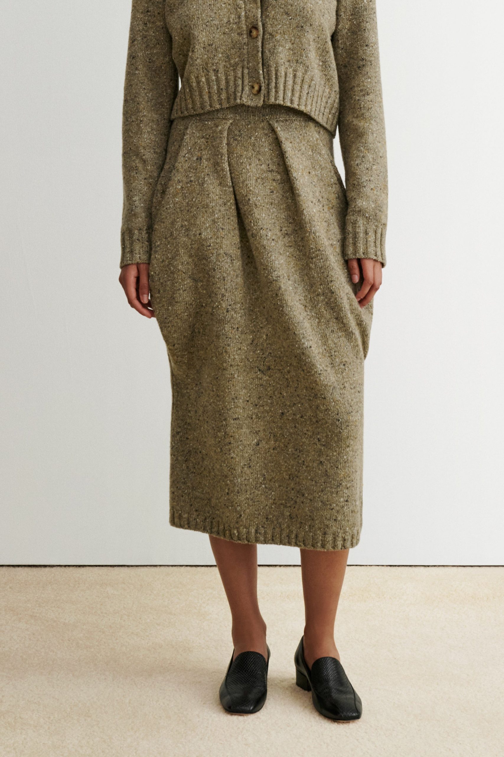 Long voluminous skirt knit in our Donegal knit, a tweed spun from responsibly sourced Merino wool. Features front pockets and ribbed finishing. Style with Uridge Cardigan for a warm duo.