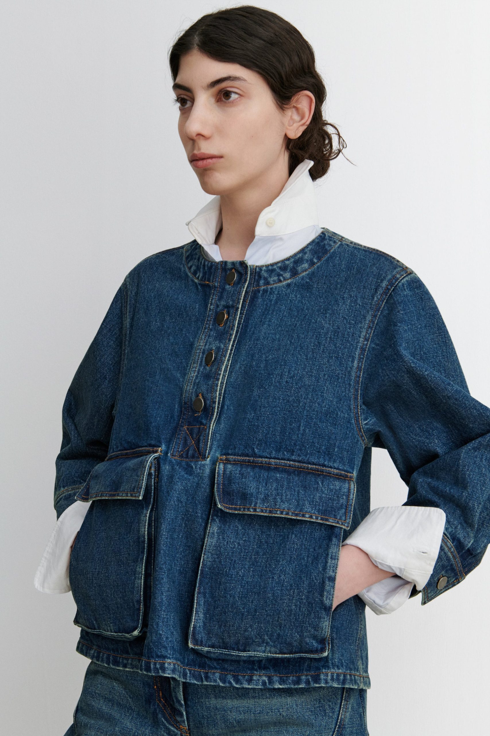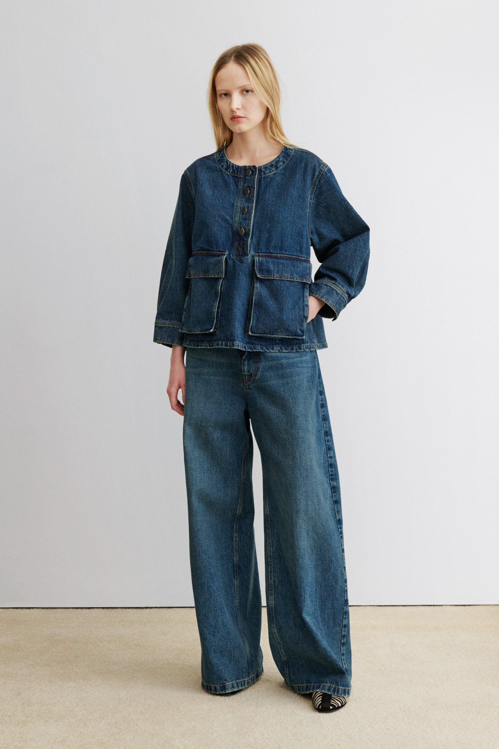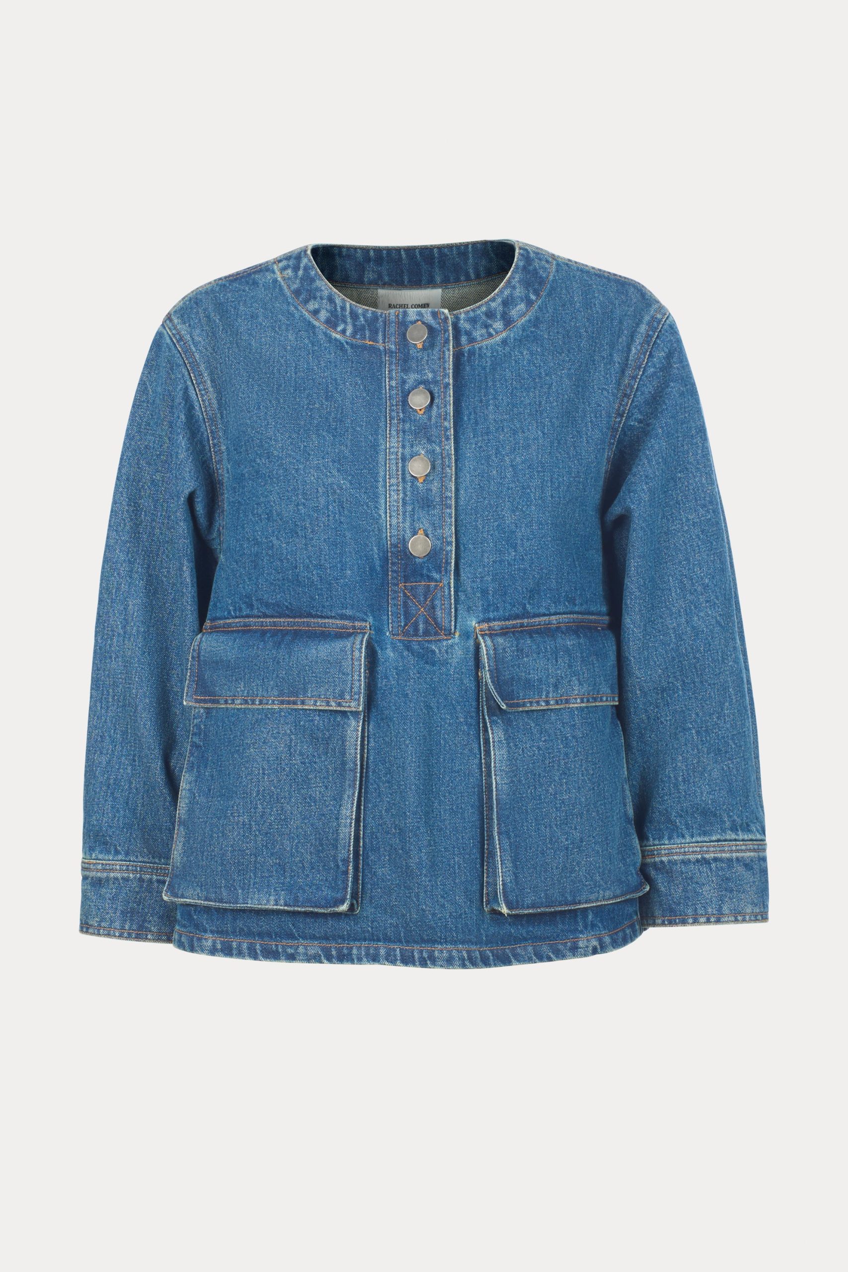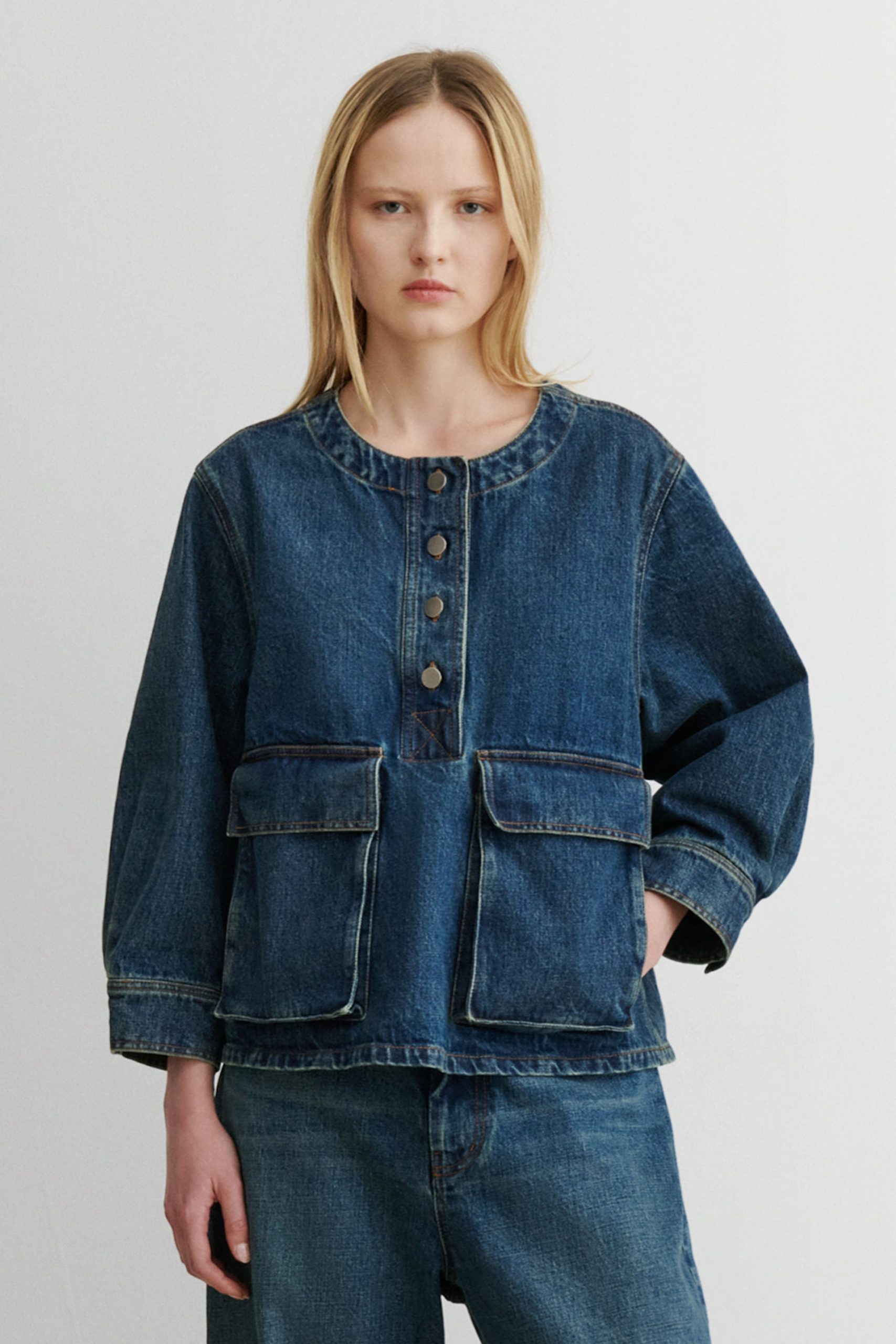 Structured 3/4-sleeve top with a round collar and half button-up, cut in aged indigo Mission Denim. Features two front carpenter-style patch pockets. Our denim collection is made in Los Angeles using premium Japanese denim. Each style is crafted in limited quantities in partnership with small, family-run factories.