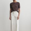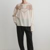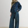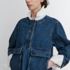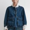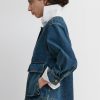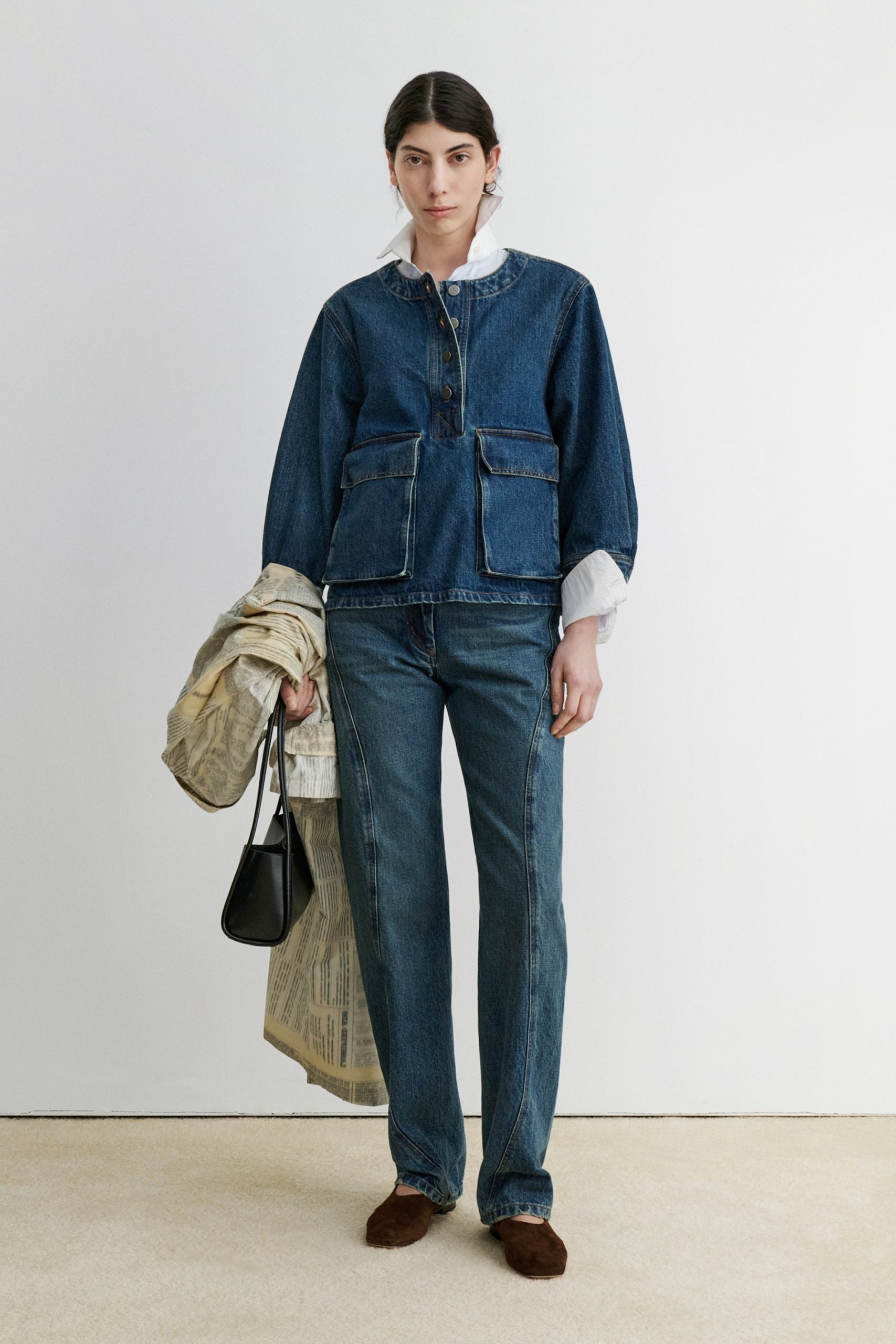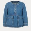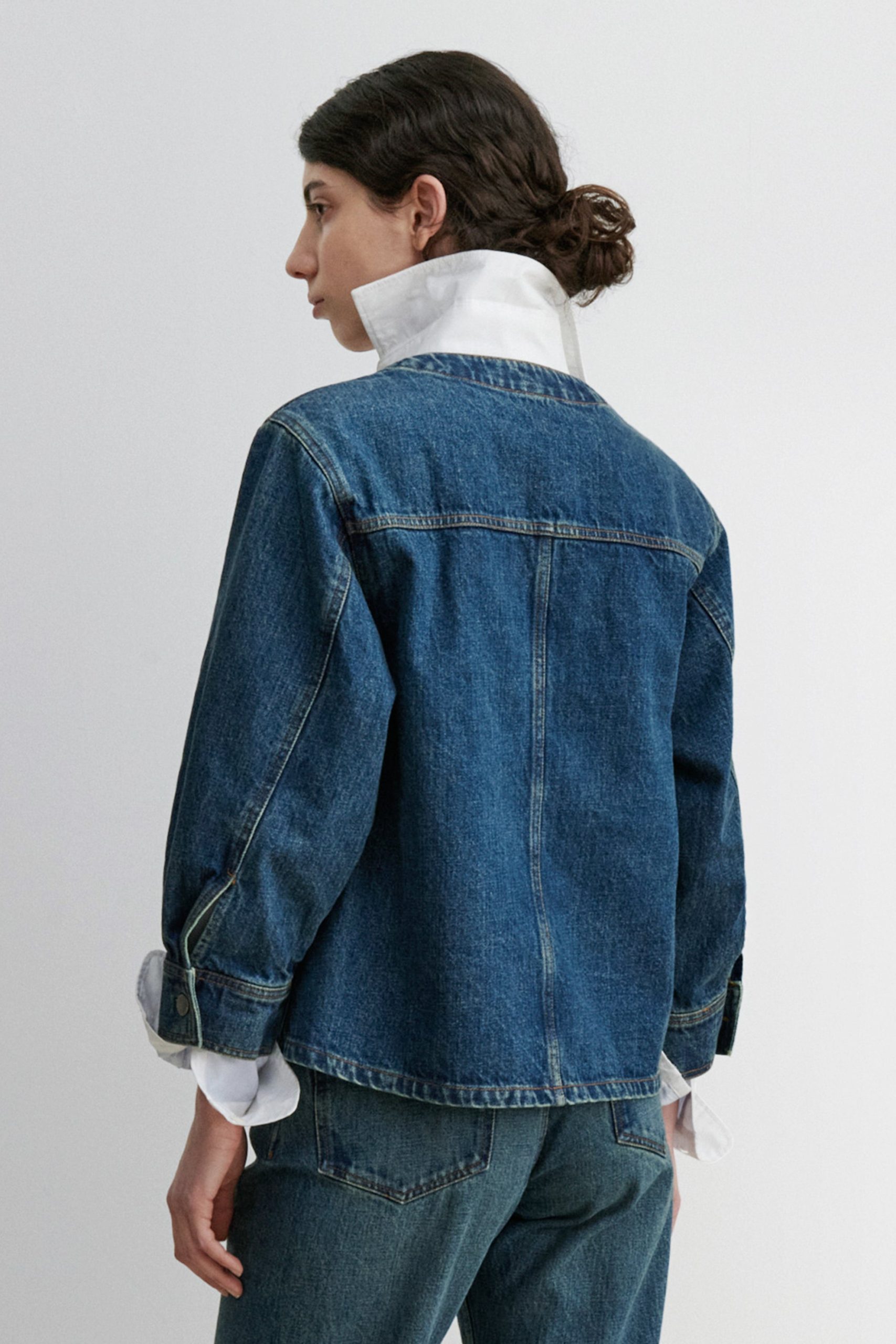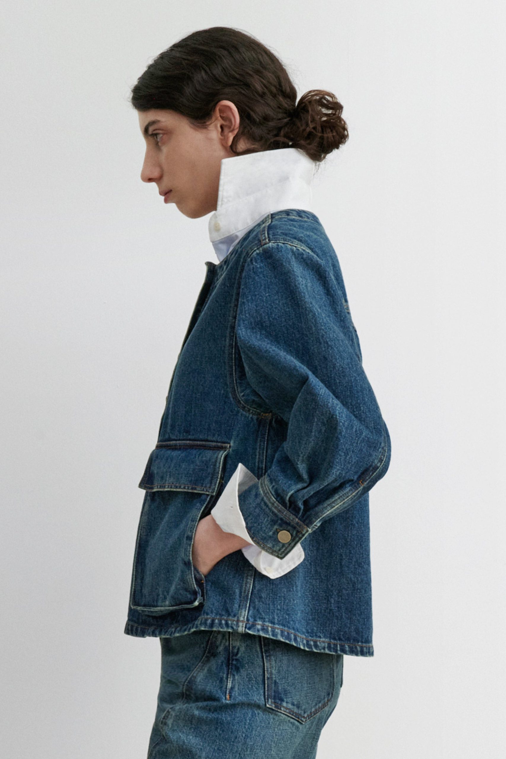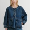Structured 3/4-sleeve top with a round collar and half button-up, cut in aged indigo Mission Denim. Features two front carpenter-style patch pockets. Our denim collection is made in Los Angeles using premium Japanese denim. Each style is crafted in limited quantities in partnership with small, family-run factories.