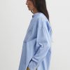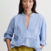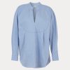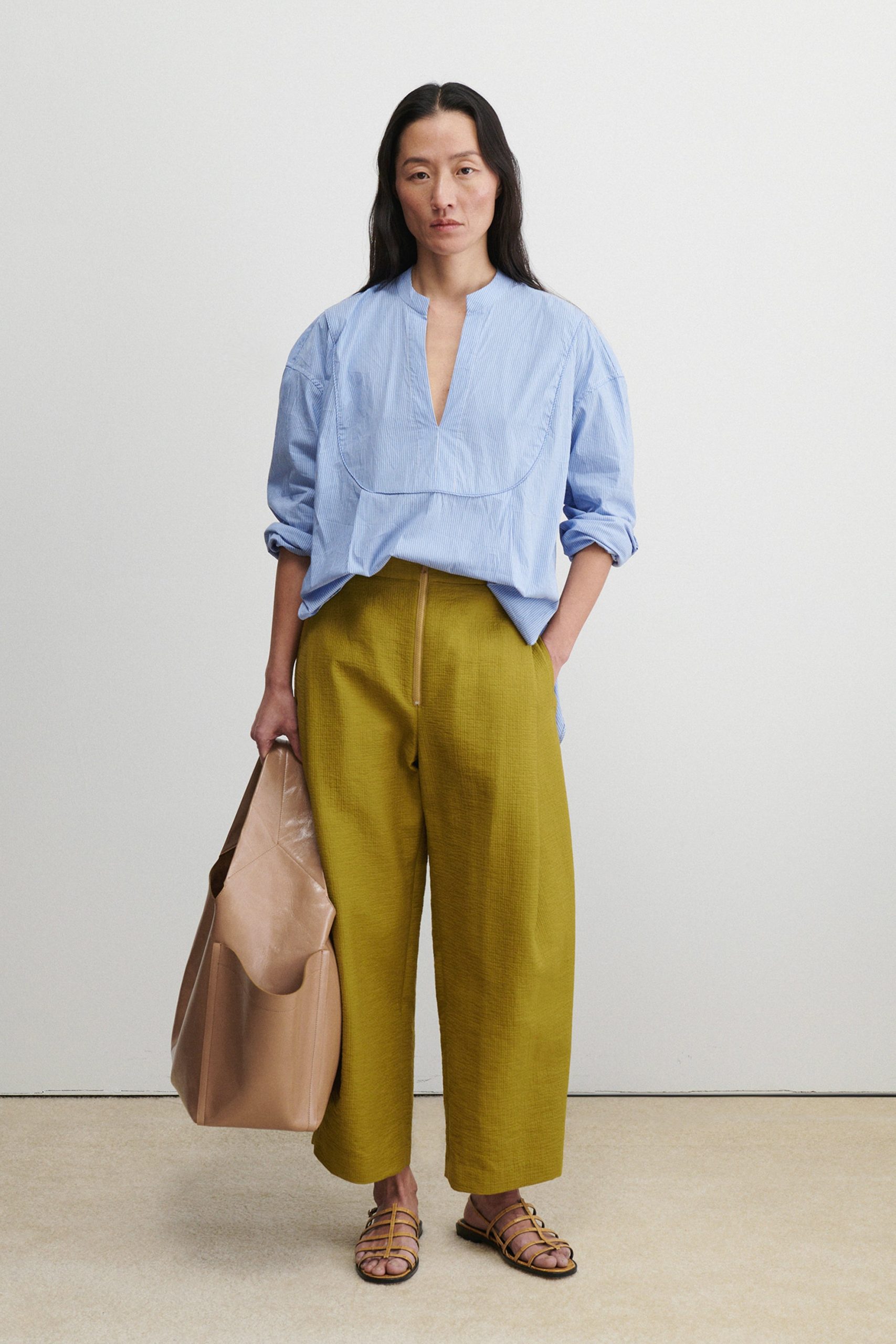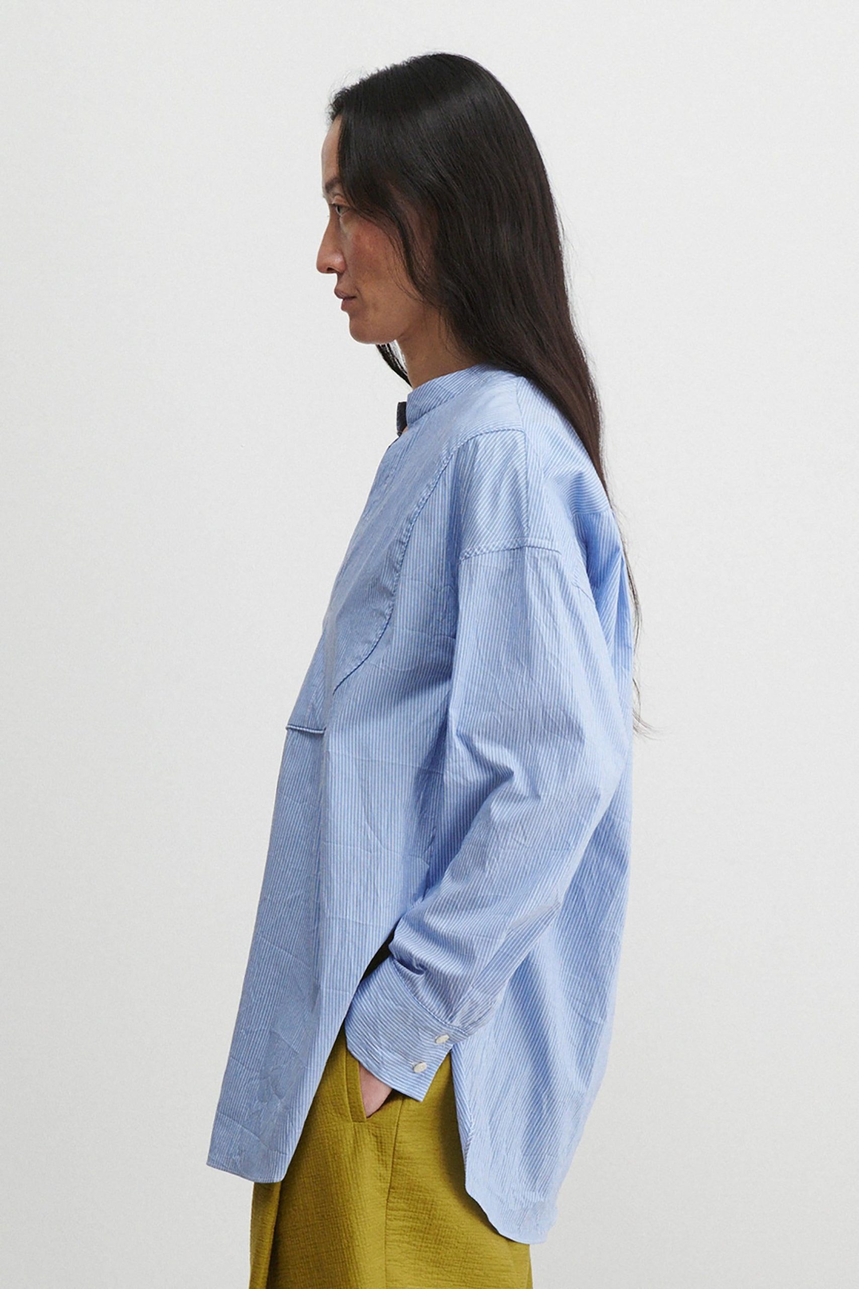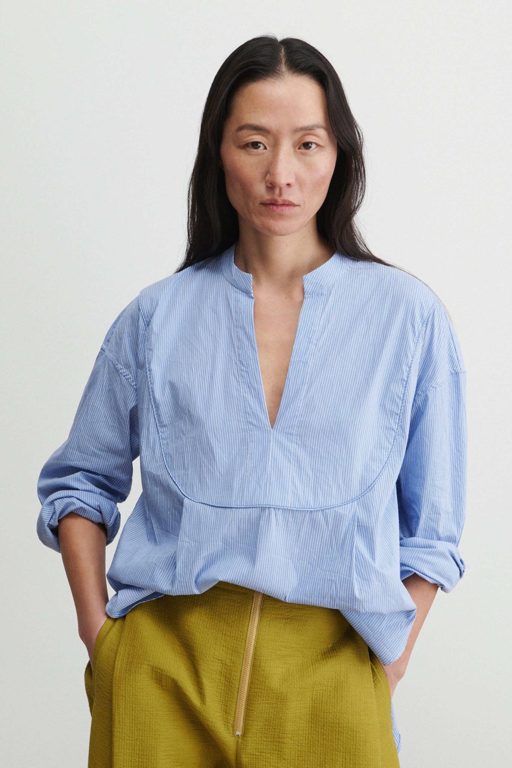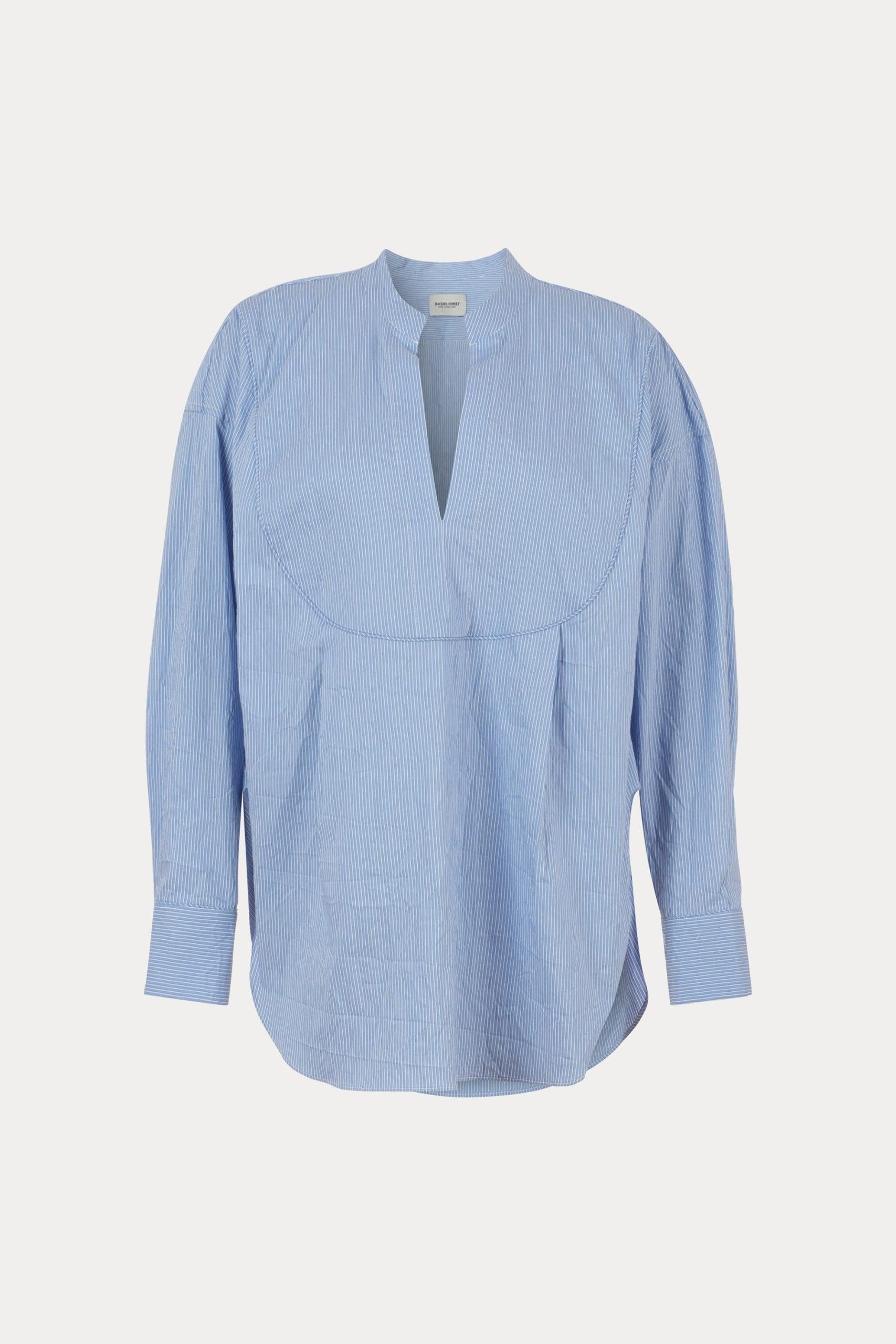 Long-sleeve, relaxed-fit tuxedo bib shirt with V-neck and tab collar, in our new, lightweight Crinkle Stripe, crafted from a cotton blend.