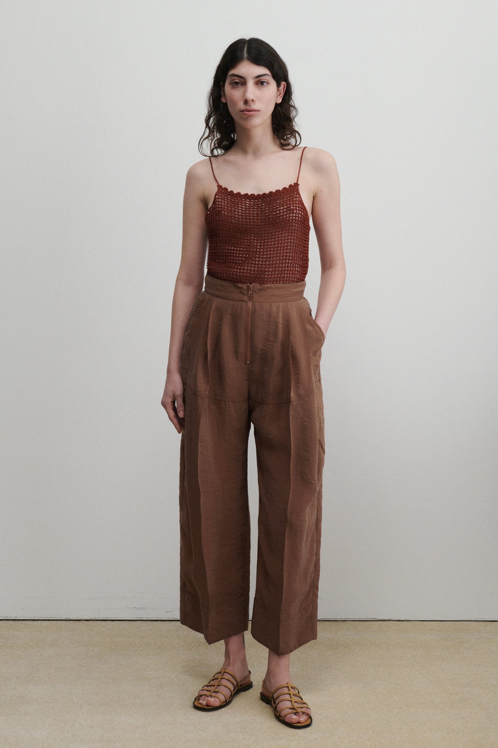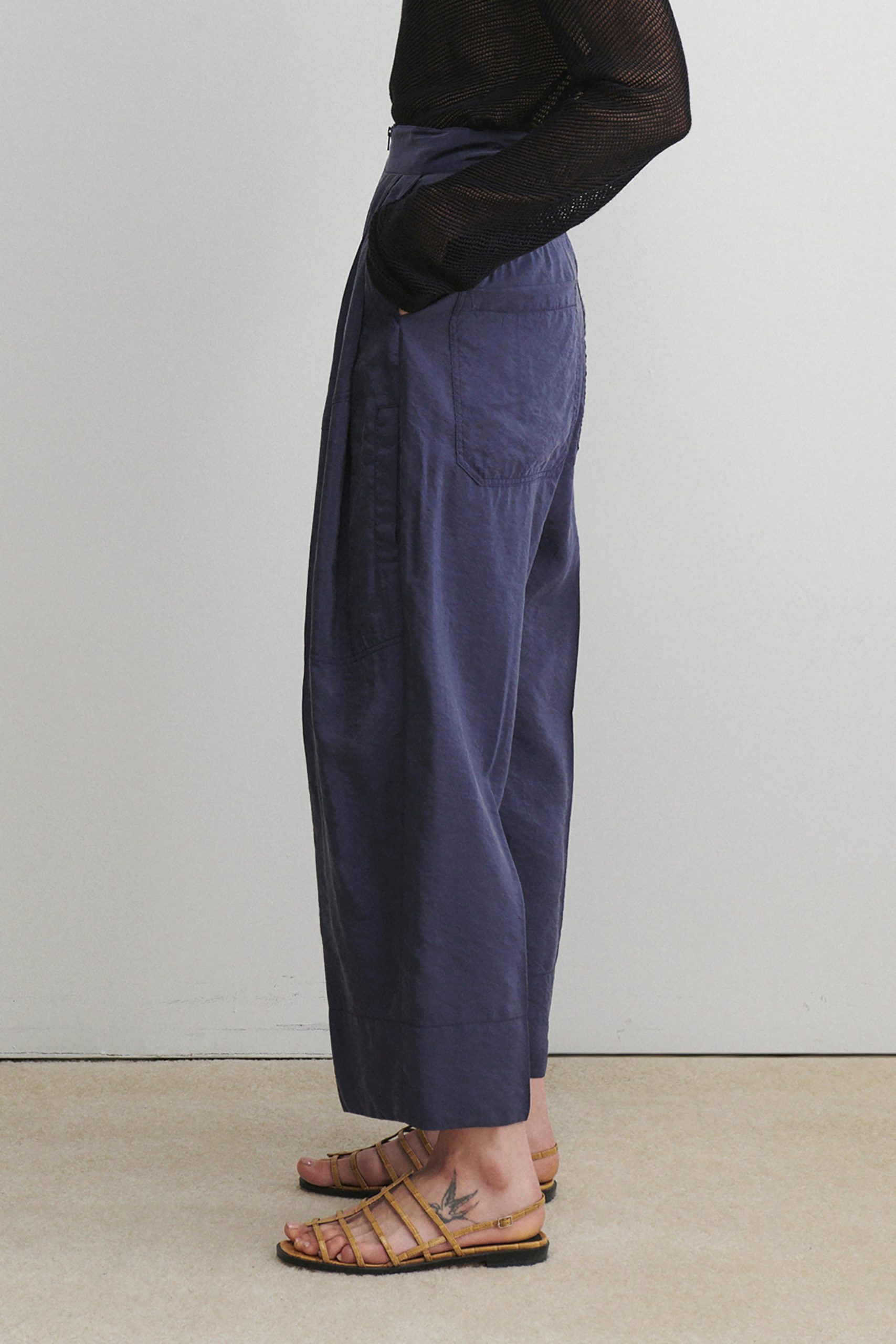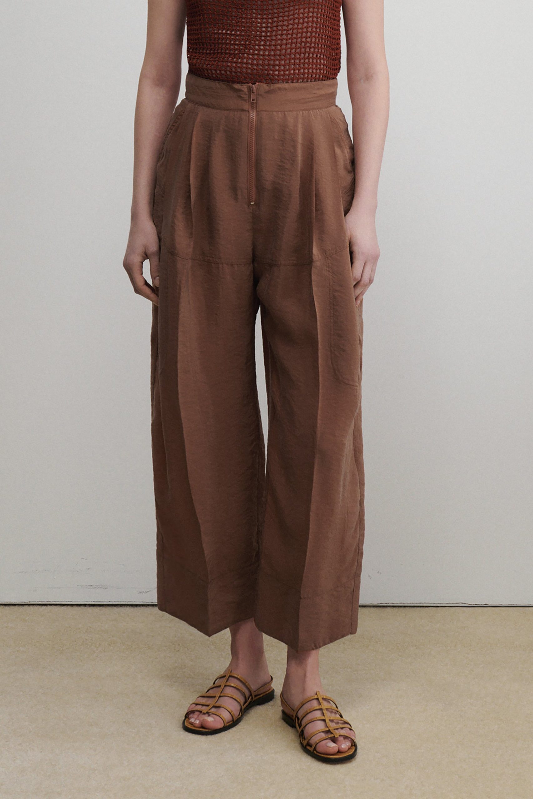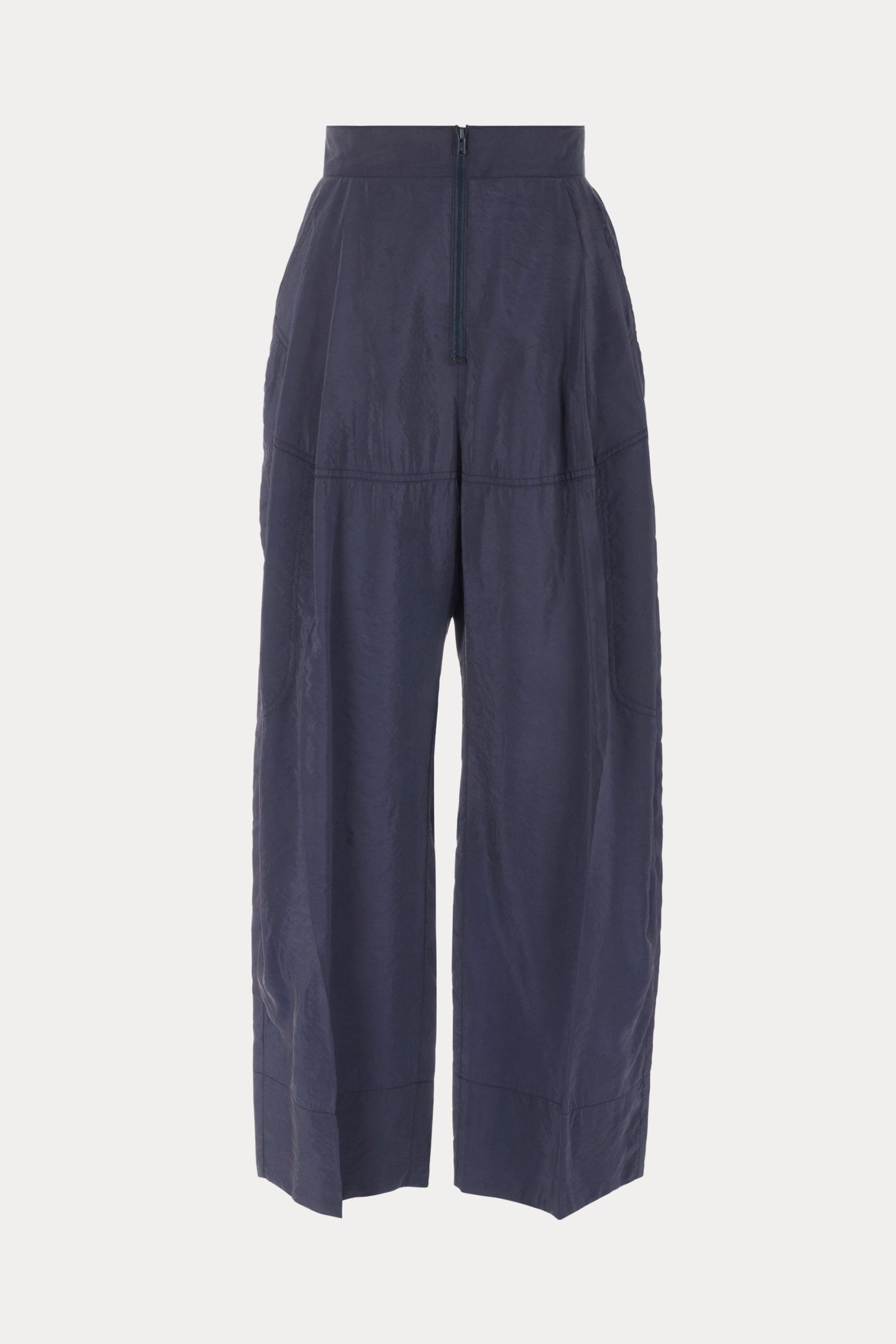 Pleated high-waist pant with exposed tonal zipper, in our lightweight, wrinkle-resistant Poppy cupro fabric, with a crisp hand feel and soft pebble texture–perfect for packing. Wear with the matching Kilo Trench for a coordinated look.