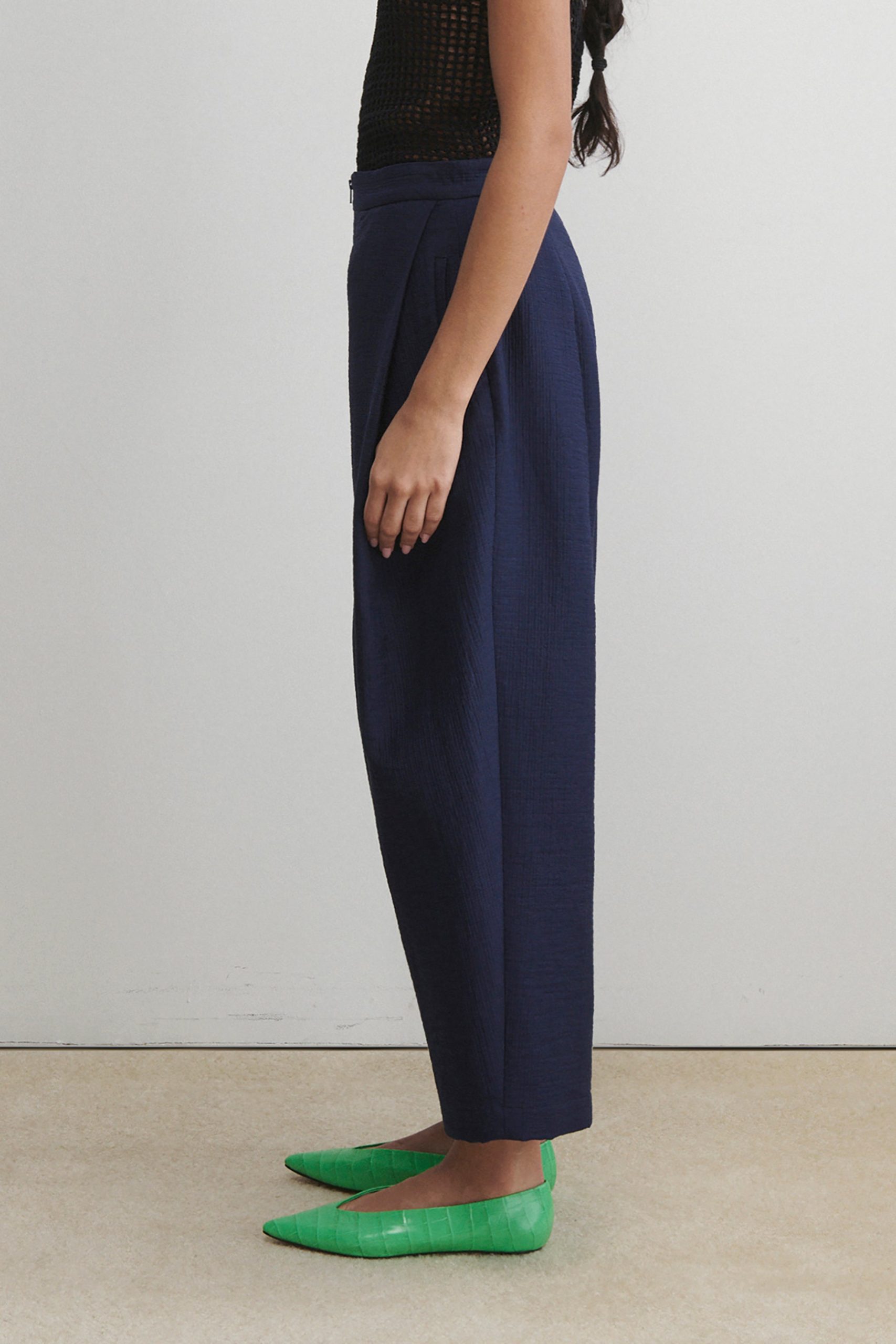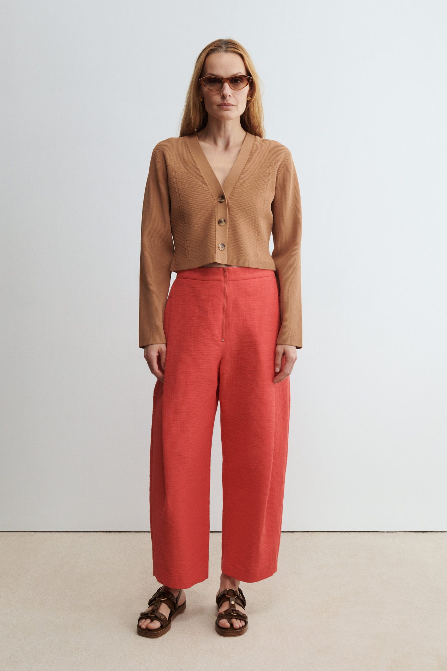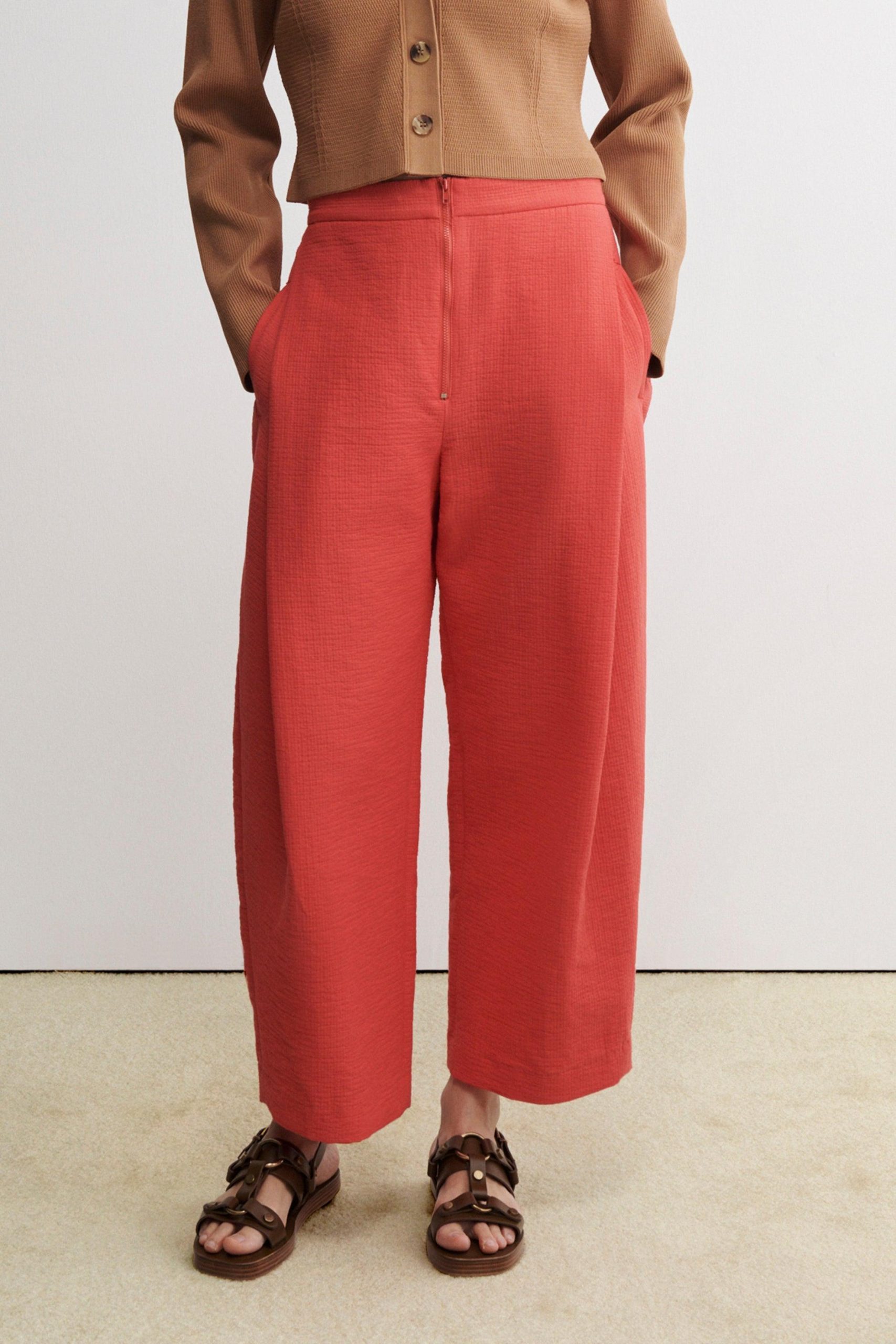 Cropped, pleat-front pants with an exposed tonal zipper in our signature Italian Foam jacquard. The soft cocoon shape creates a feminine, hourglass silhouette. Pair with our matching Fenix Jacket.