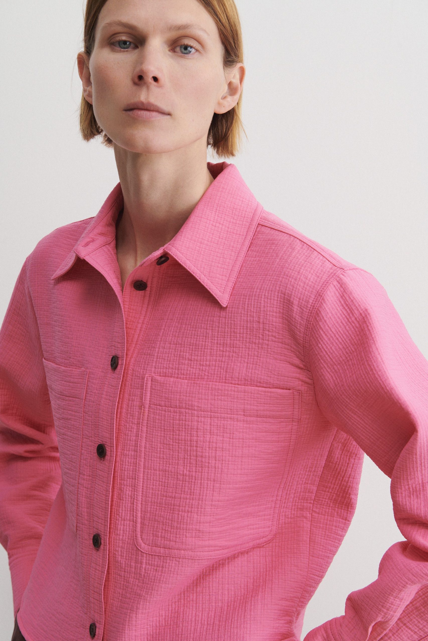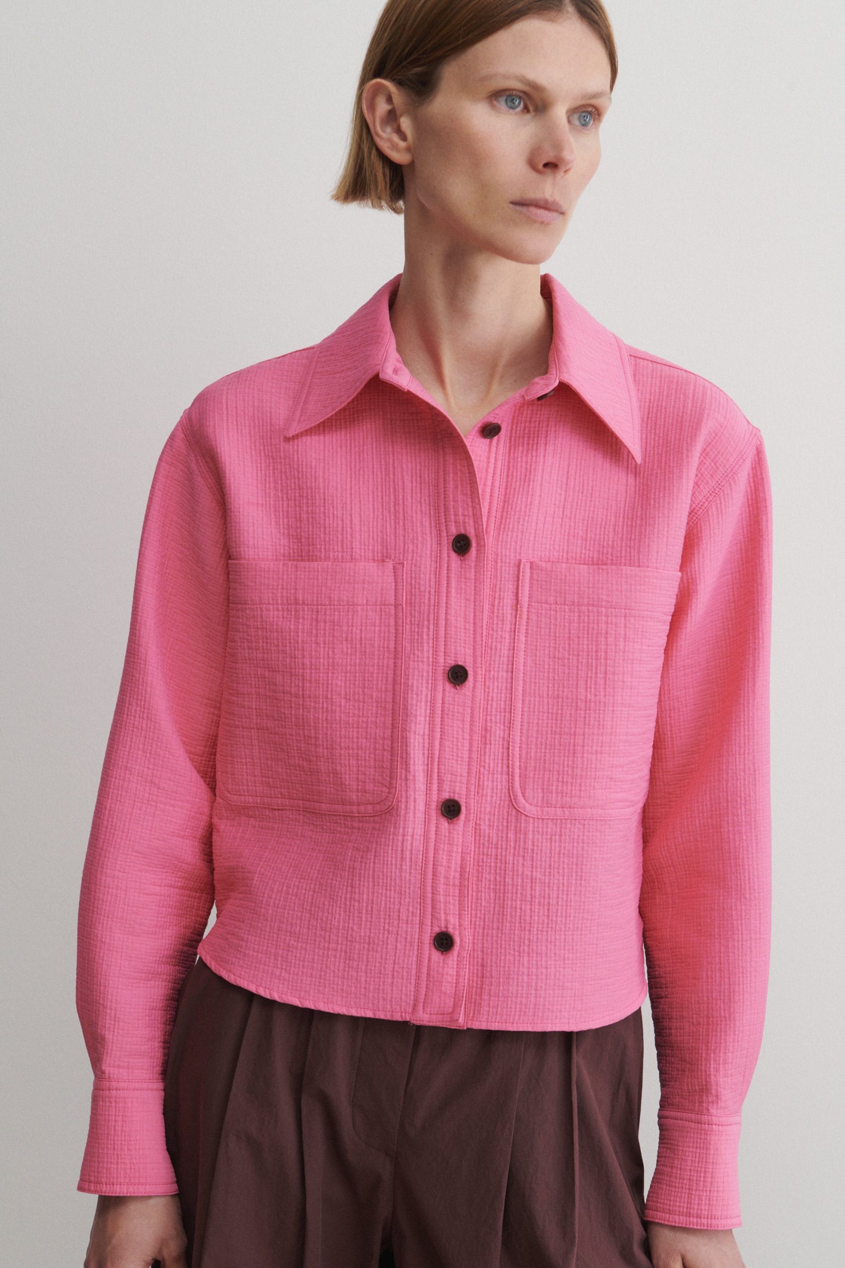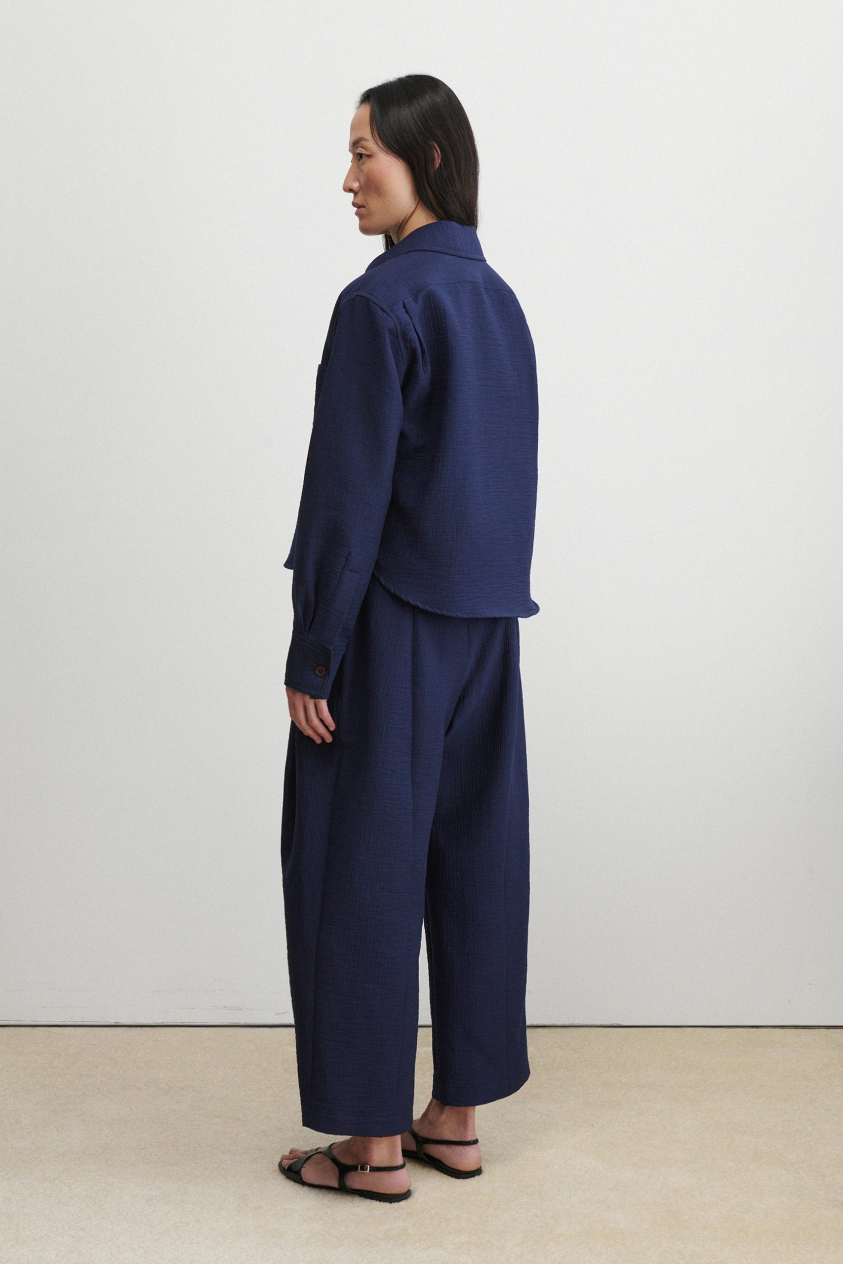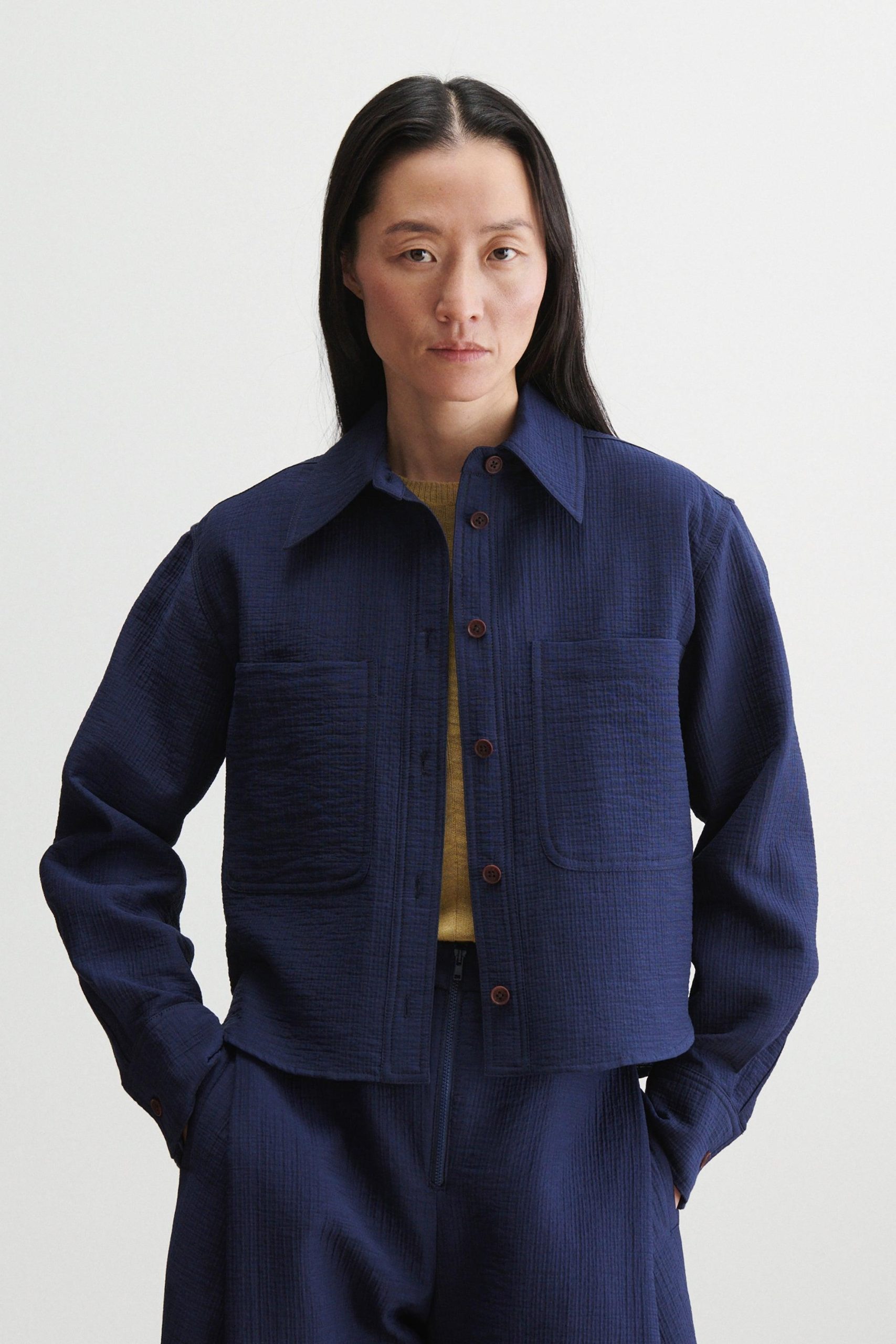 Short workwear-inspired shirt jacket with clean doubleface construction, cut from our signature Foam cotton. Lightweight yet warm. Looks great with the matching Dixon Culotte.
