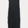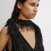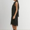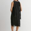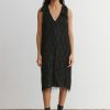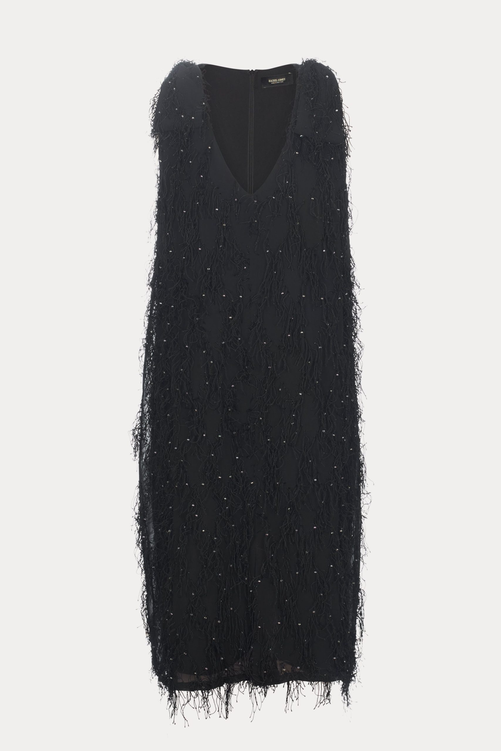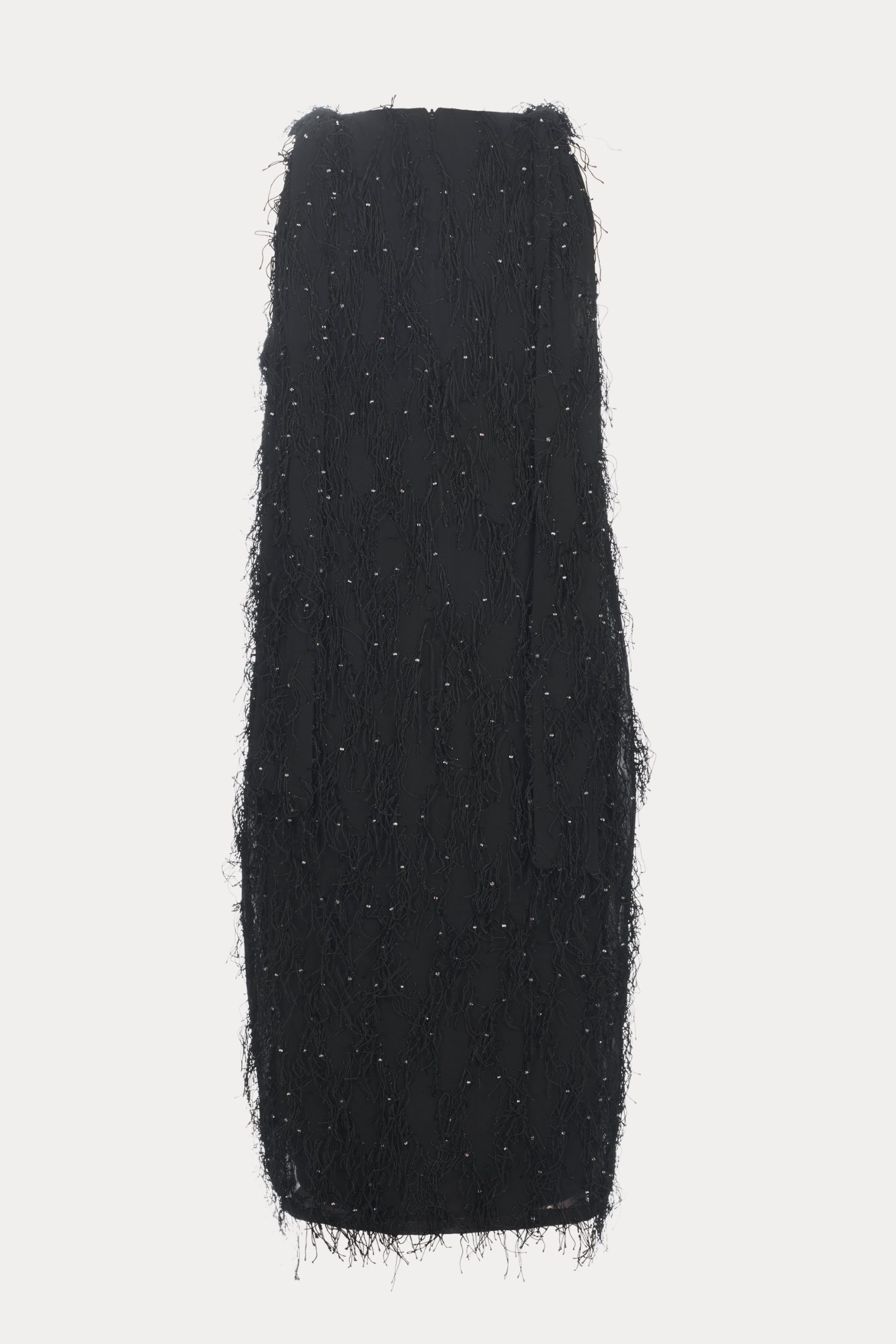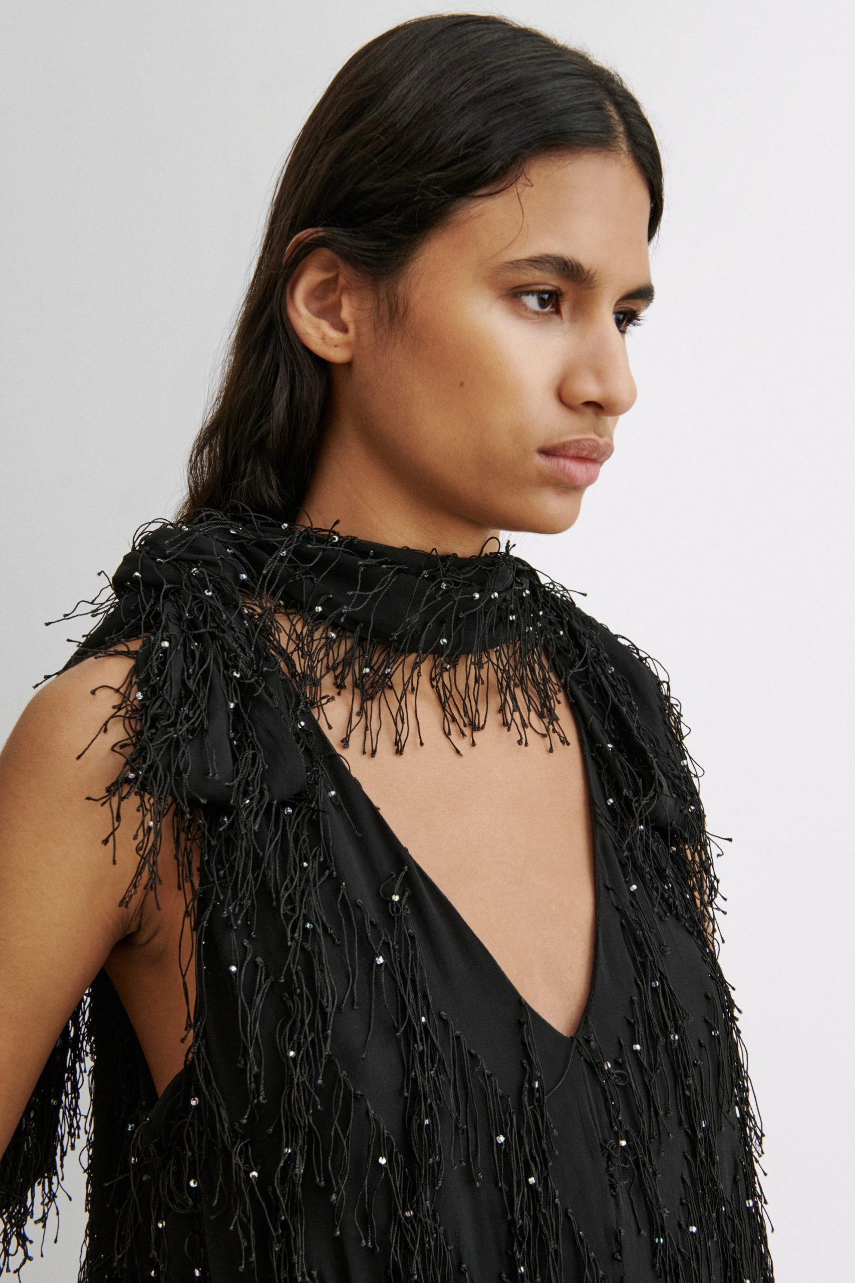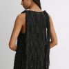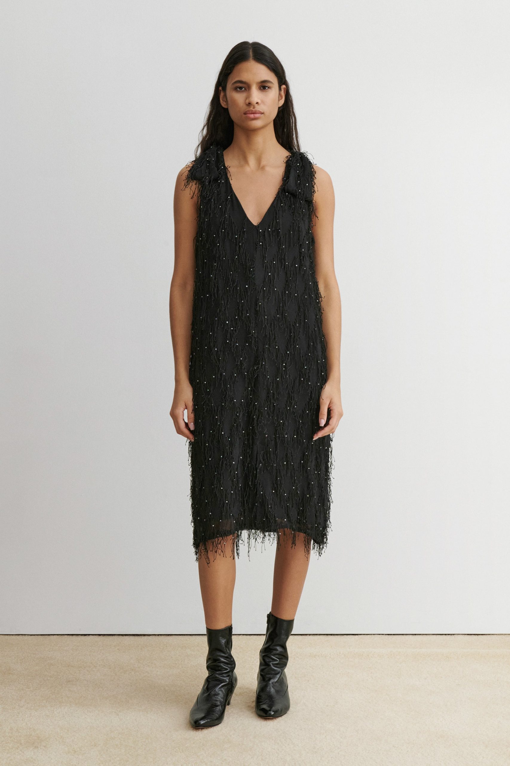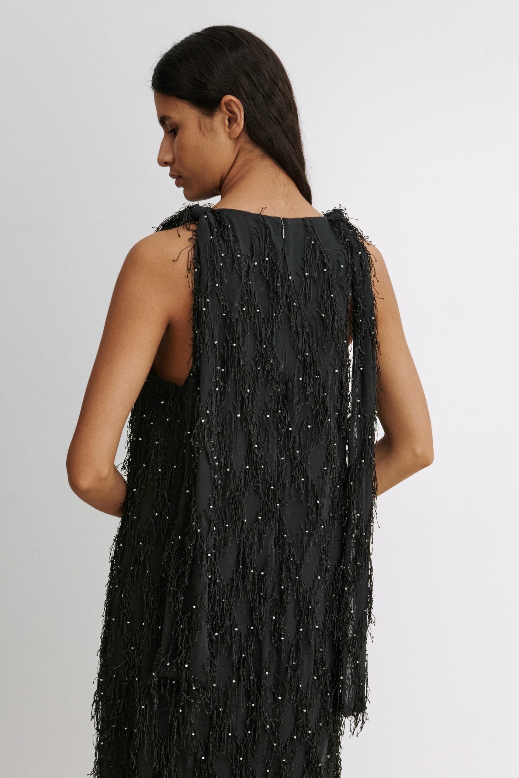 Sleeveless v-neck dress with thin fringe embellishments throughout for added texture and movement. Designed with a long straps that can be draped around the neck, mid-length cut, and relaxed silhouette. Concealed zipper at back.