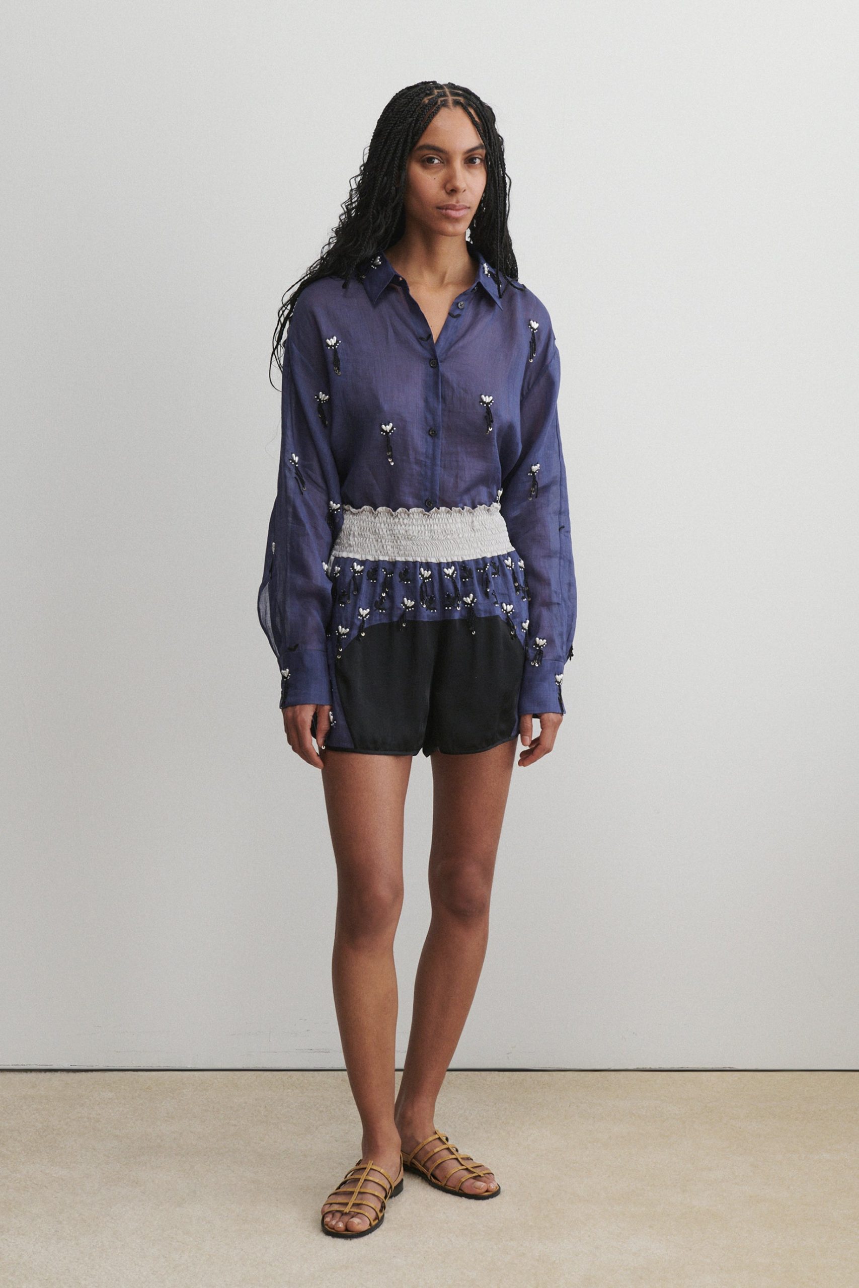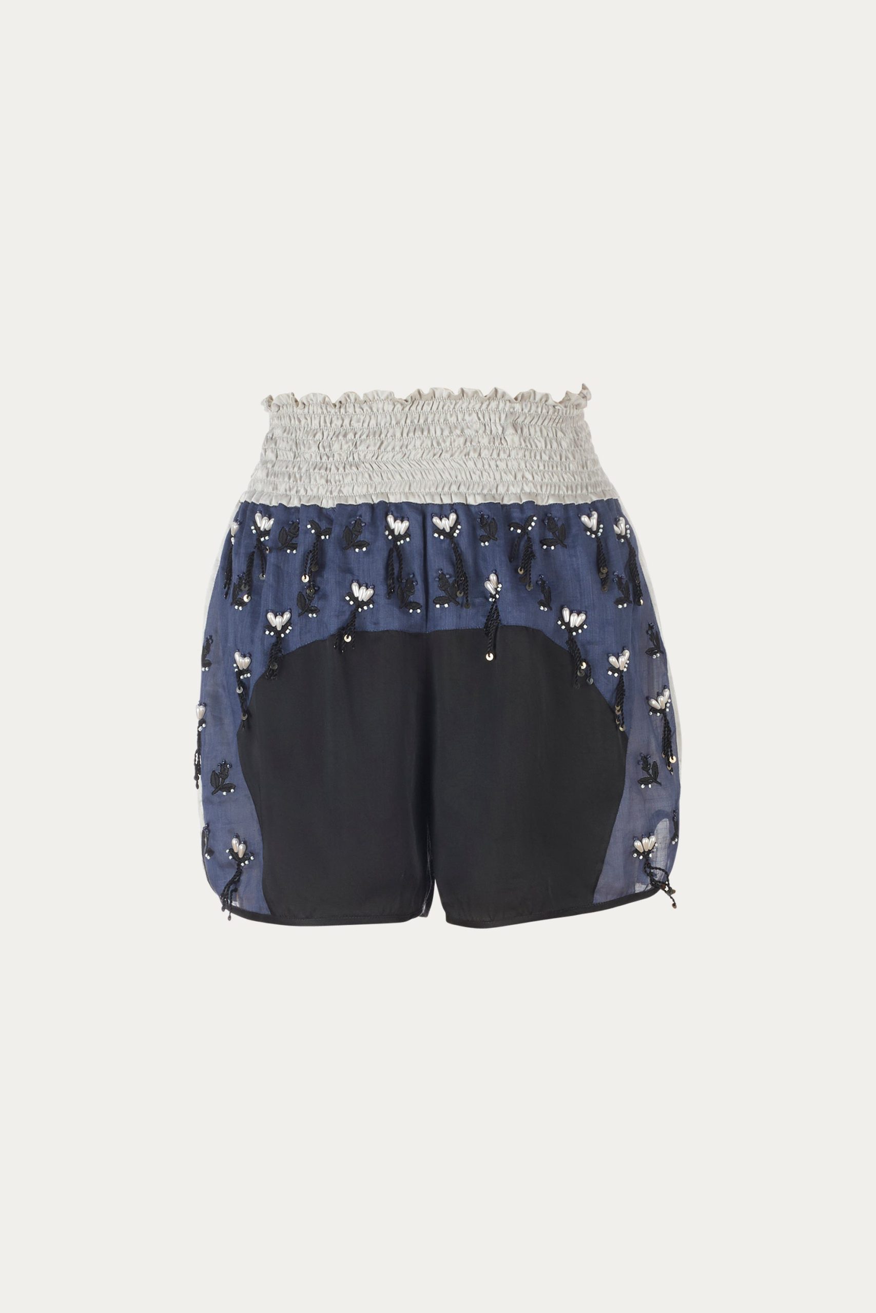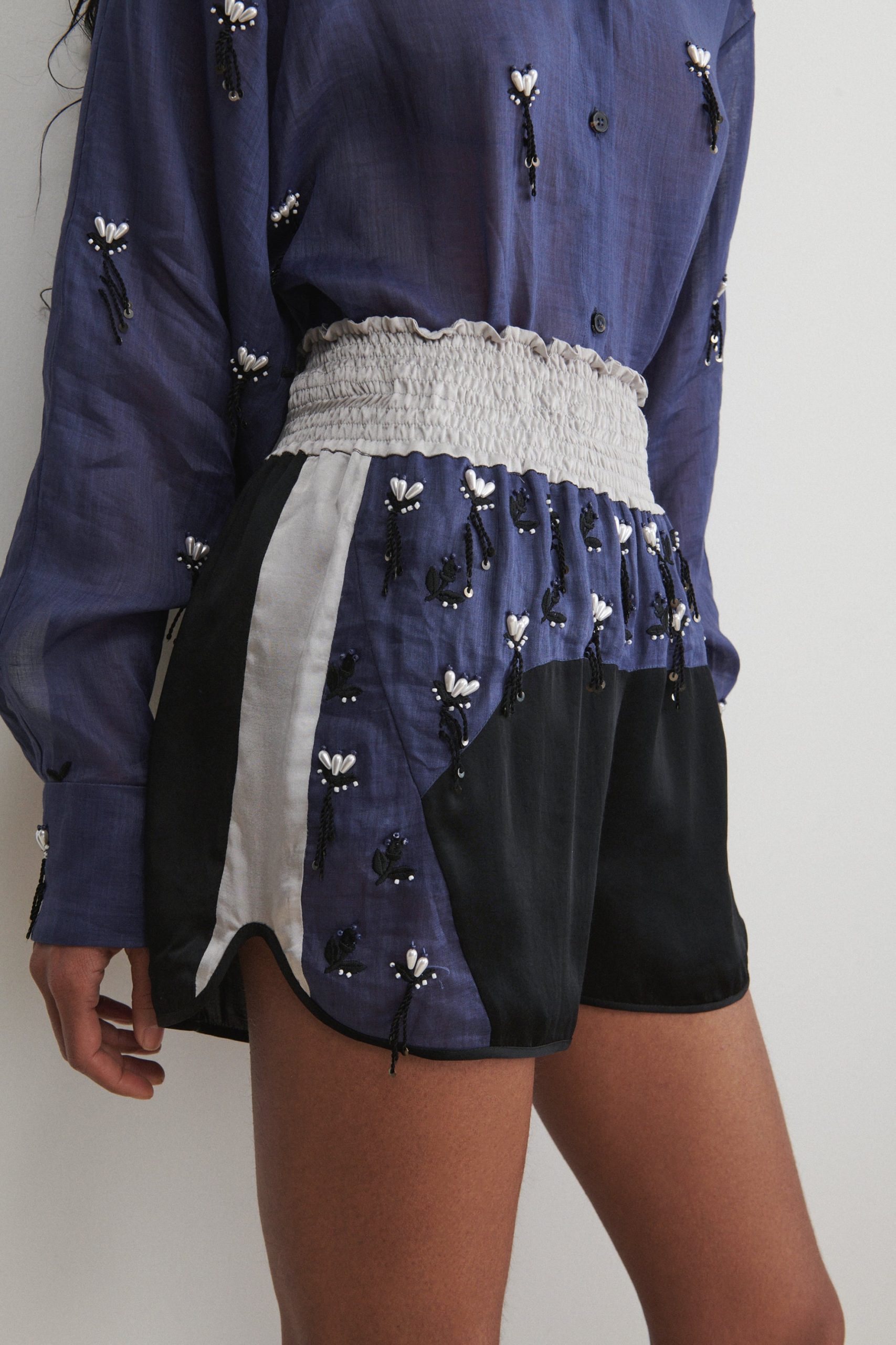 Relaxed-fit tri-color shorts, featuring beaded floral embroidery and a stretchy smocked waist for comfort. Wear with our matching Alsop Top for a breezy statement-making set.
