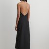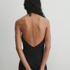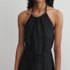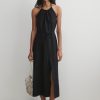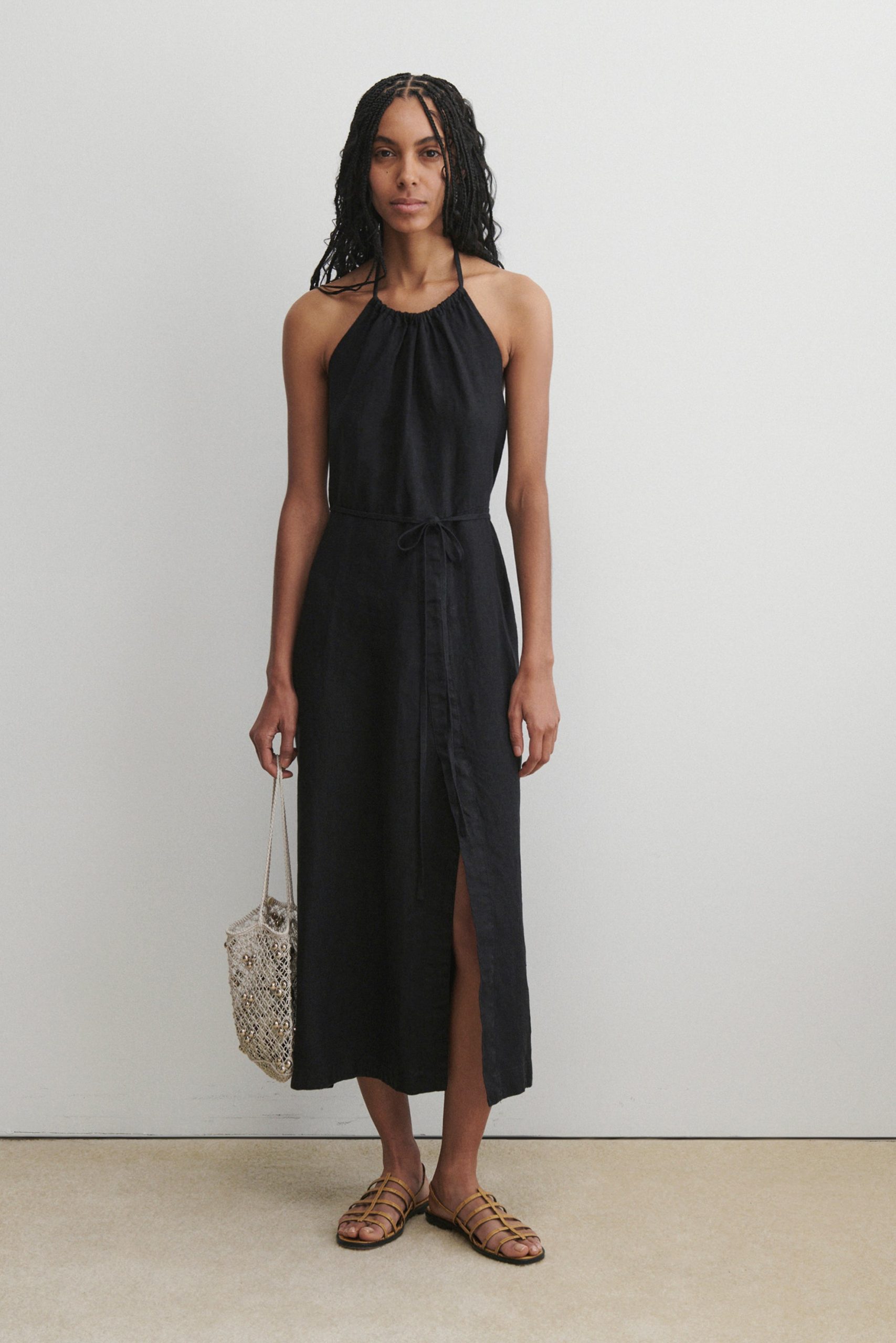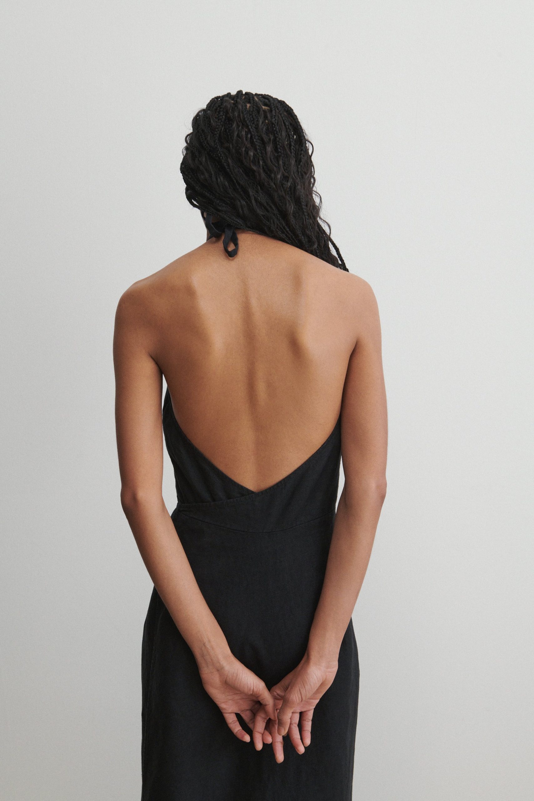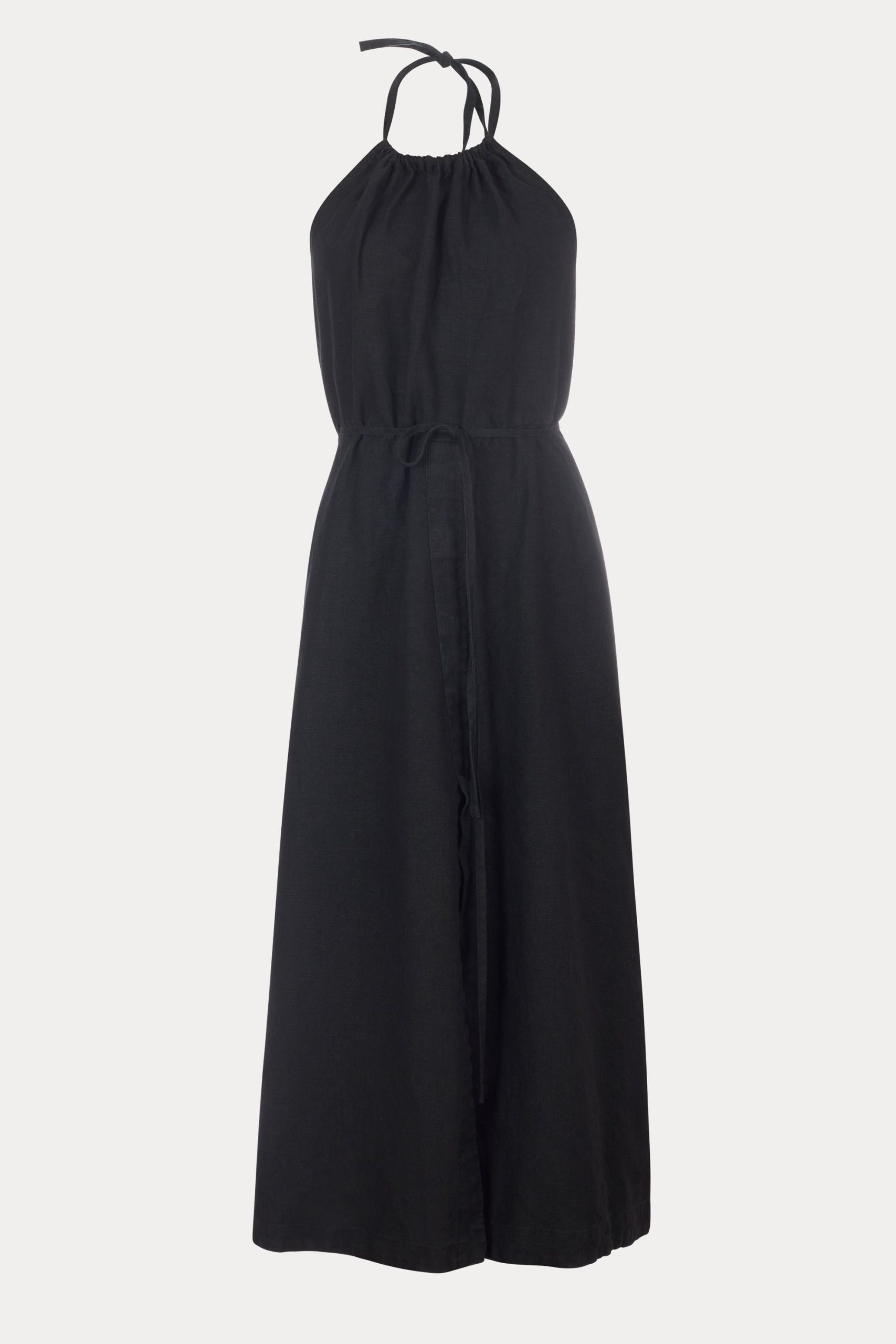 Halter maxi dress cut from heavier-weight linen fabric for a more structured shape. Features an alluring low-cut back and an adjustable drawstring closure at the waist.