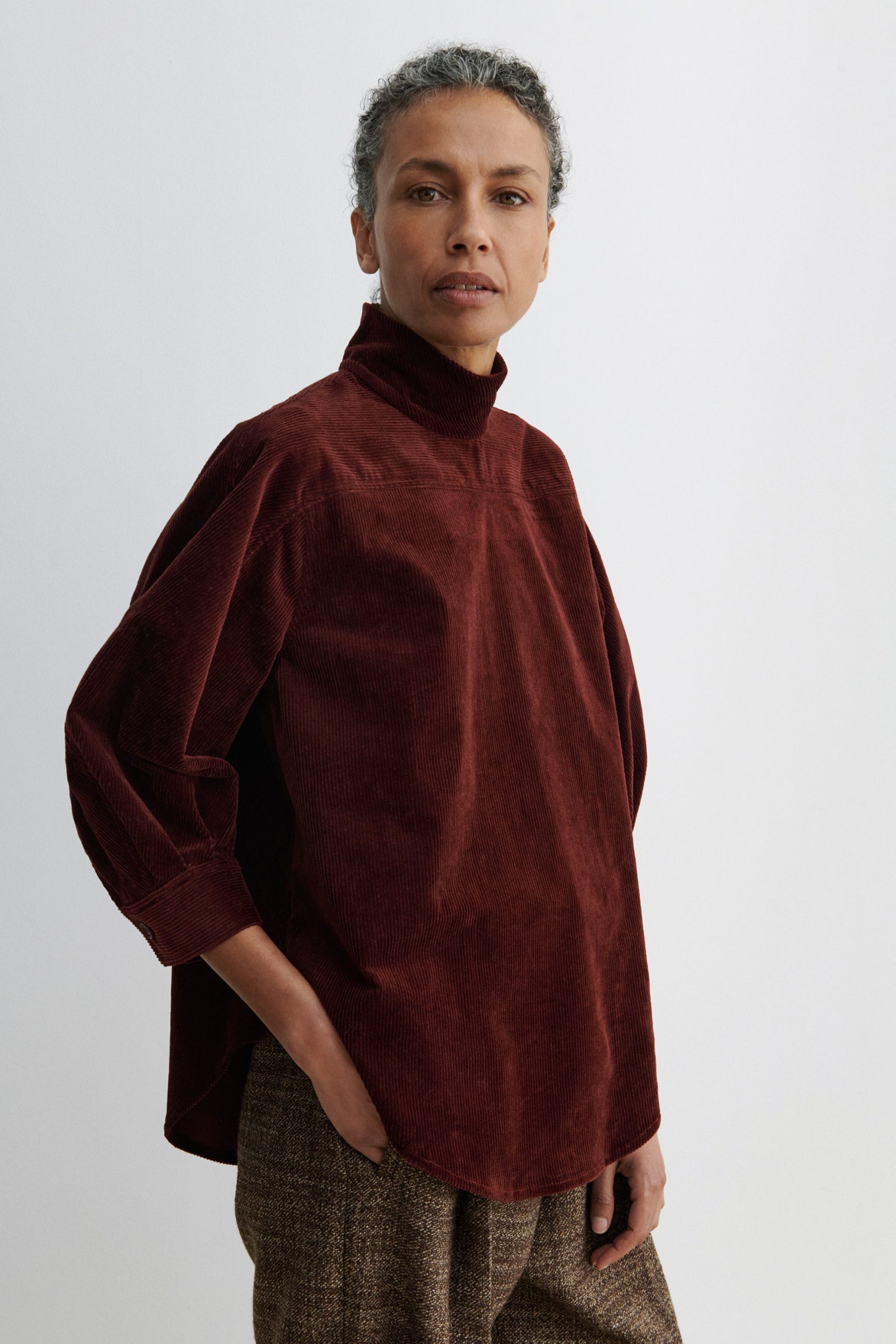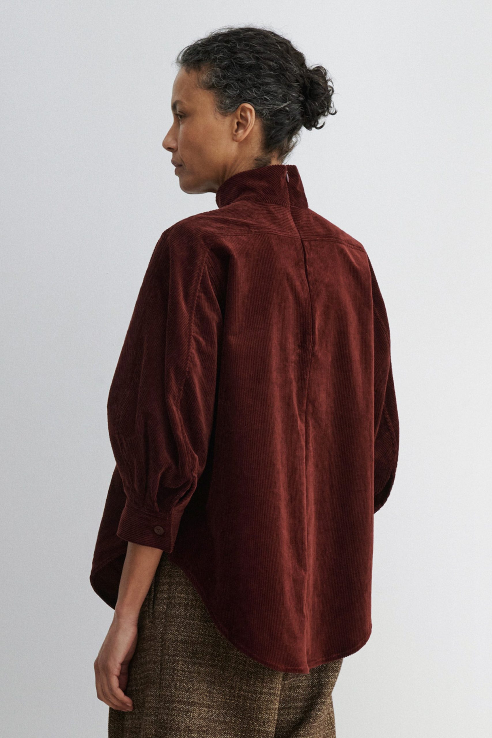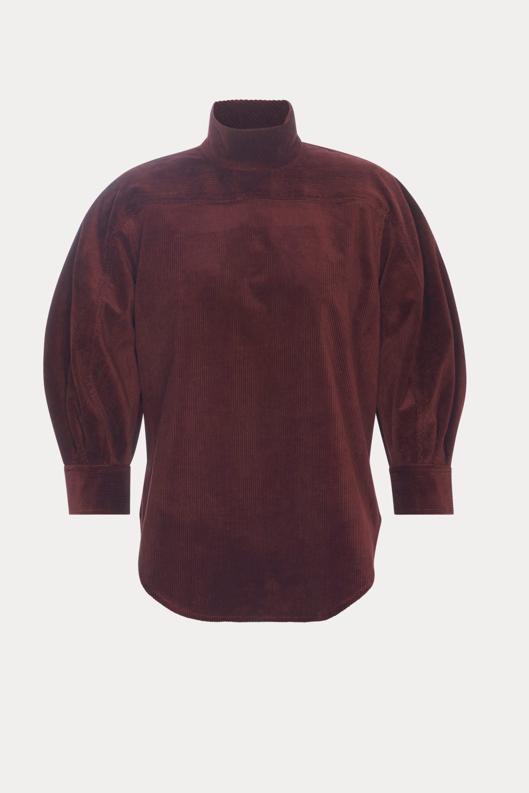 Quarter-sleeve turtleneck top cut from luxe stretch corduroy. Features a puckered shoulder, concealed button closure at the back, and a graduated hemline. Pair with our Lanett Pant for a dapper everyday fit.