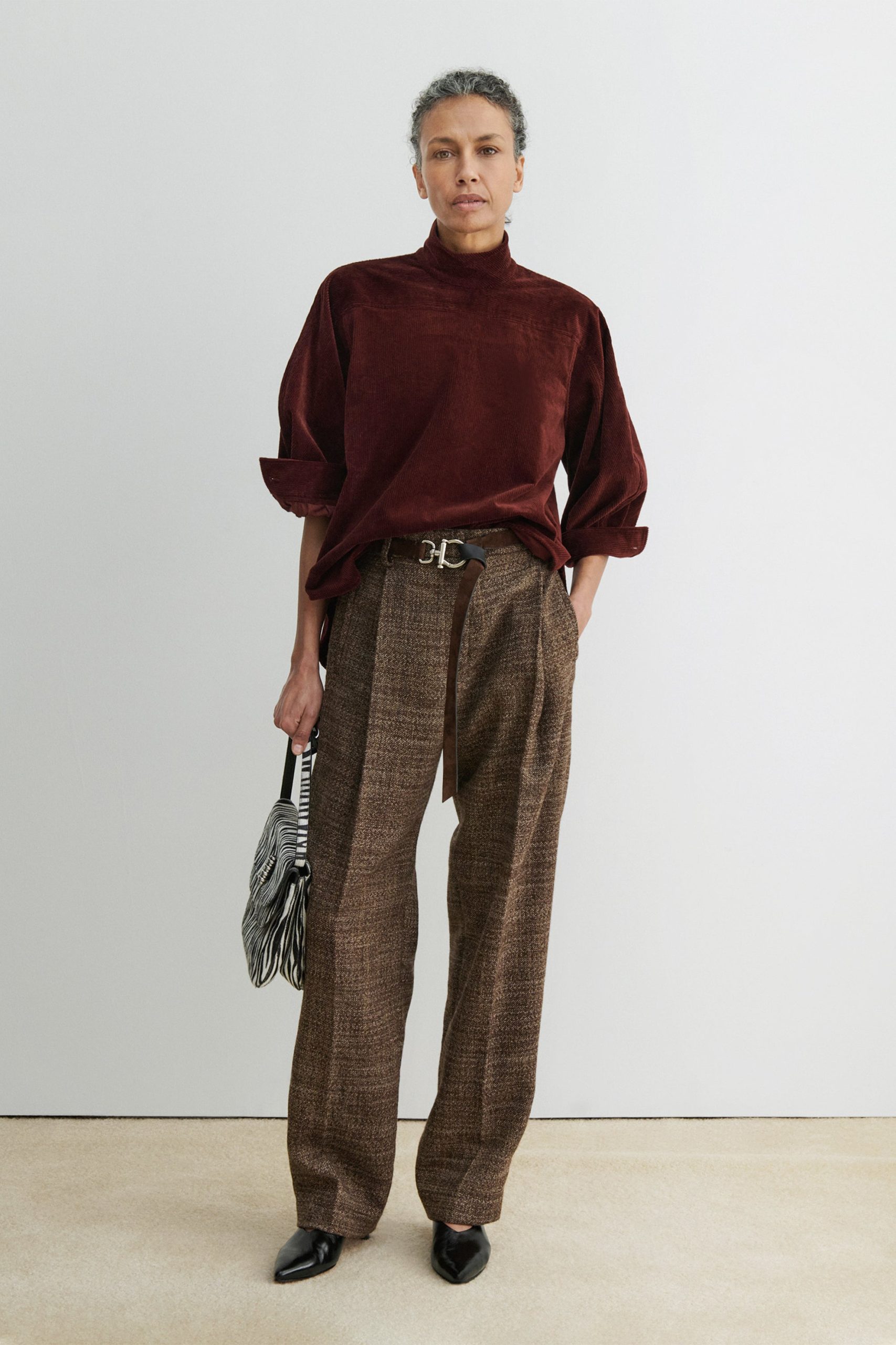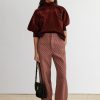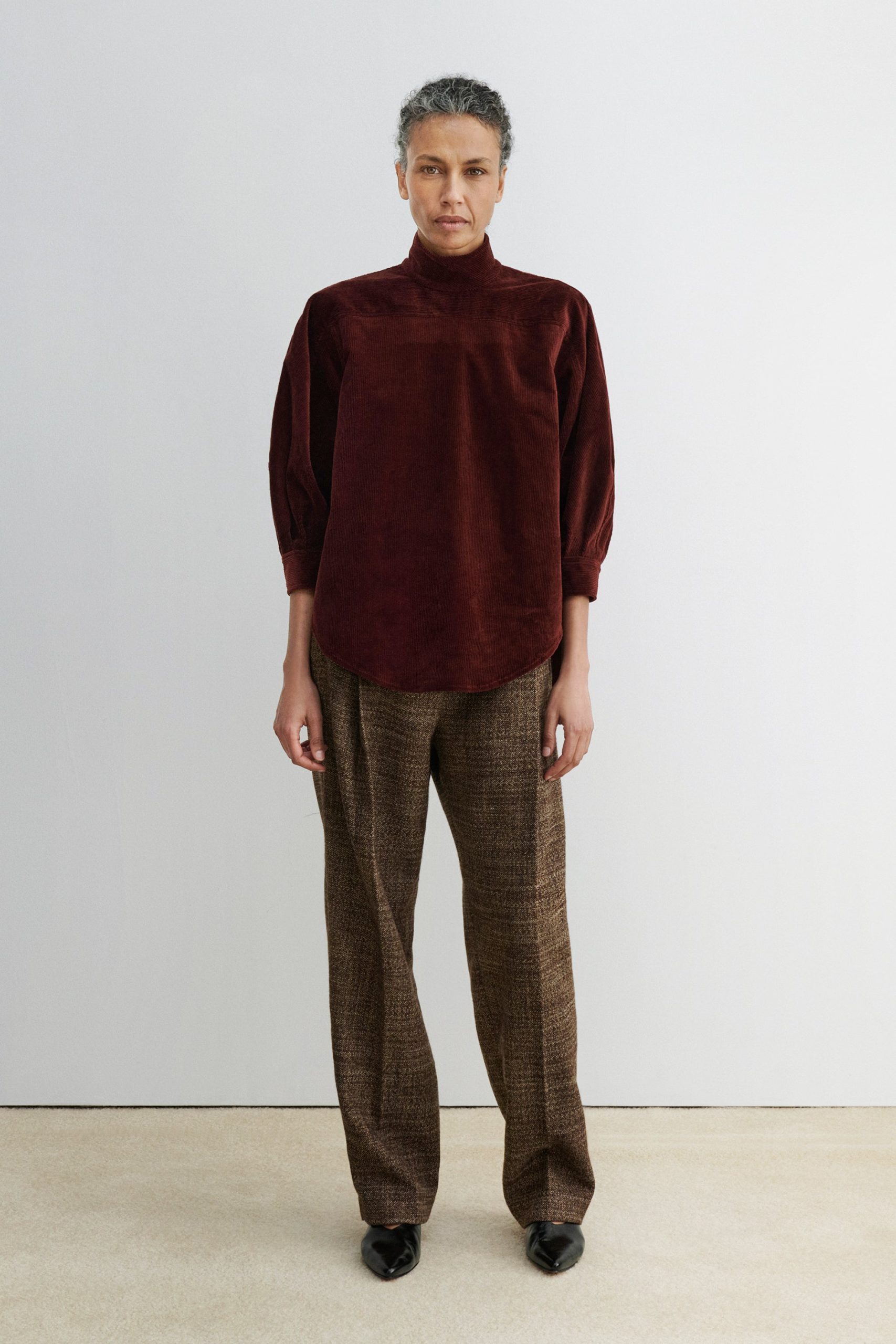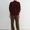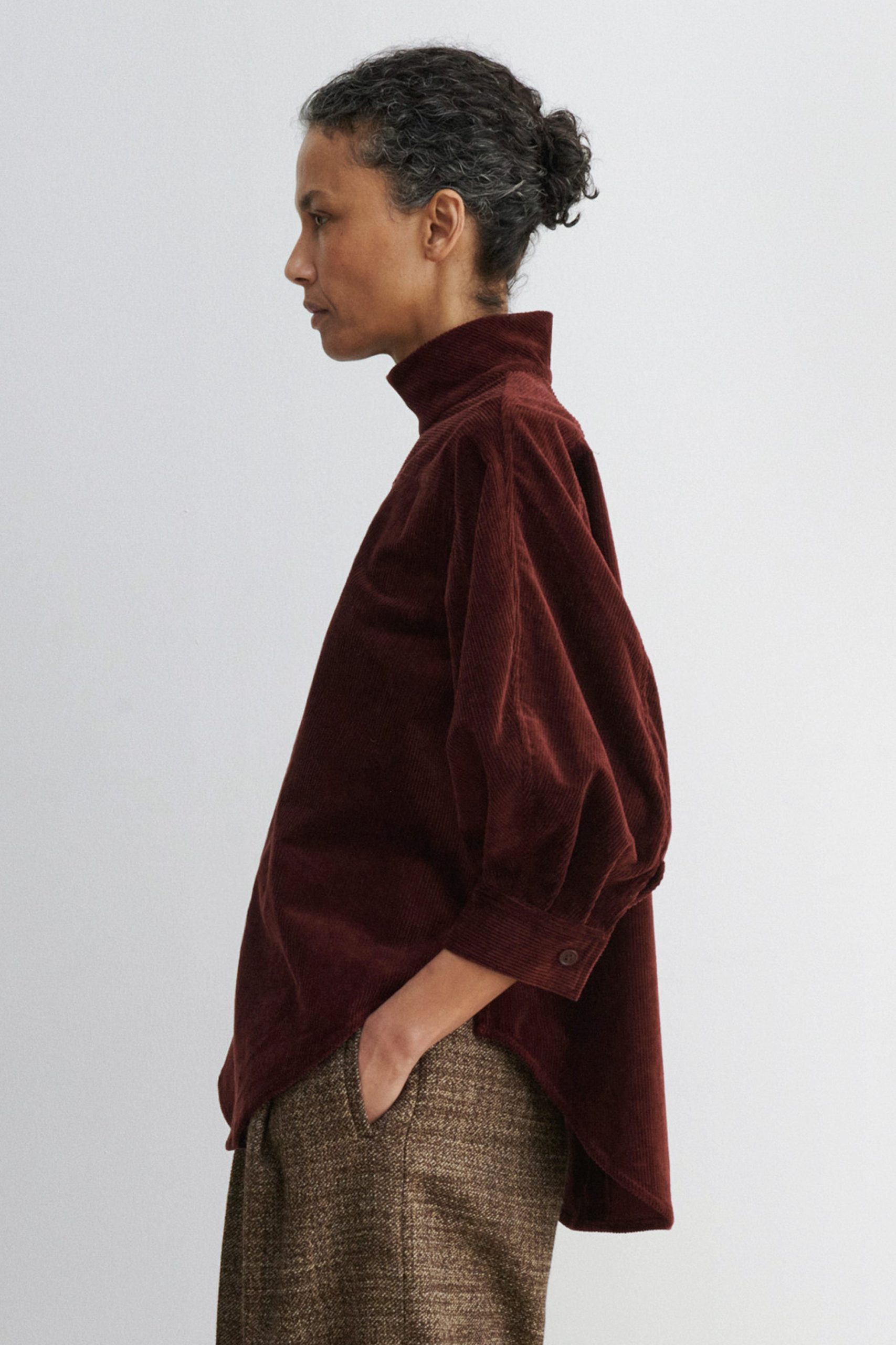 Quarter-sleeve turtleneck top cut from luxe stretch corduroy. Features a puckered shoulder, concealed button closure at the back, and a graduated hemline. Pair with our Lanett Pant for a dapper everyday fit.