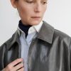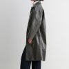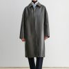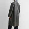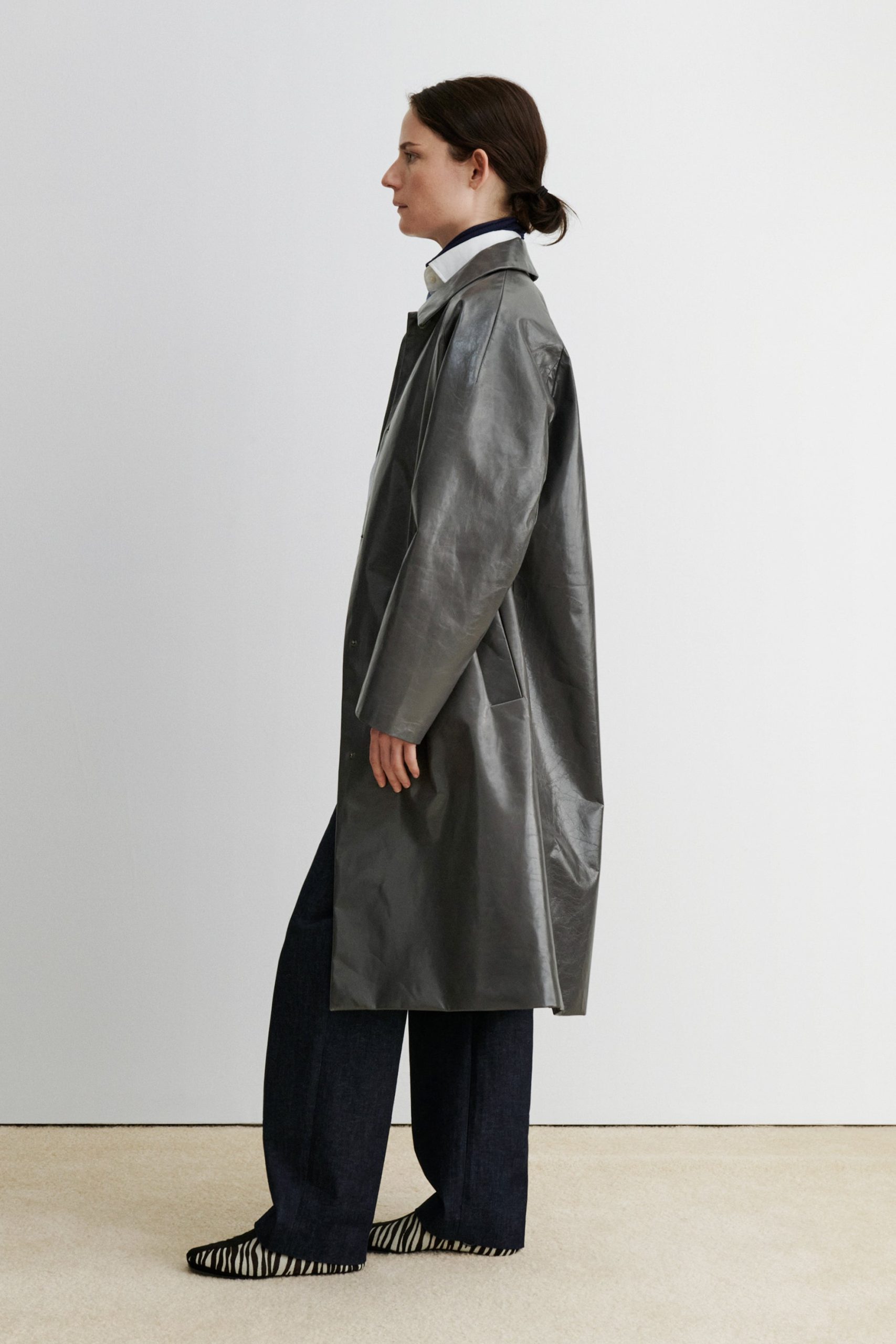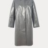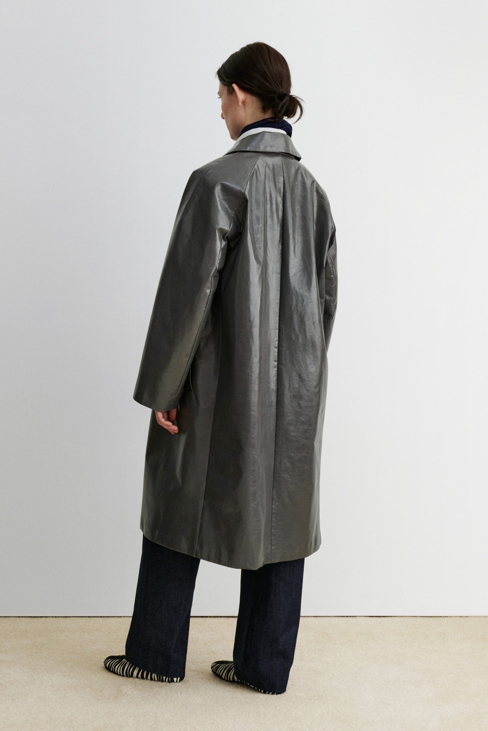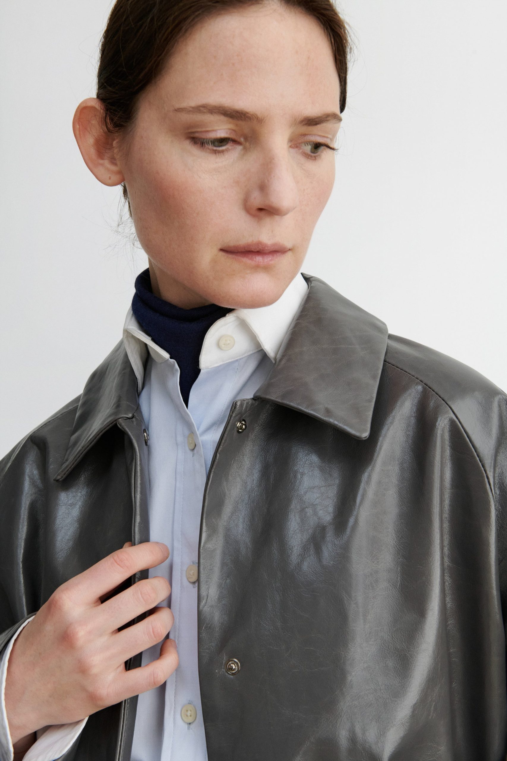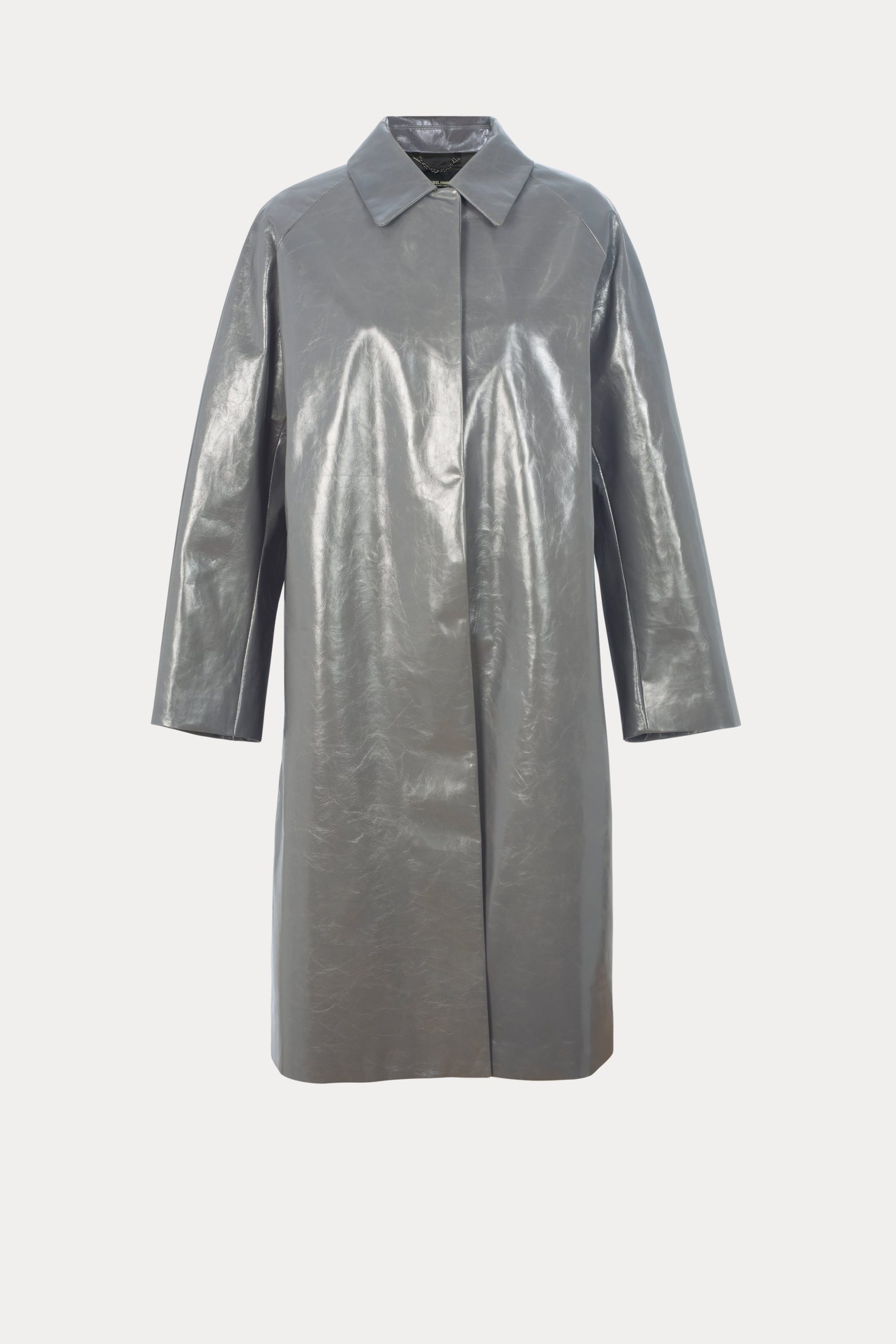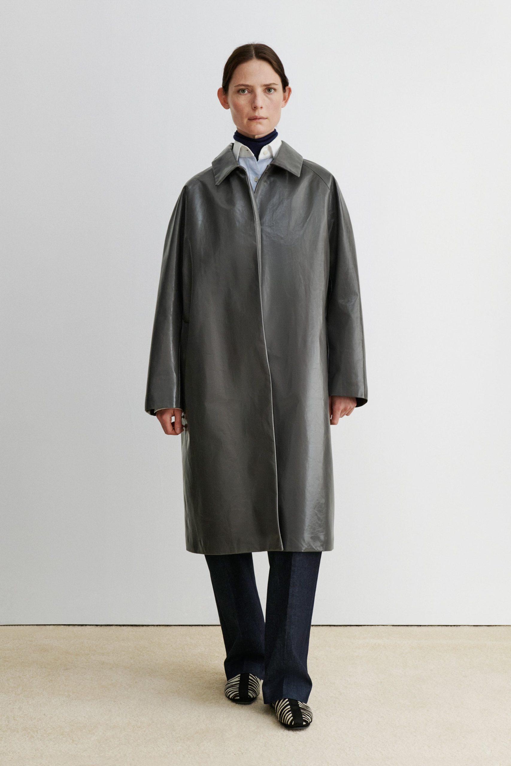 Long, minimalist crinkle leather coat with an oversized fit and a classic collar. Cut to an a-line silhouette, with a snap button front, and side welt pockets.