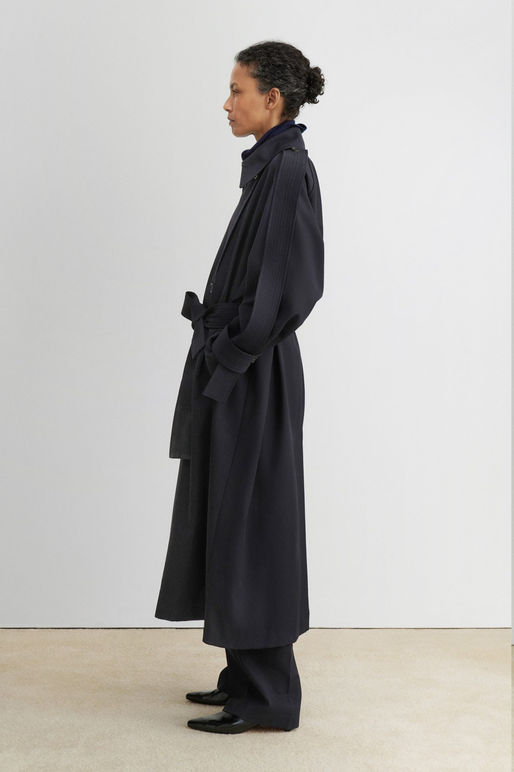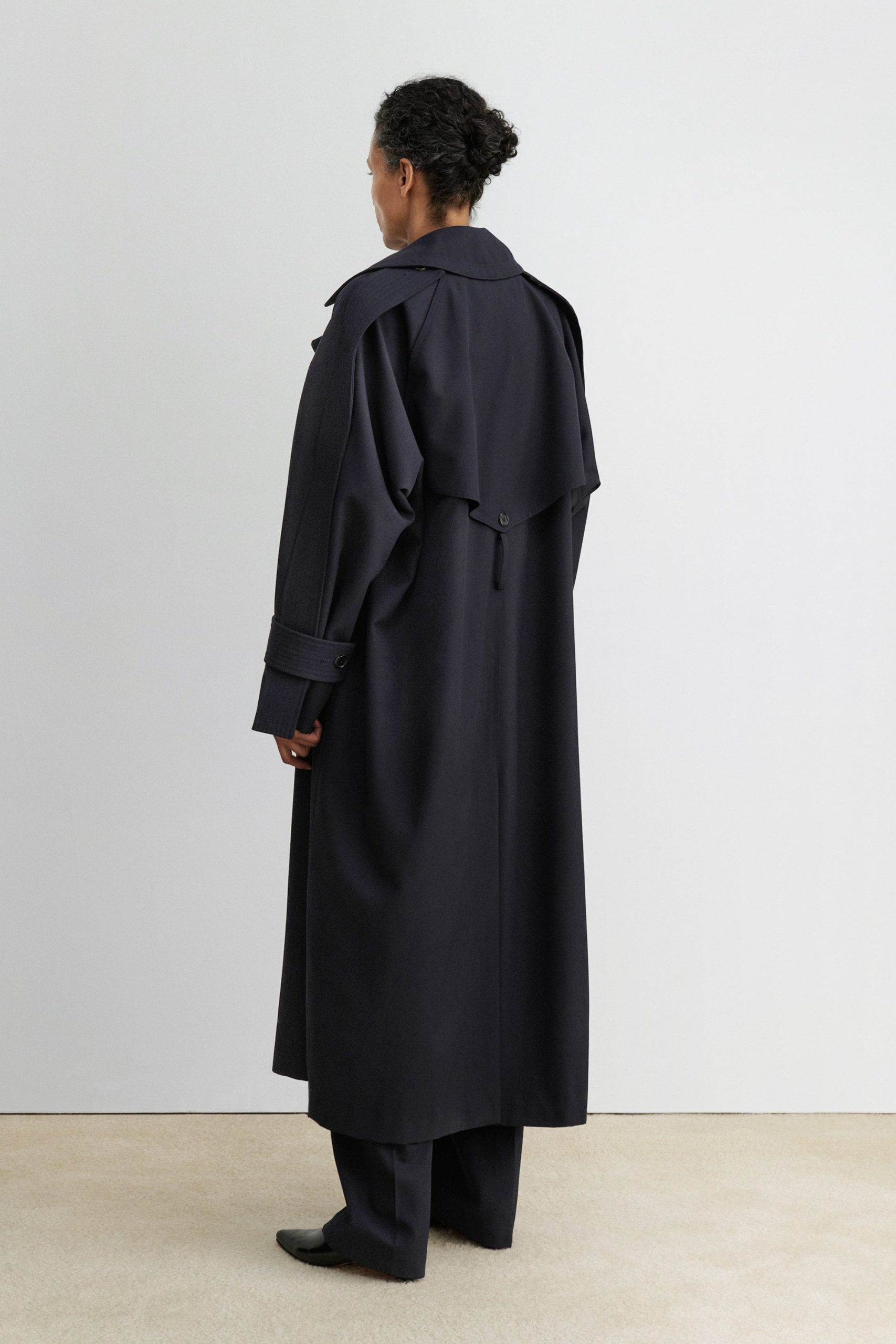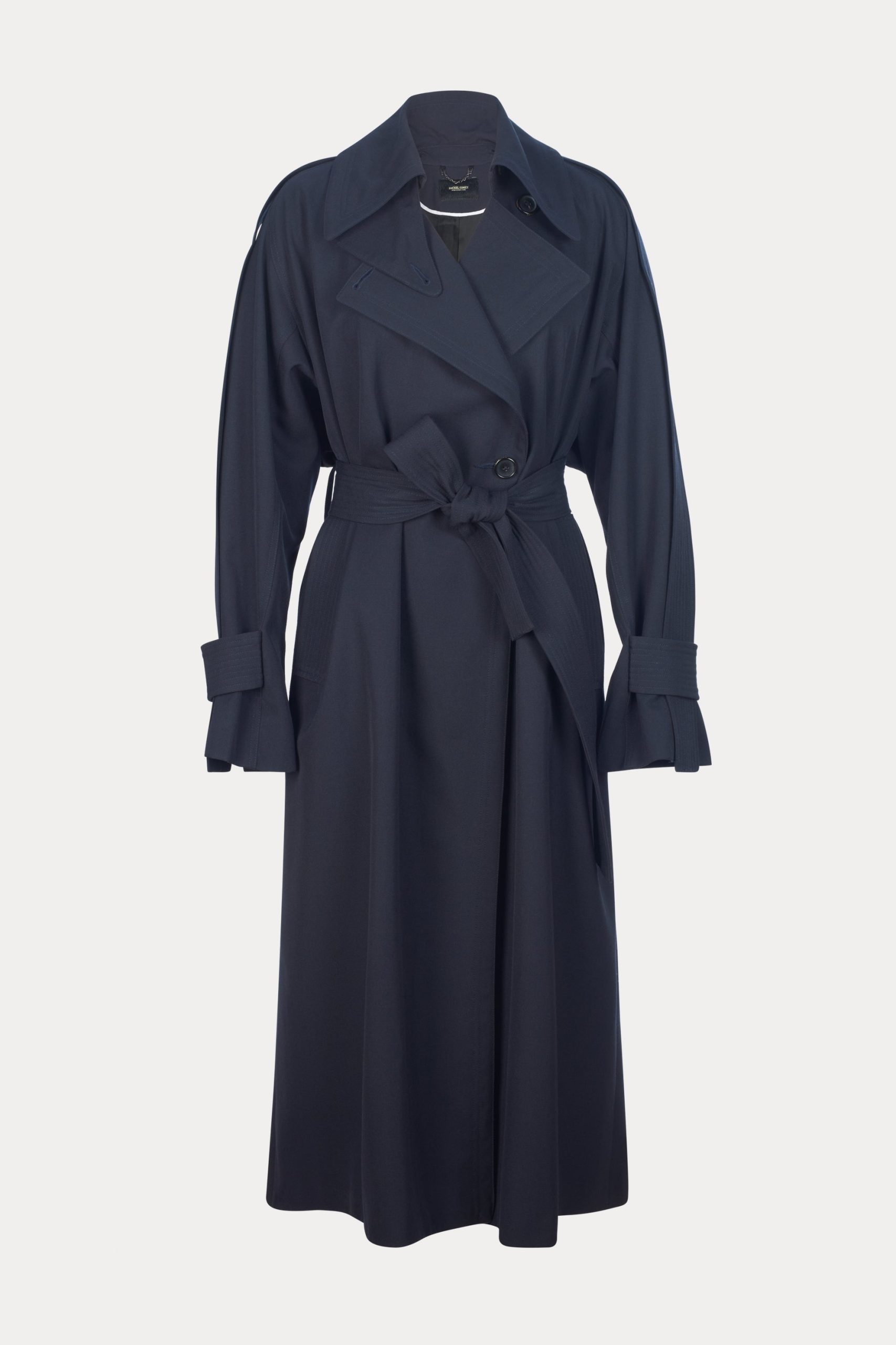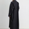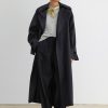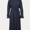 Military-style wool gabardine trench made in NY. This durable trench features a classic double-breasted front, a wide lapel collar, and a belted waist for a structured silhouette. Long sleeves with detailed top panels and adjustable cuffs add functionality and style. Designed with a back vent and storm flap for added protection against the elements.