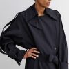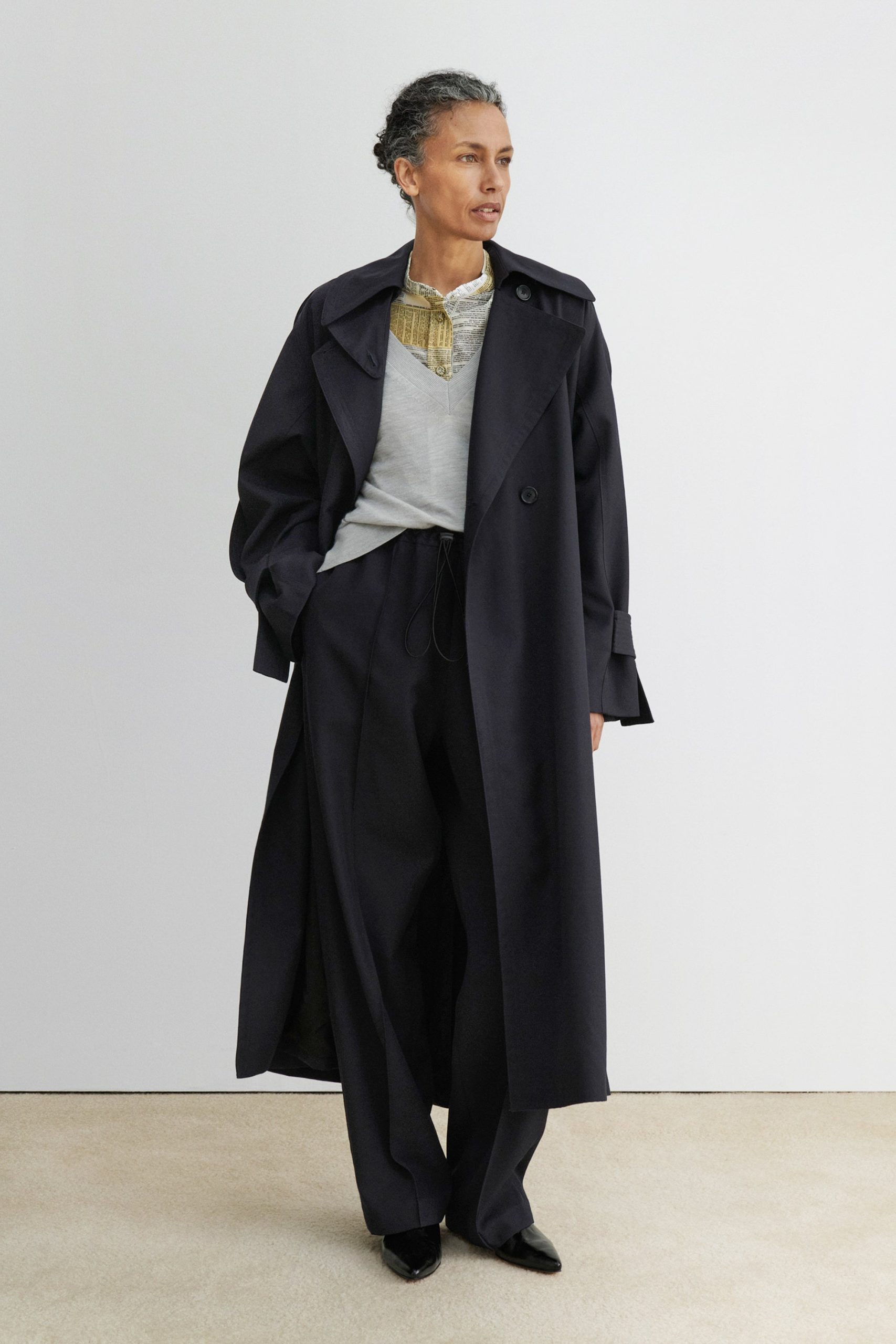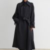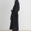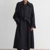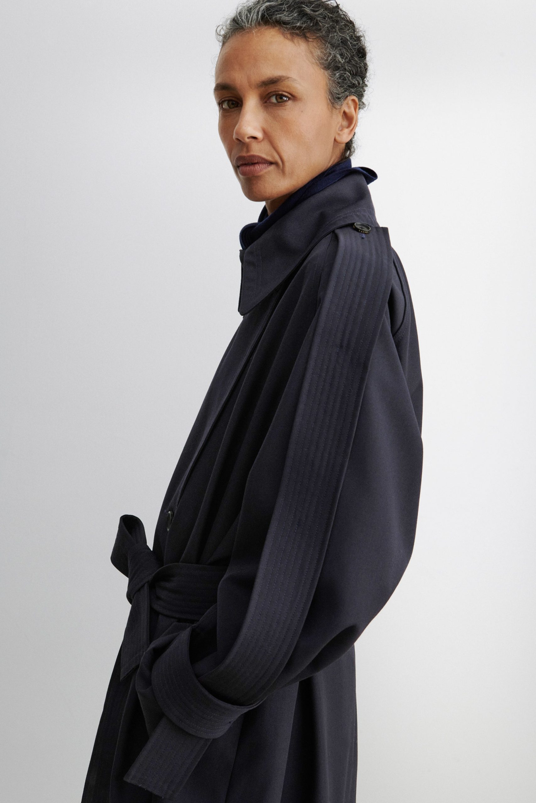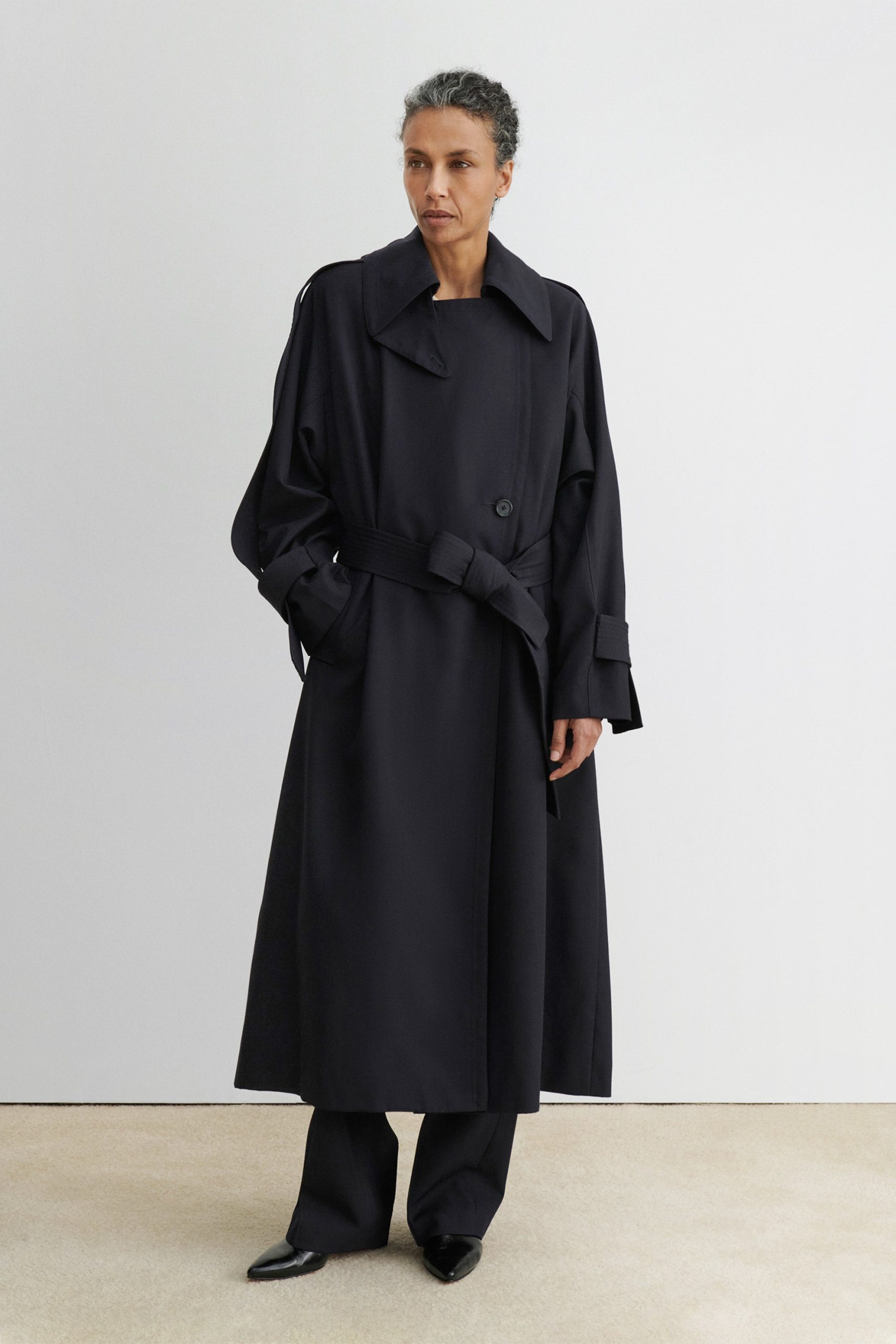 Military-style wool gabardine trench made in NY. This durable trench features a classic double-breasted front, a wide lapel collar, and a belted waist for a structured silhouette. Long sleeves with detailed top panels and adjustable cuffs add functionality and style. Designed with a back vent and storm flap for added protection against the elements.