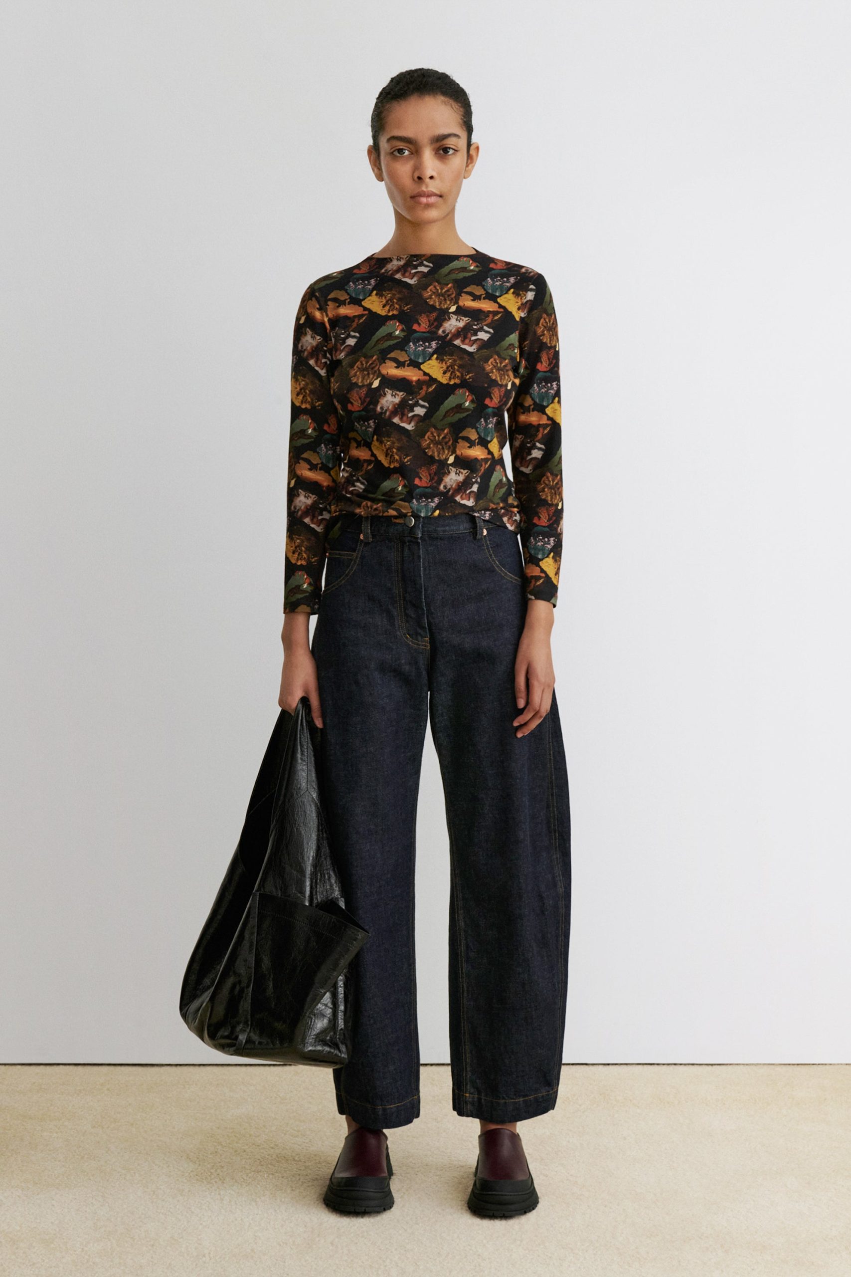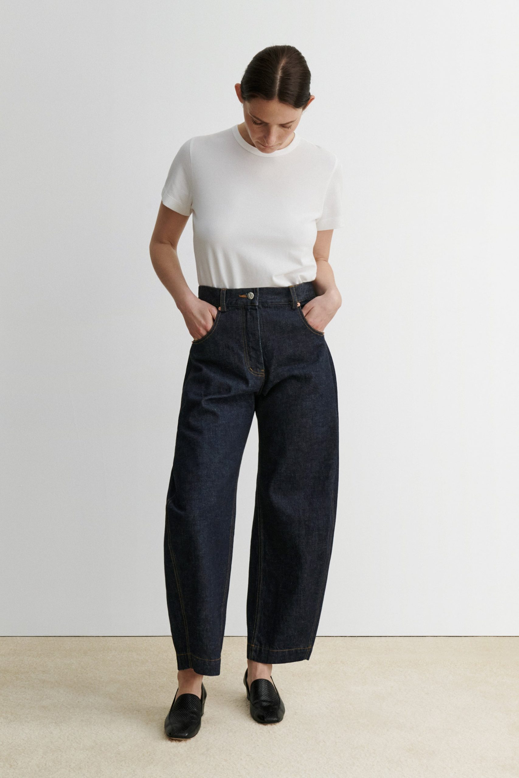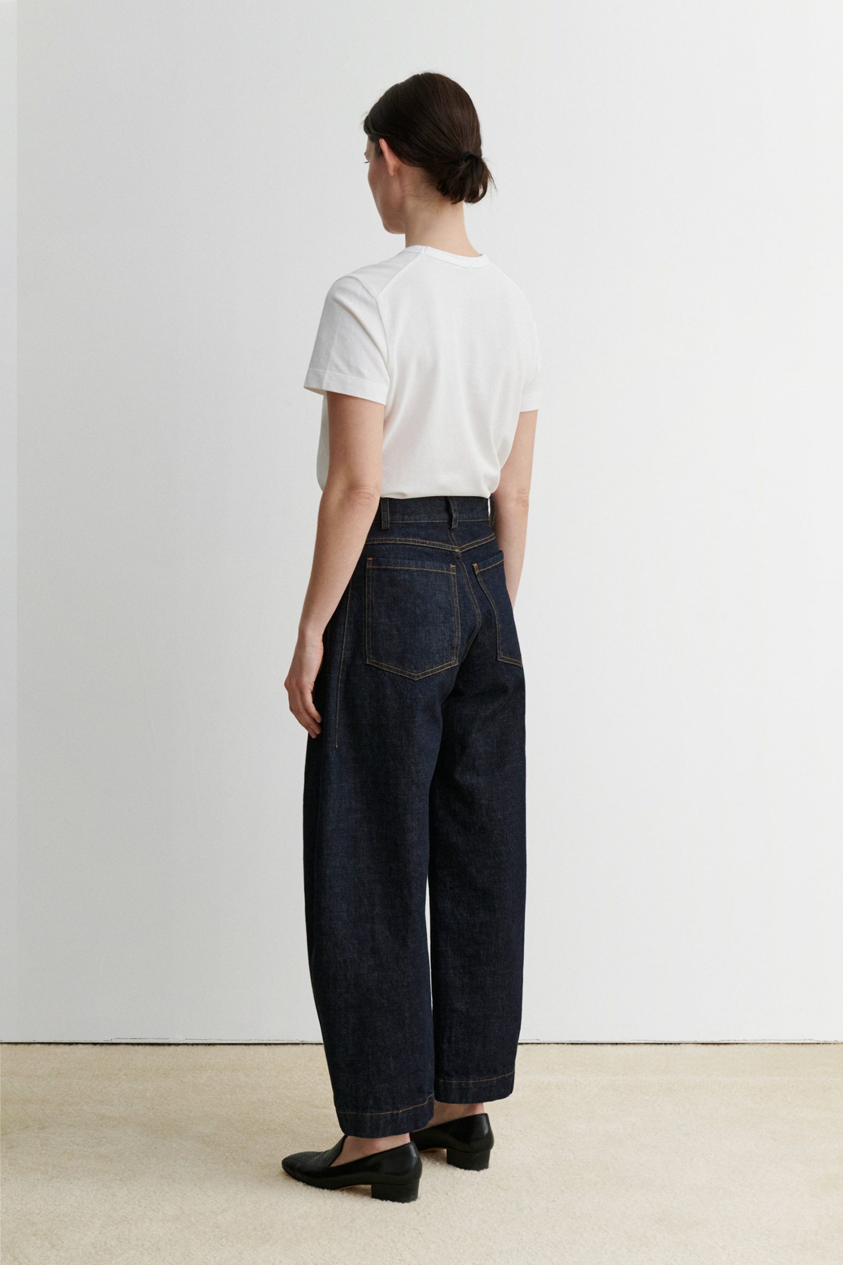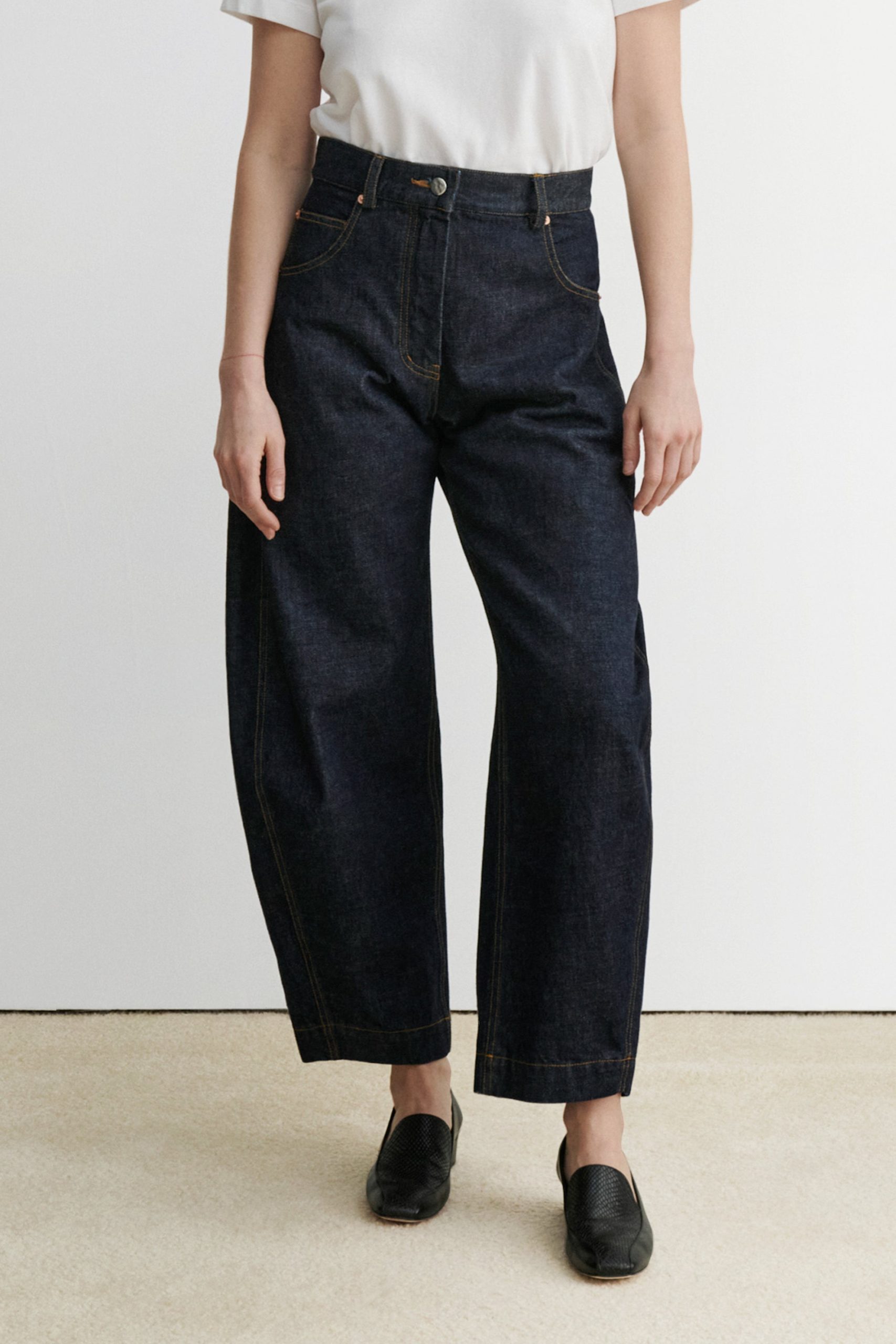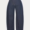 Sculpted barrel jeans in Raw Mission Denim with five-pocket styling and a relaxed fit. Features a high waist and button fly closure. Our denim collection is made in Los Angeles using premium Japanese denim. Each style is crafted in limited quantities in partnership with small, family-run factories.