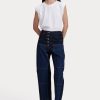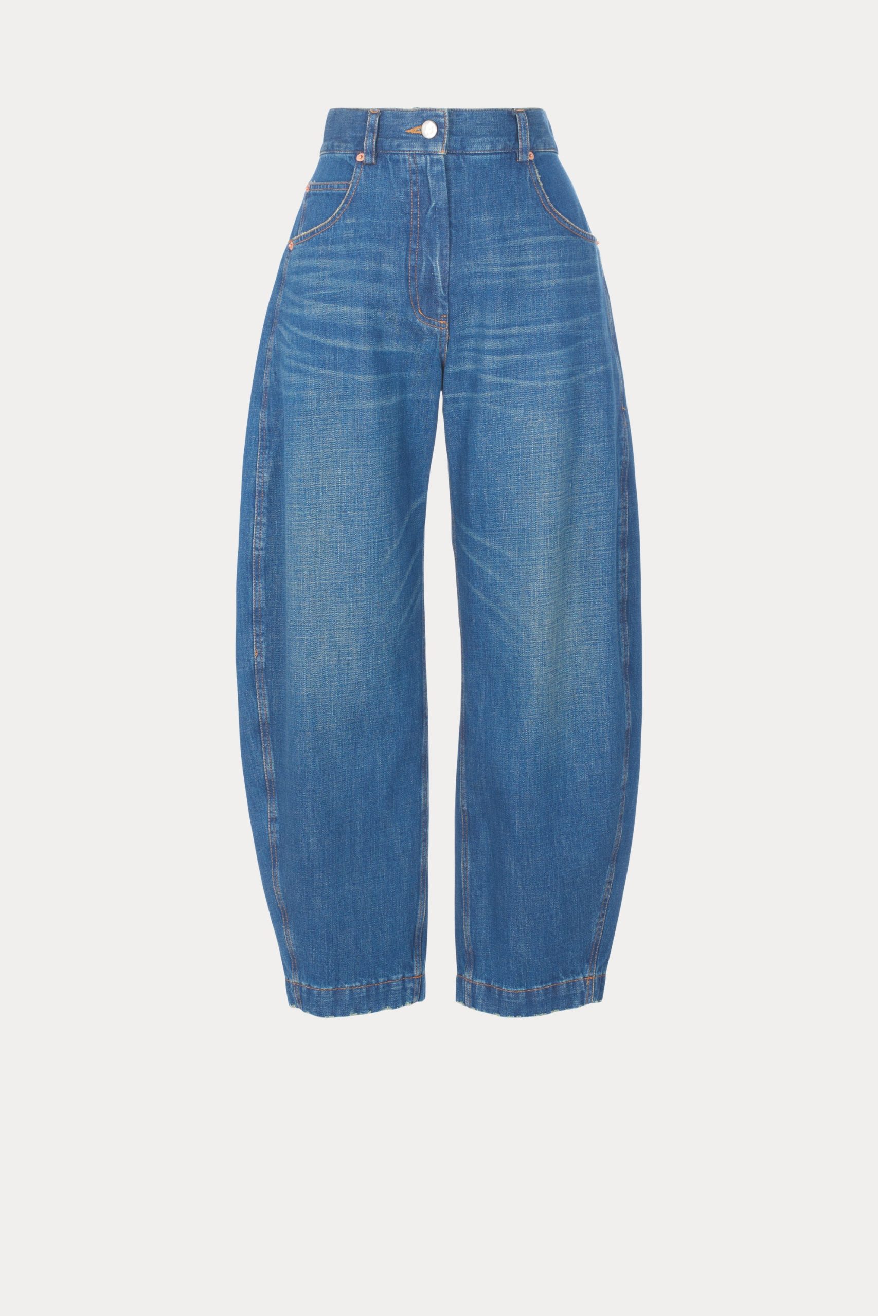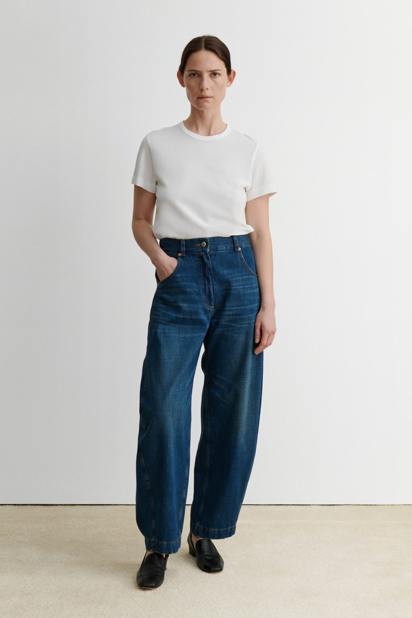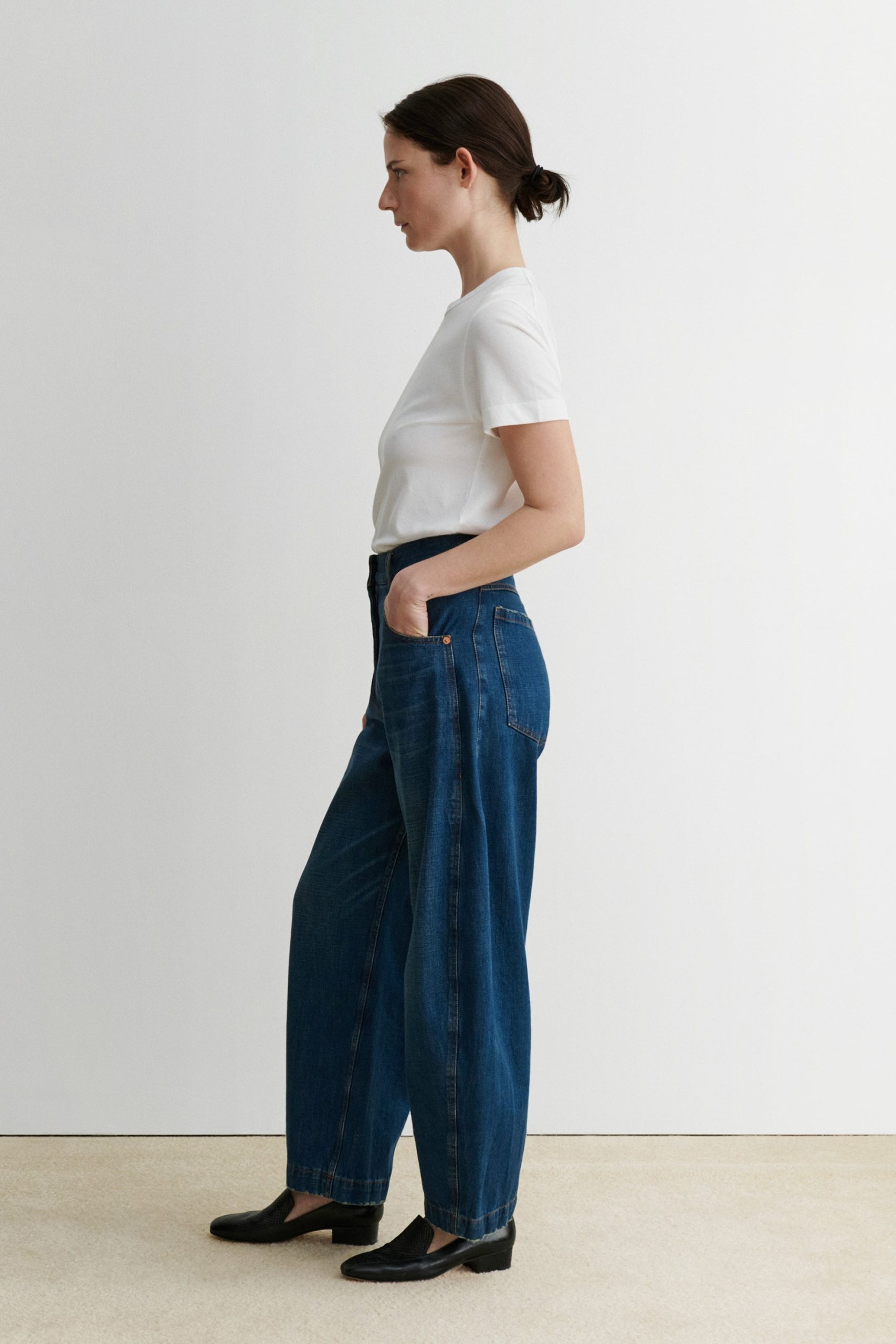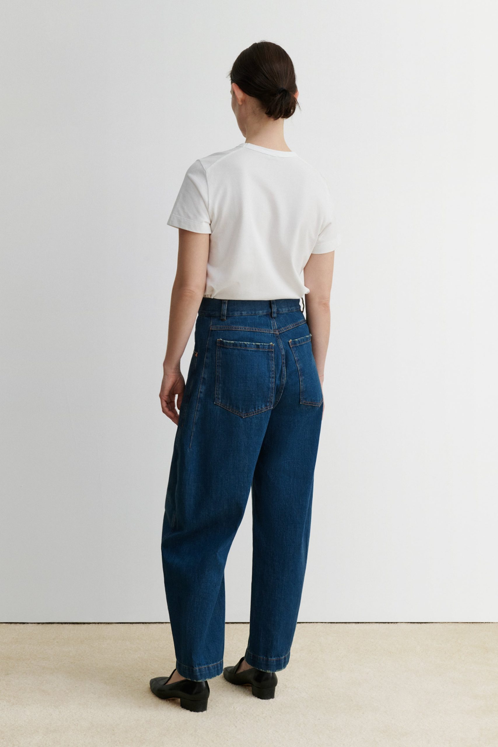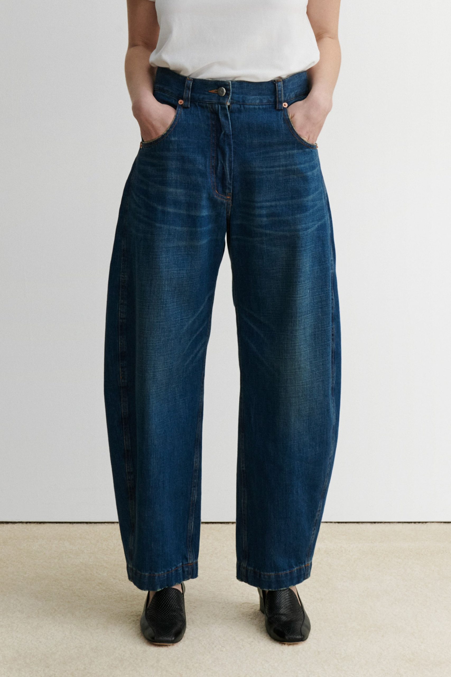 Sculpted barrel jeans in indigo Odisto Denim with five-pocket styling and a relaxed fit. Features a high waist and button fly closure. Our denim collection is made in Los Angeles using premium Japanese denim. Each style is crafted in limited quantities in partnership with small, family-run factories.