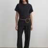 Thin leather belt with a fine metal buckle, statement metal ring detail, and double leather loop. Sits low at hip.