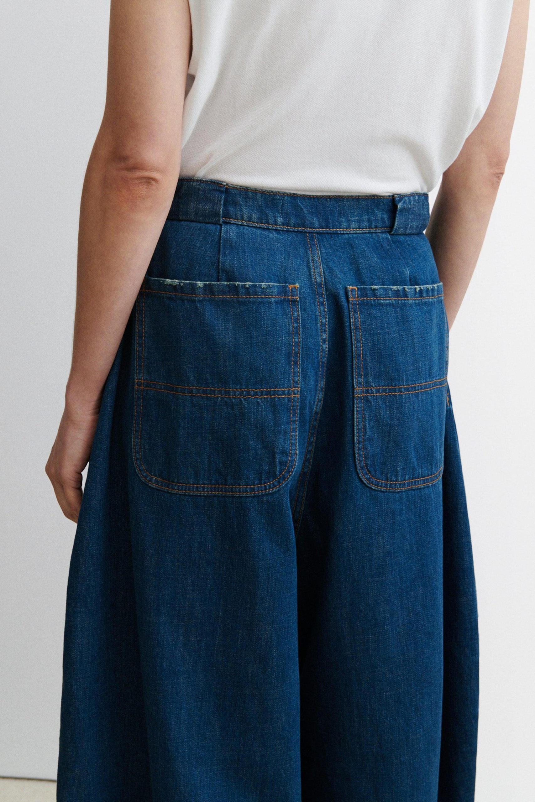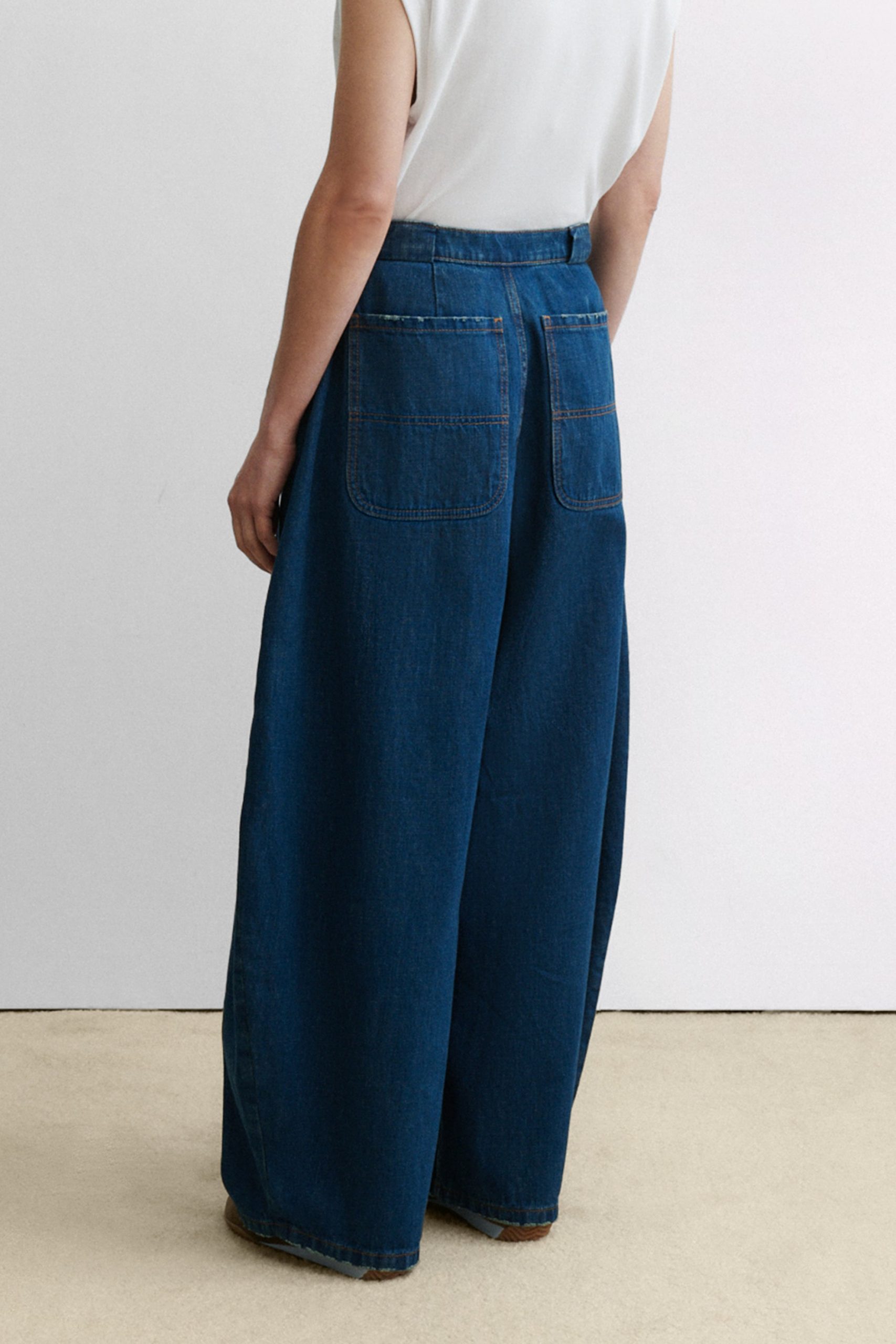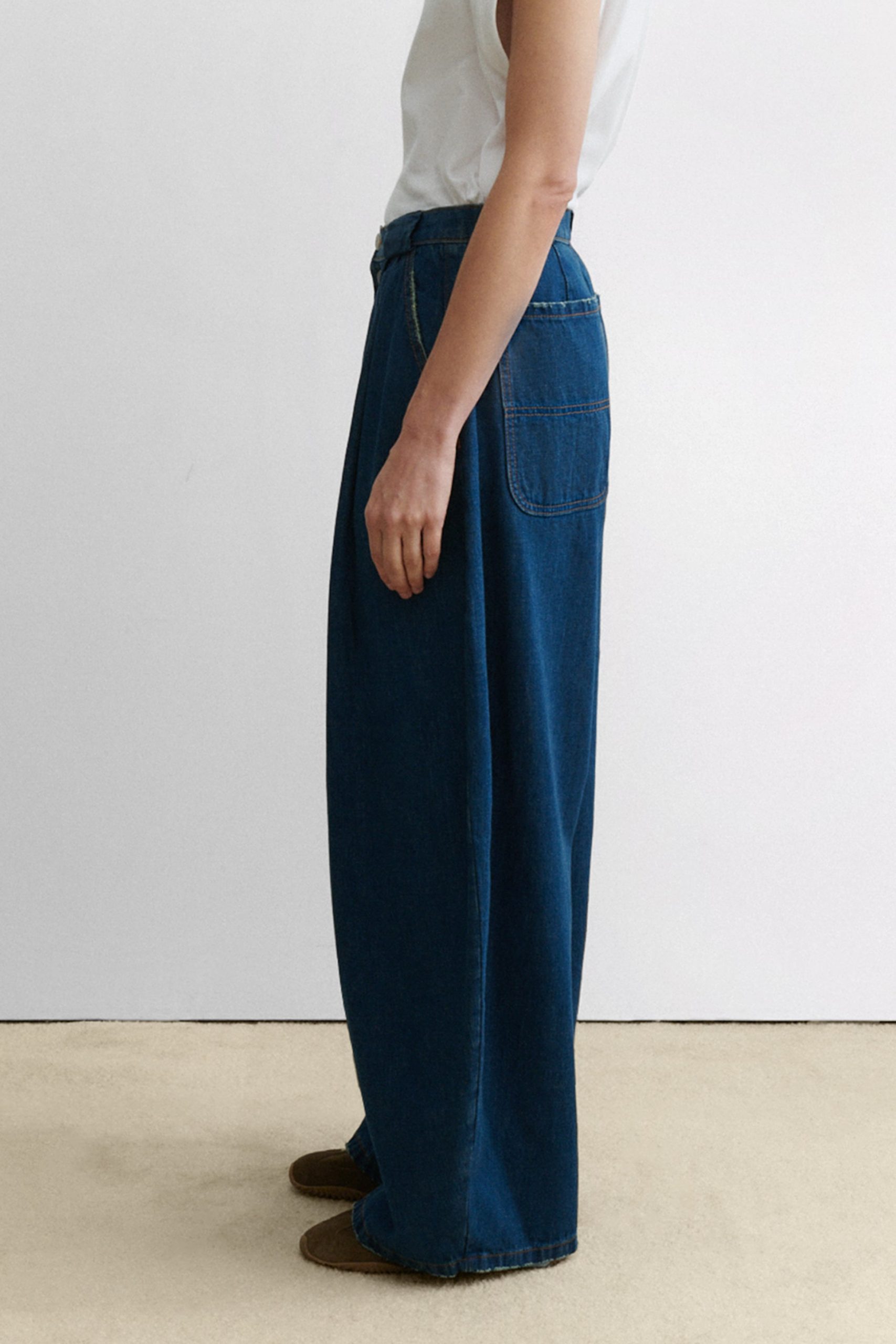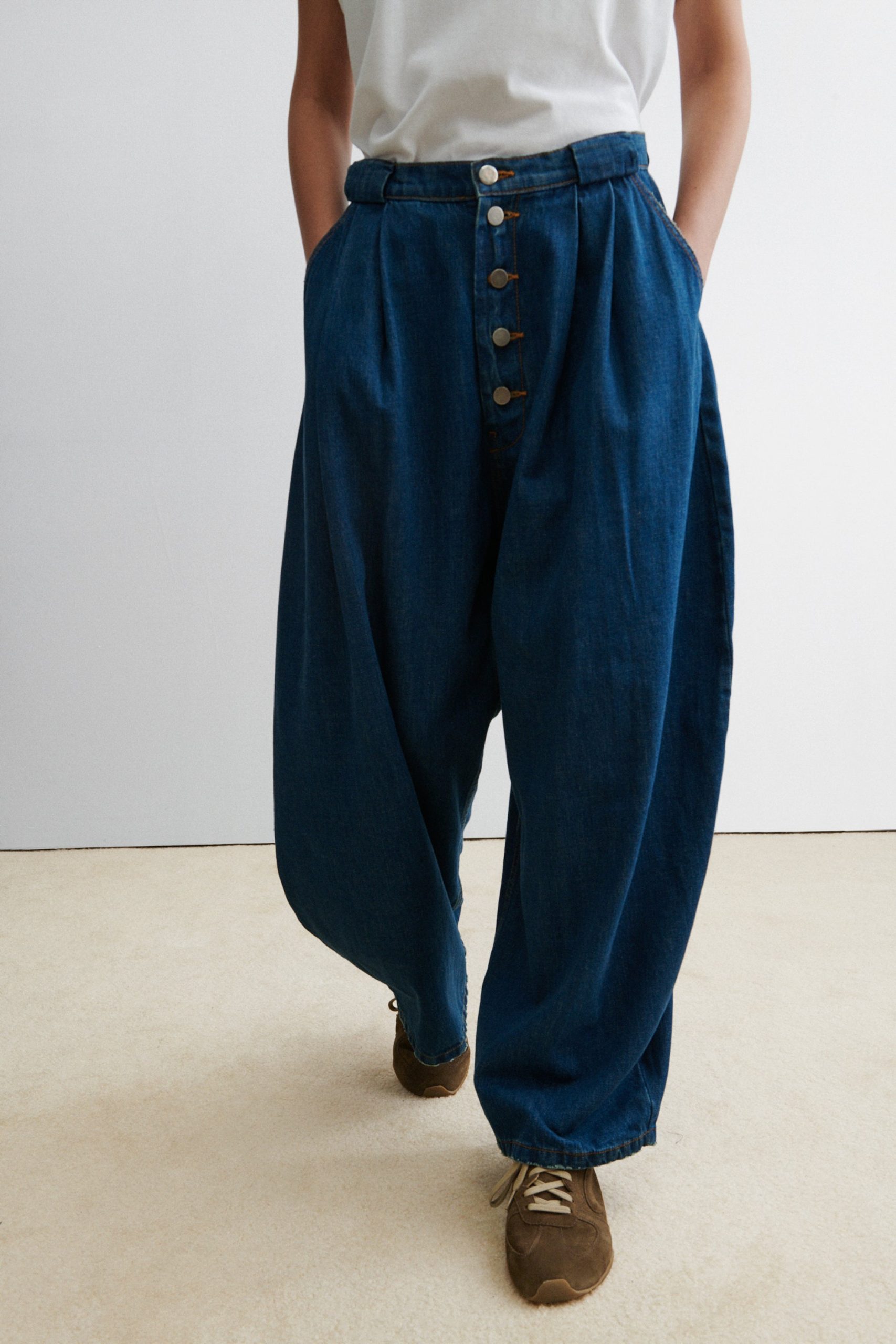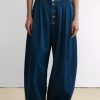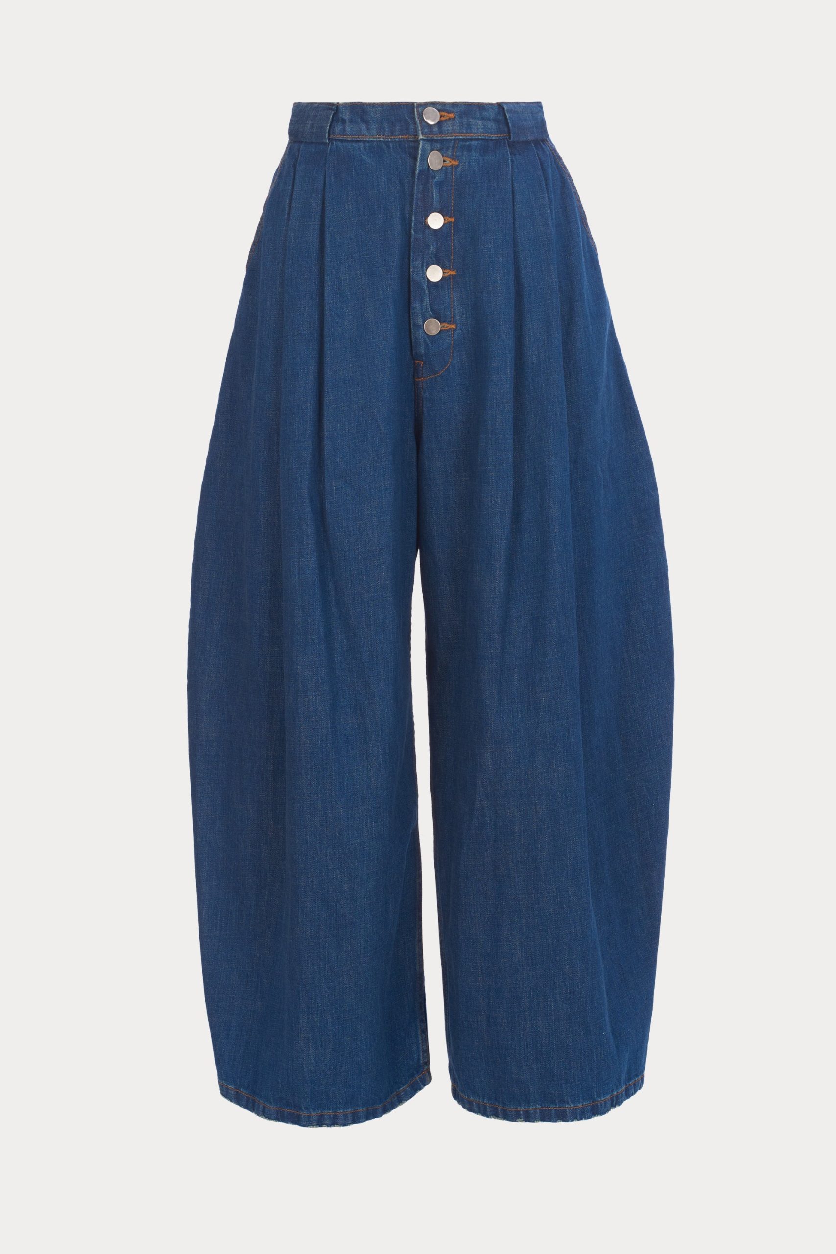 Pleated barrel jeans in soft Odisto Denim. Features a voluminous leg and button front closure. Our denim collection is made in Los Angeles using premium Japanese denim.