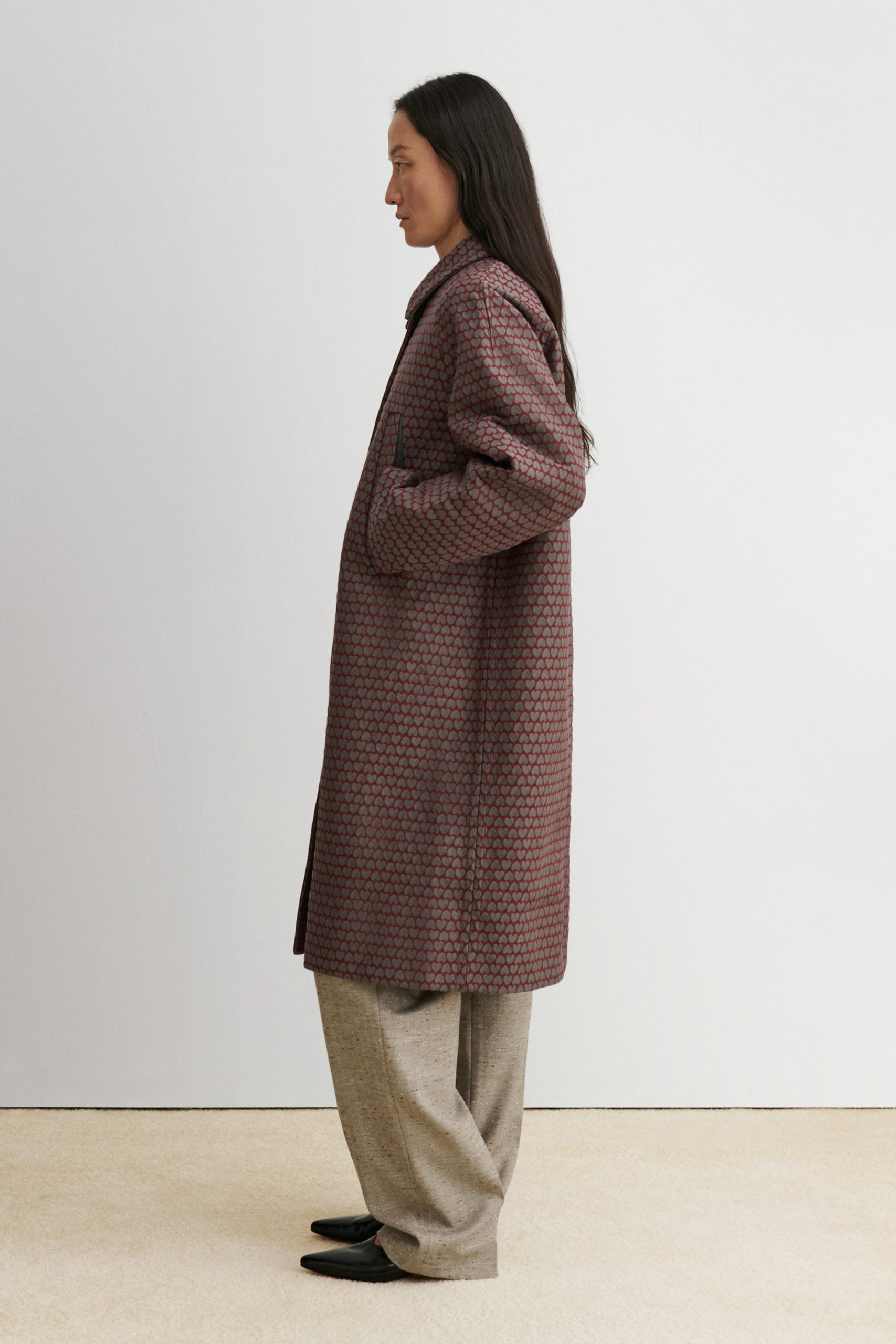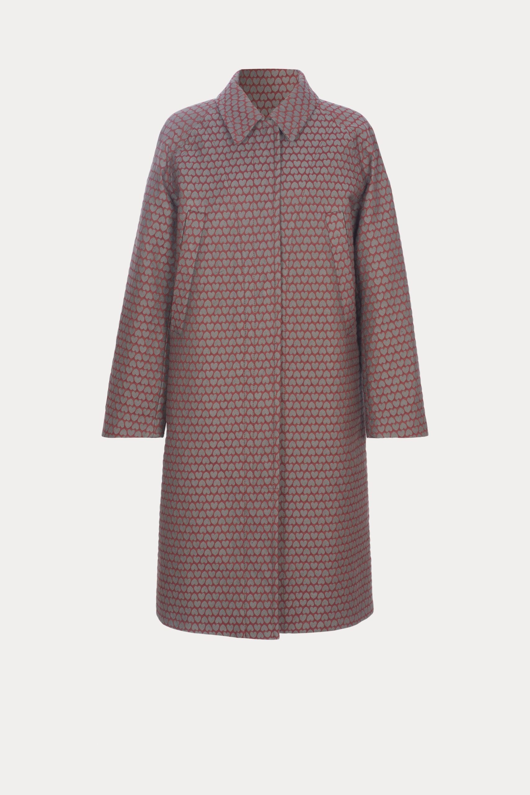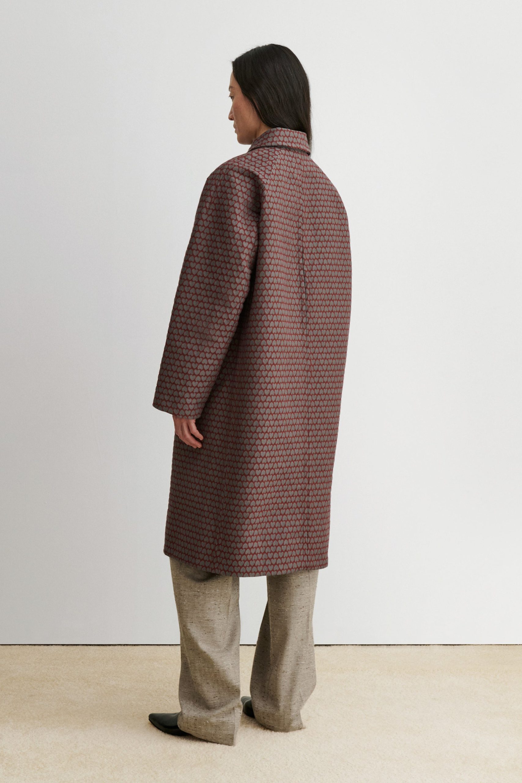 Long, textured jacquard coat with a relaxed fit and a classic collar. Cut to a straight-cut silhouette, with a concealed snap button front, and side welt pockets.