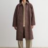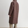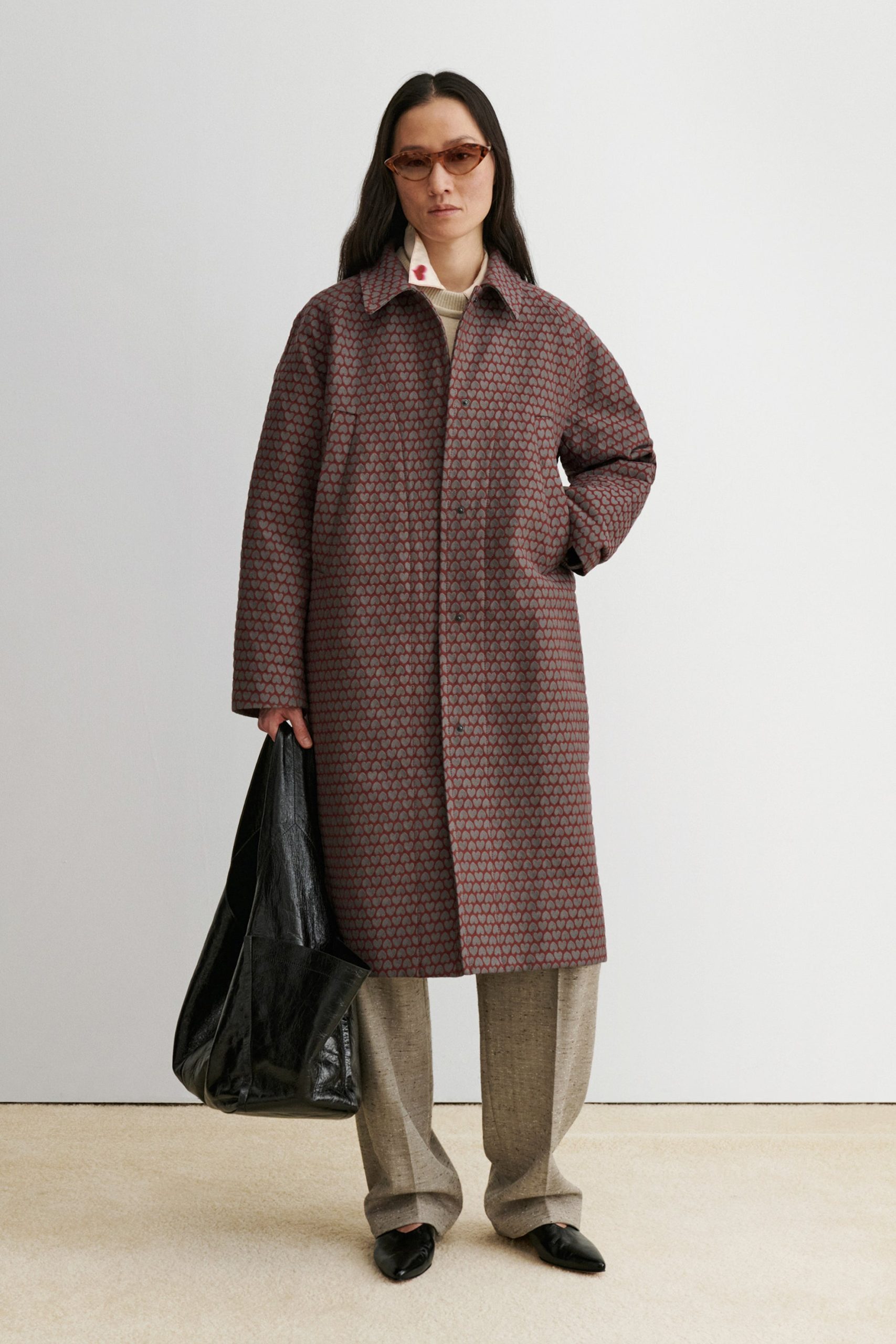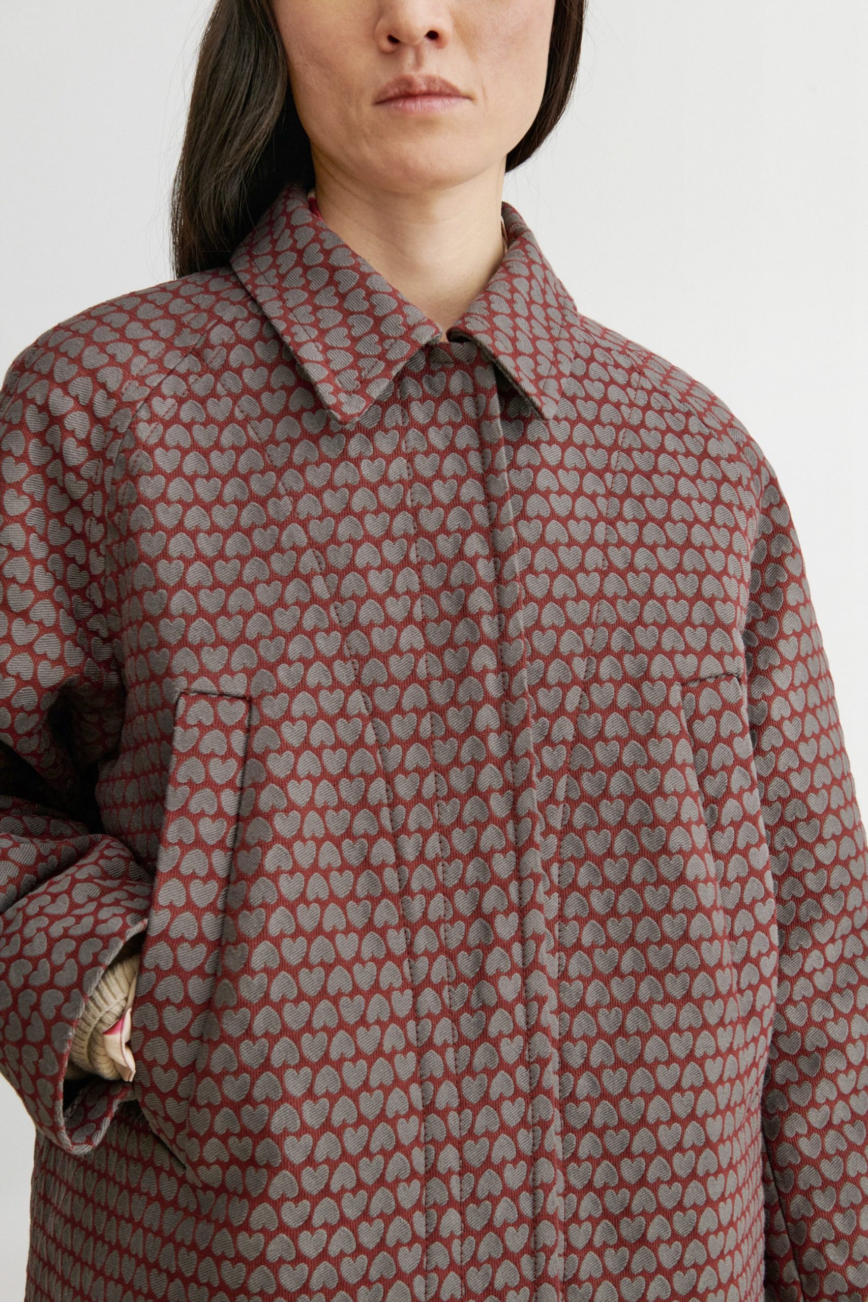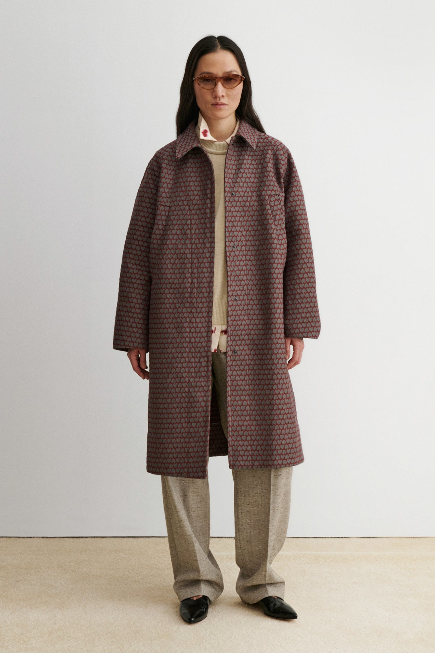 Long, textured jacquard coat with a relaxed fit and a classic collar. Cut to a straight-cut silhouette, with a concealed snap button front, and side welt pockets.