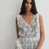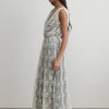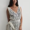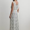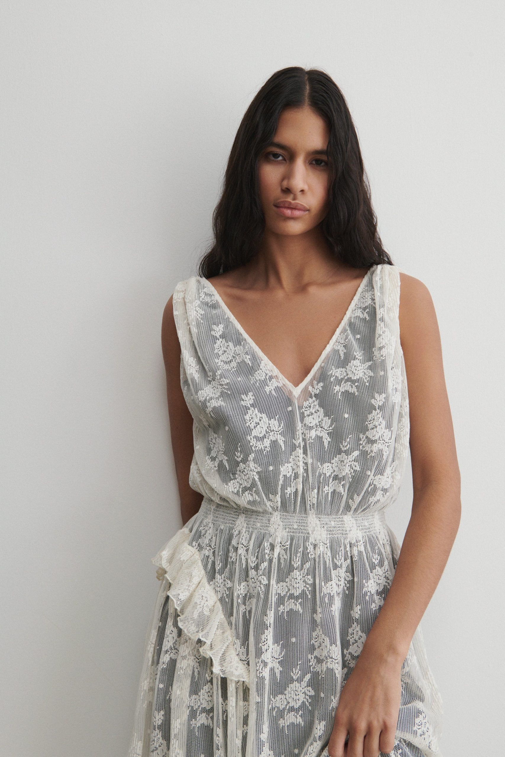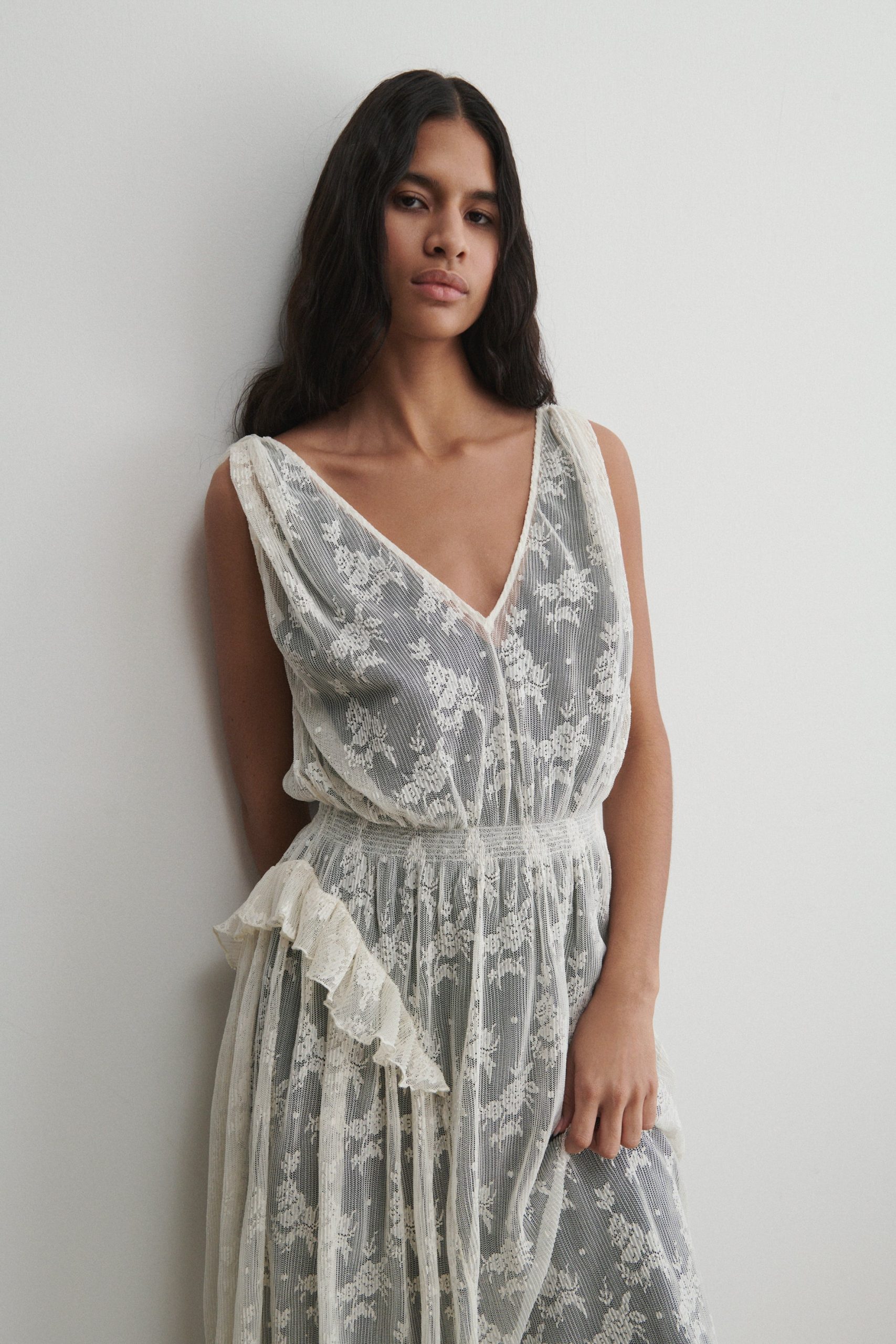 Sleeveless V-neck maxi dress with a smocked waist and ruffle details, crafted in a flowy pleated lace fabric.