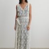 Sleeveless V-neck maxi dress with a smocked waist and ruffle details, crafted in a flowy pleated lace fabric.