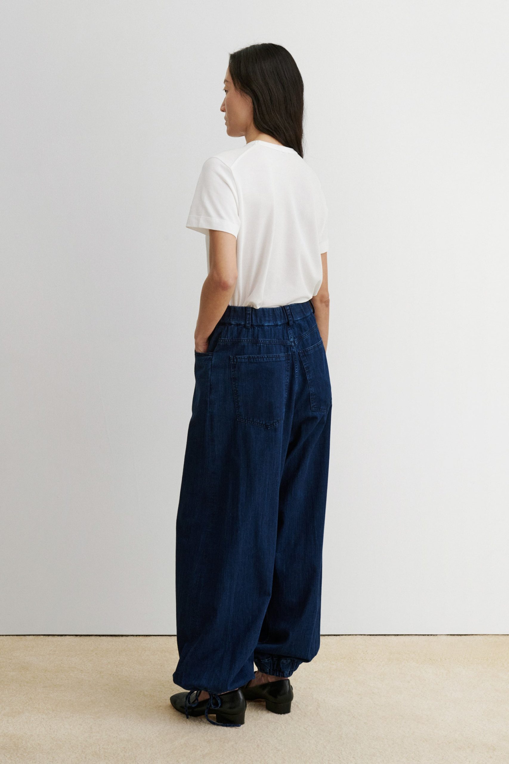 Relaxed-fit pants in ink wash denim. Designed with a high rise, zipper fly and button closure, and adjustable drawstring ties at the hem for a voluminous leg. Our denim collection is made in Los Angeles using premium Japanese denim.
