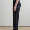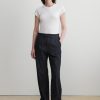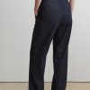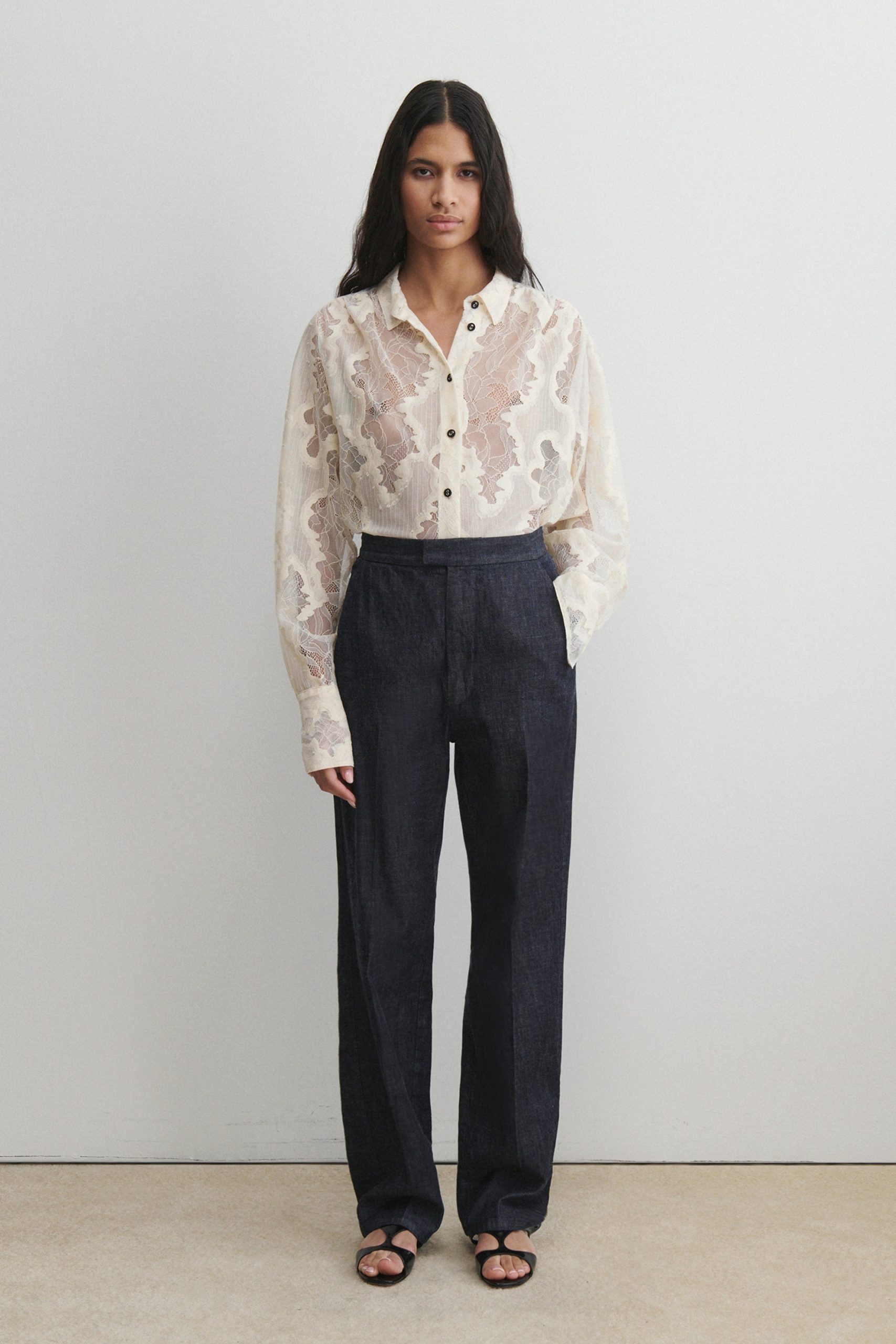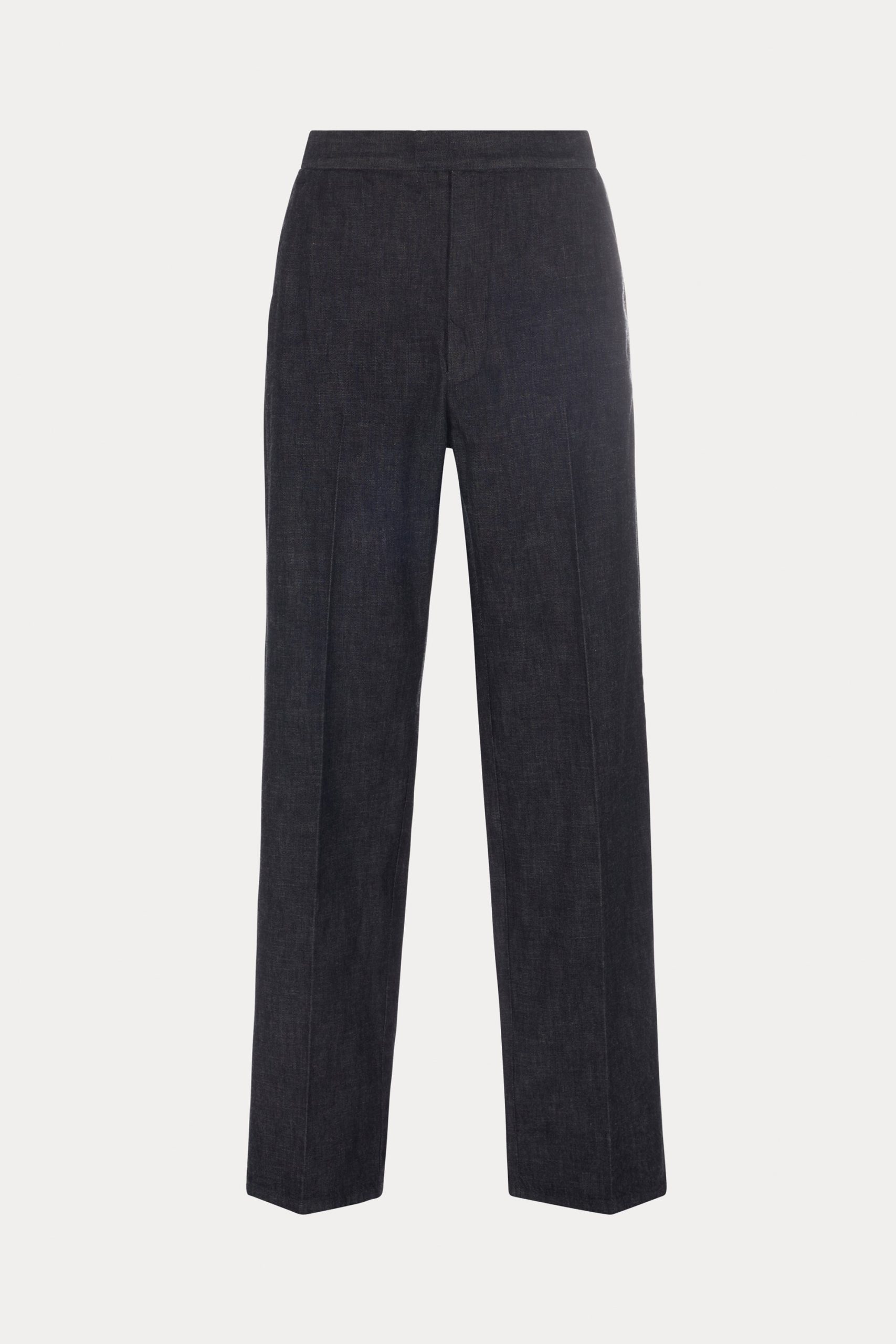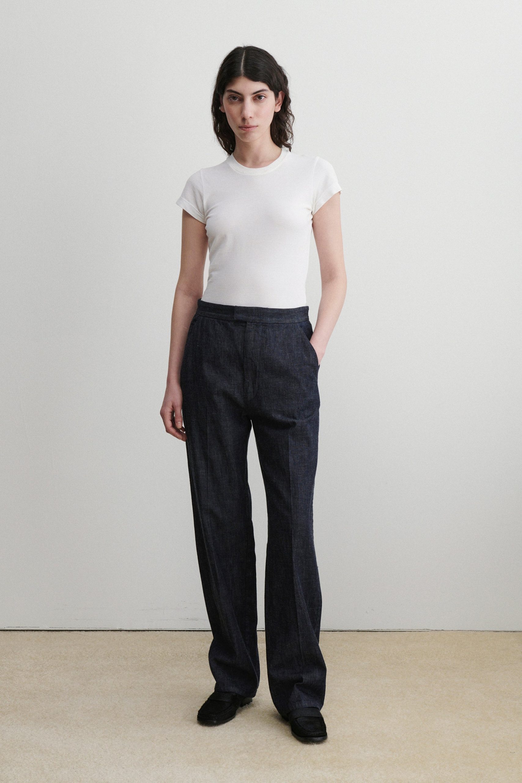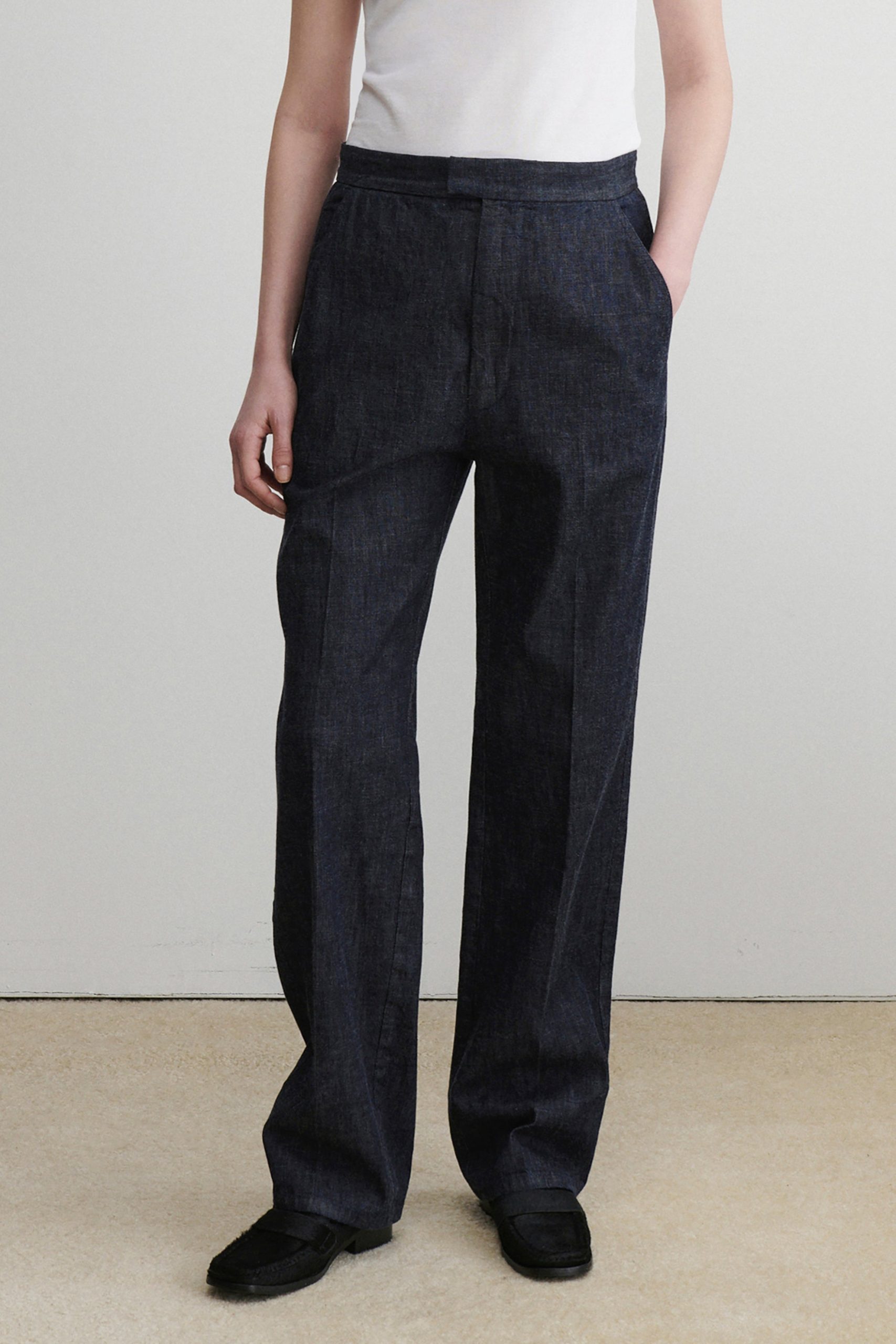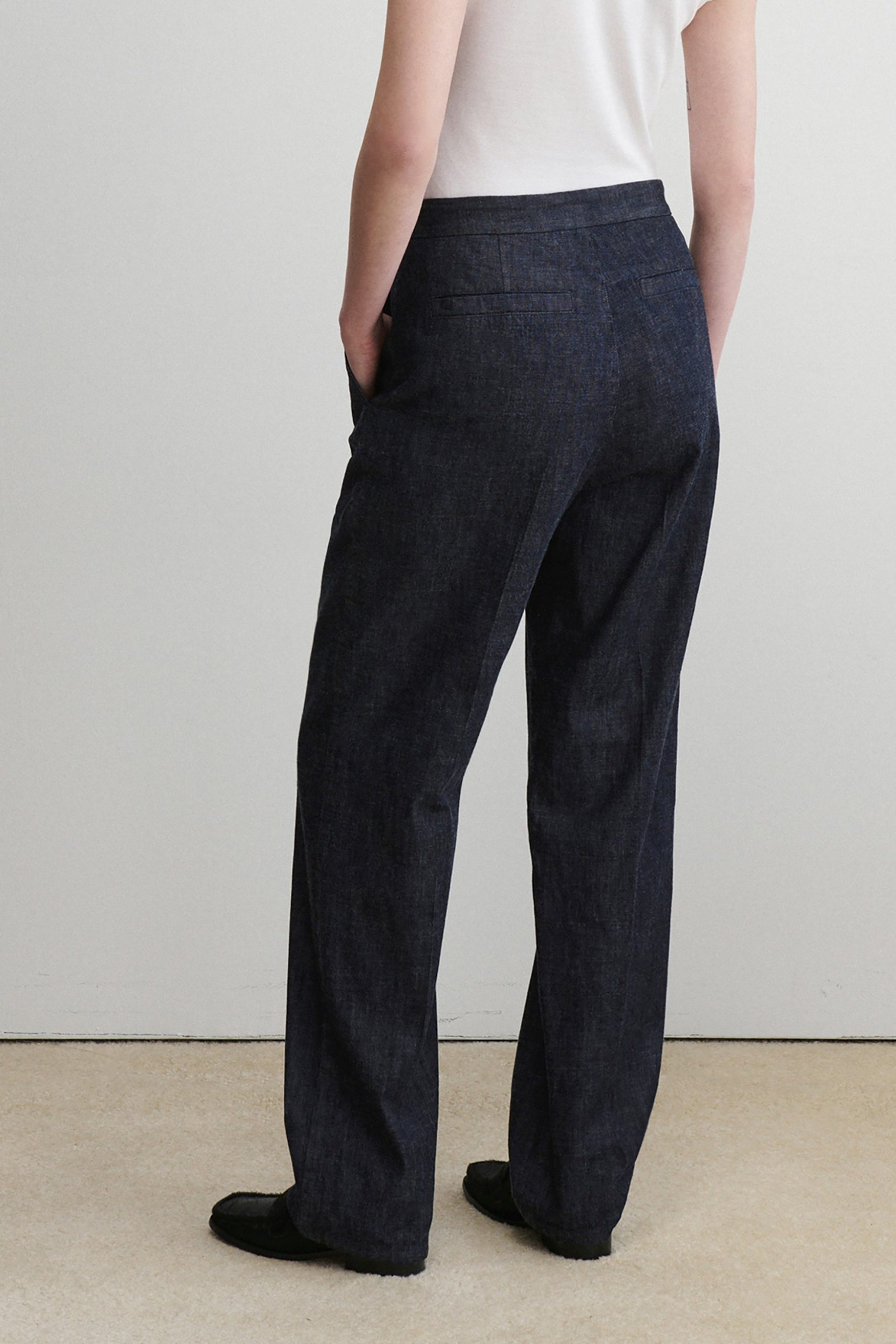 Relaxed-fit, trouser-style pants with a straight leg design and a waistband with a tab and concealed zipper closure, crafted in indigo Raw Vista Denim. Features a side slip and rear welt pockets.