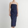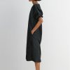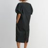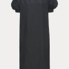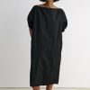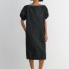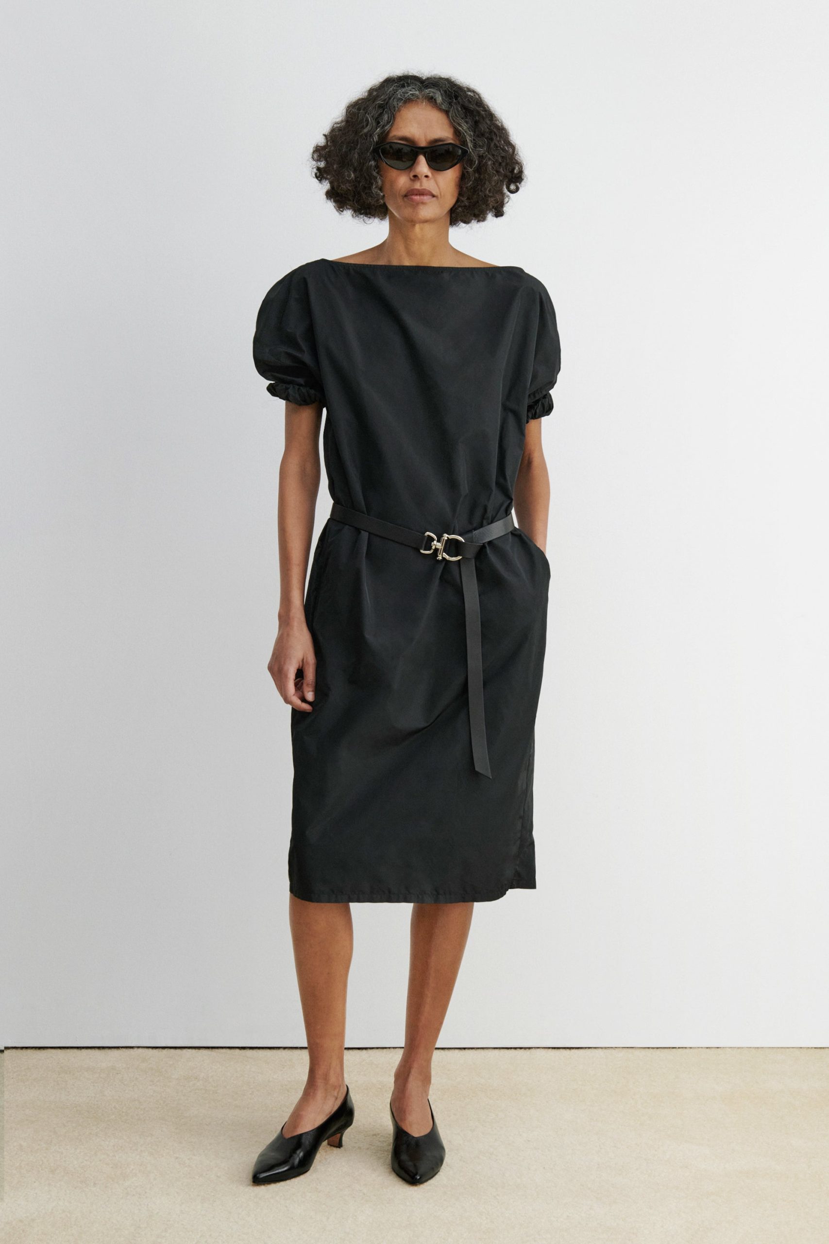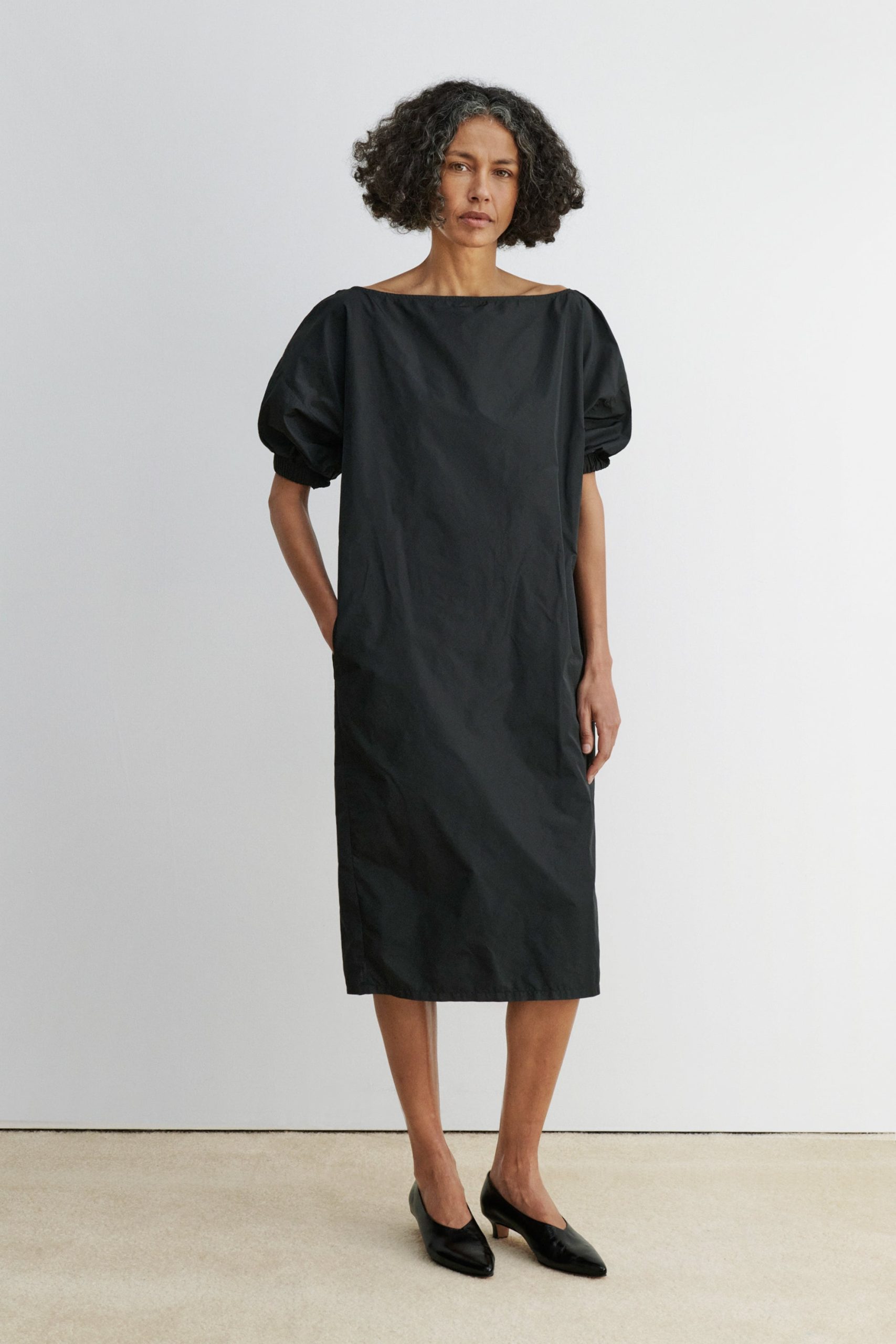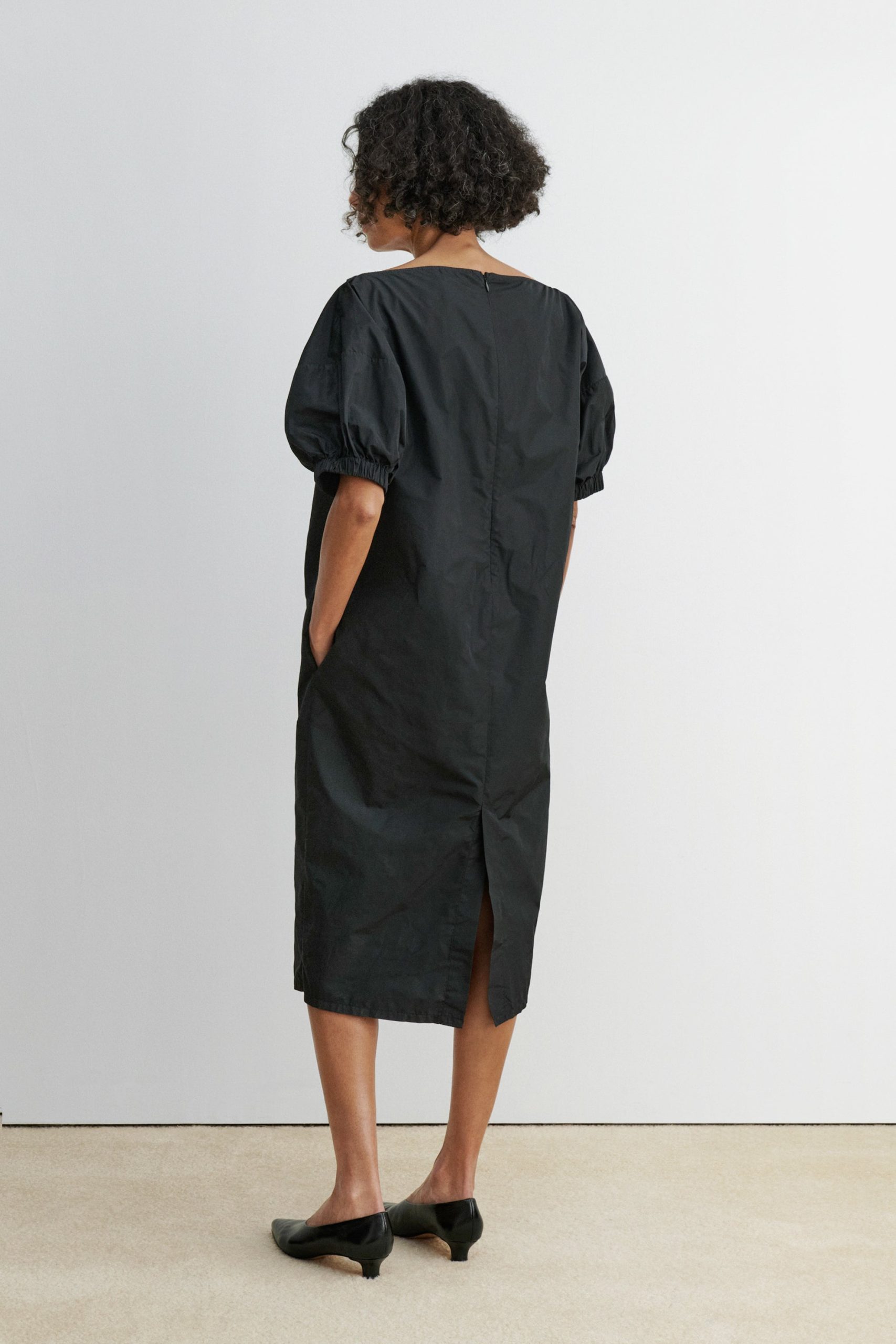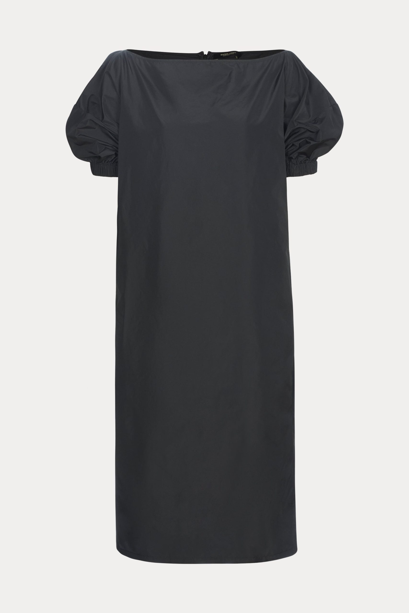 Short-sleeve midi dress in a lightweight, water-resistant taffeta, featuring a boat neckline and straight-cut silhouette. Voluminous sleeves are designed with an elasticized hem for a gathered effect. Perfect for casual wear.