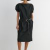 Short-sleeve midi dress in a lightweight, water-resistant taffeta, featuring a boat neckline and straight-cut silhouette. Voluminous sleeves are designed with an elasticized hem for a gathered effect. Perfect for casual wear.