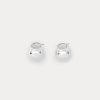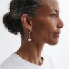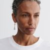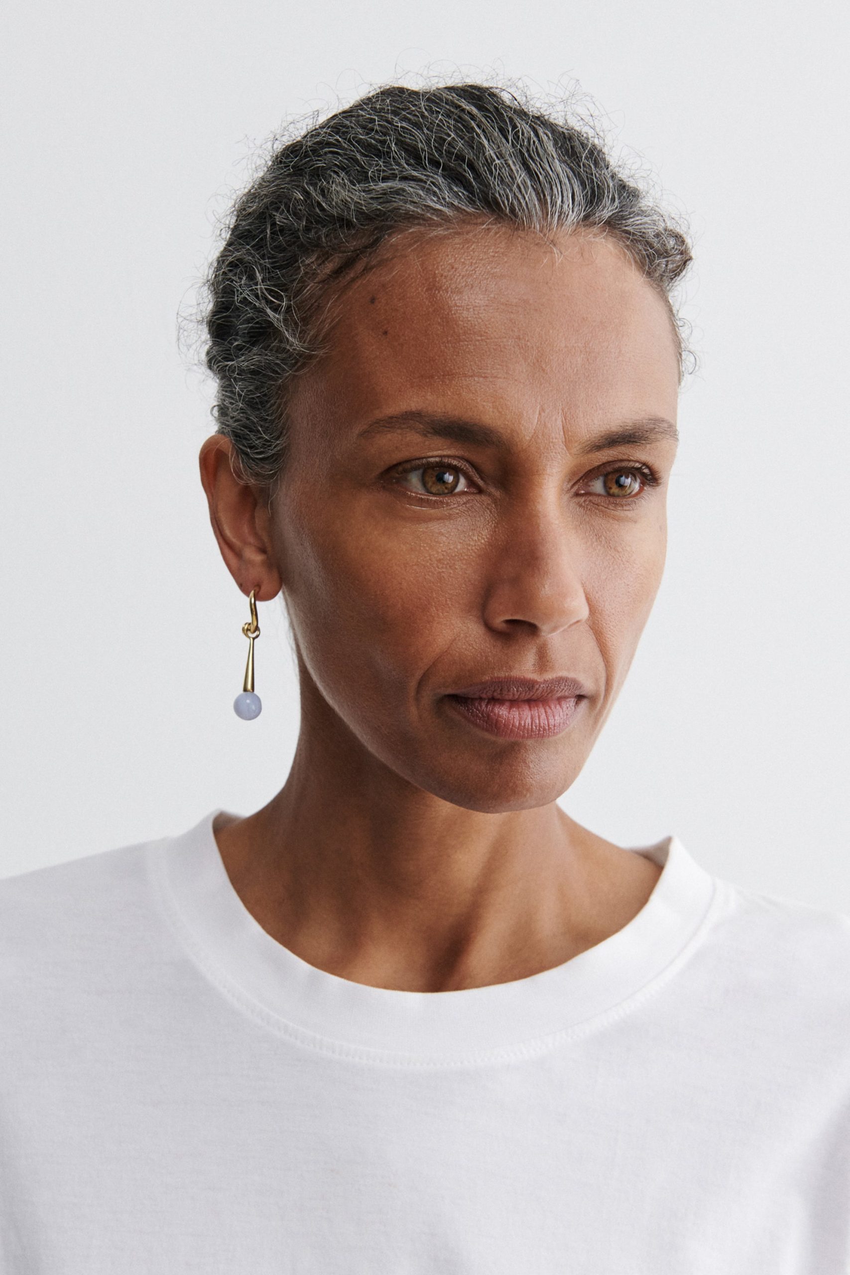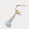 Brass drop earrings with polished Blue Lace Agate stones suspended from a conical brass bar. Quarry jewelry is handmade in New York City by Ninh Wysocan.