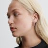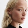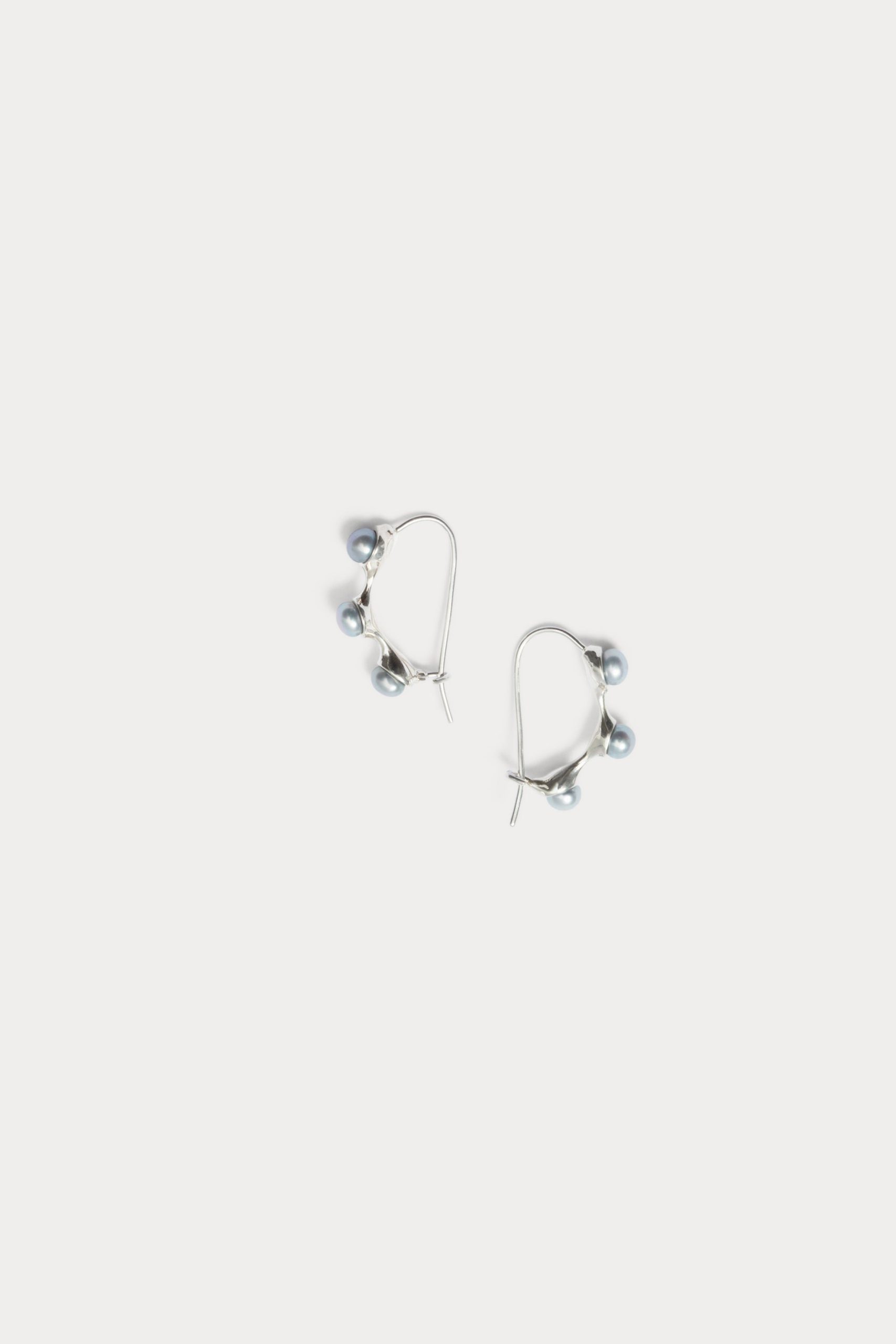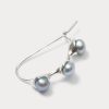 Silver hoop earrings with three gray pearls and a delicate hook clasp. Quarry jewelry is handmade in New York City by Ninh Wysocan.