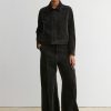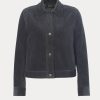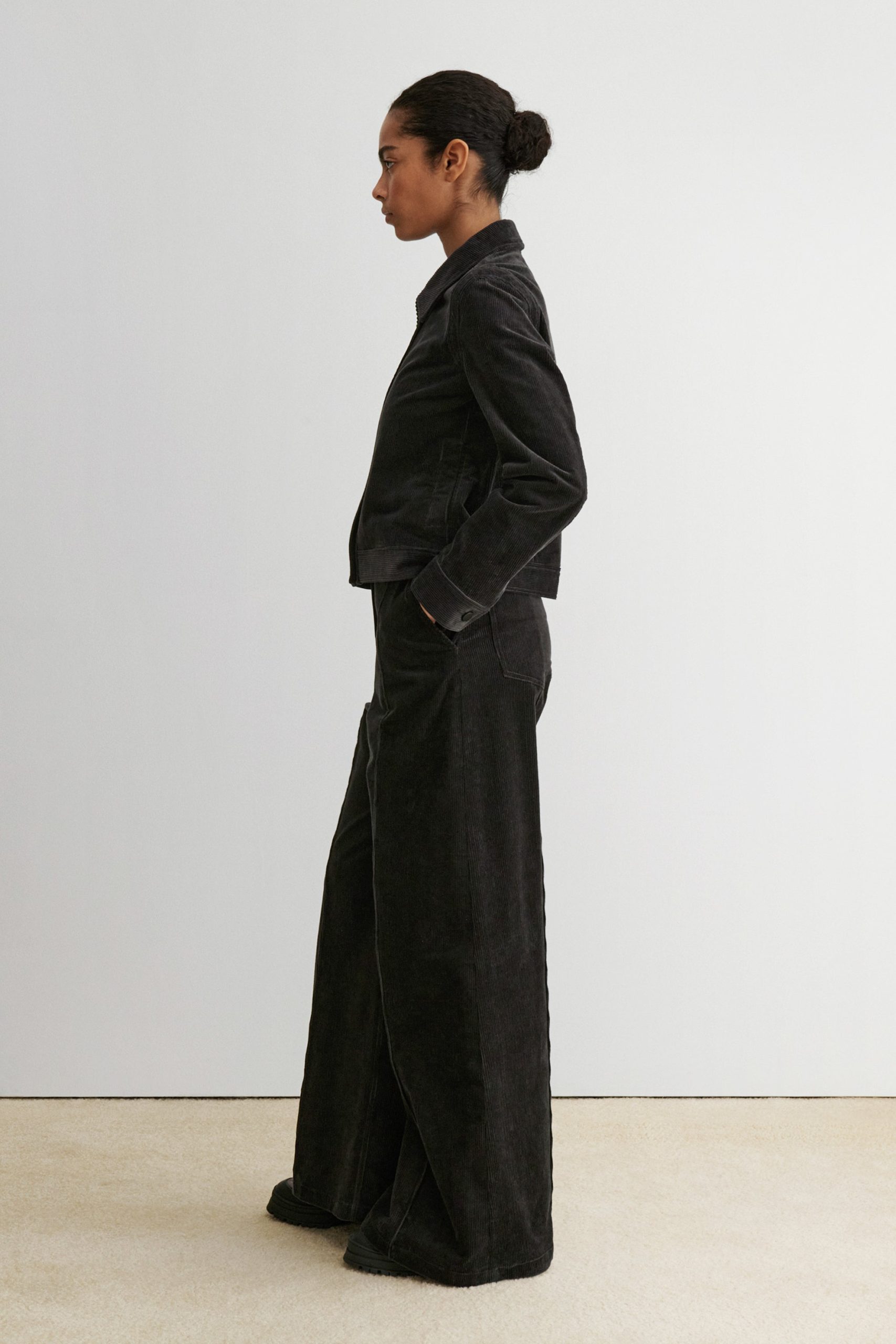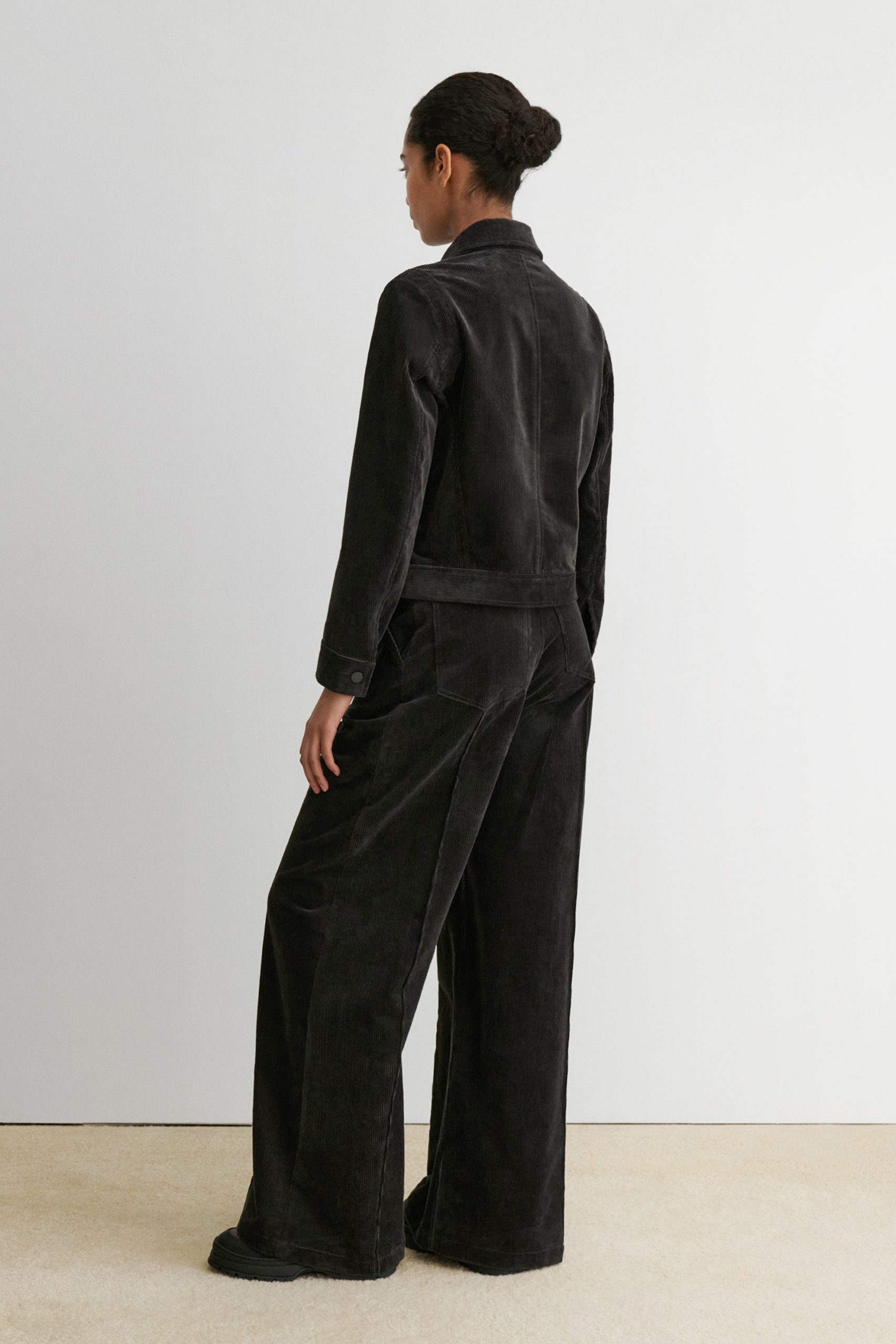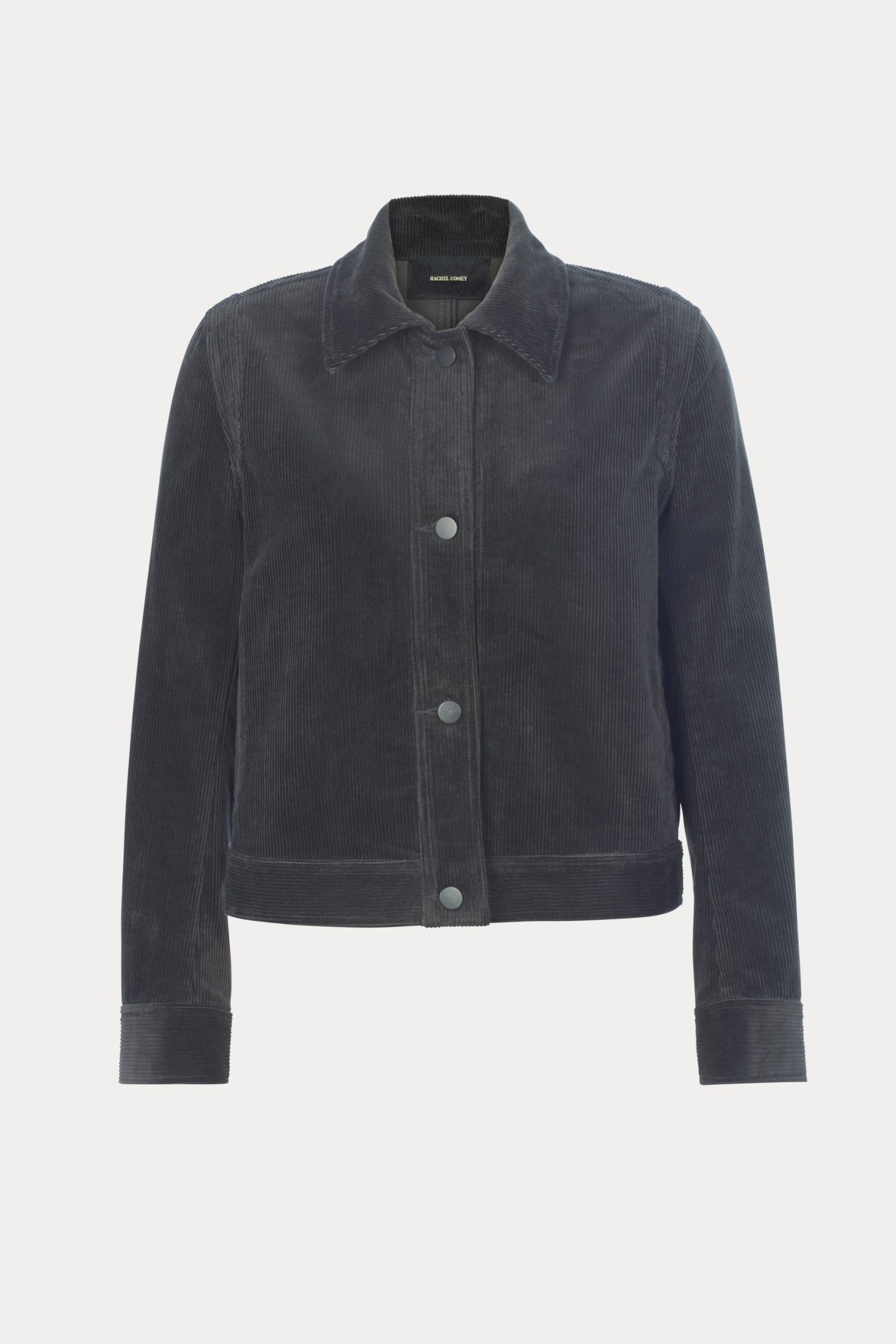 Boxy spread collar jacket with snap button closure in stretchy tailored cotton corduroy.