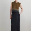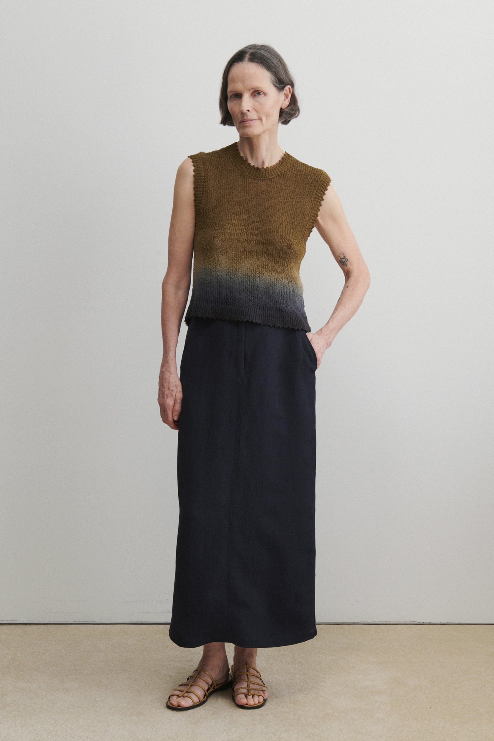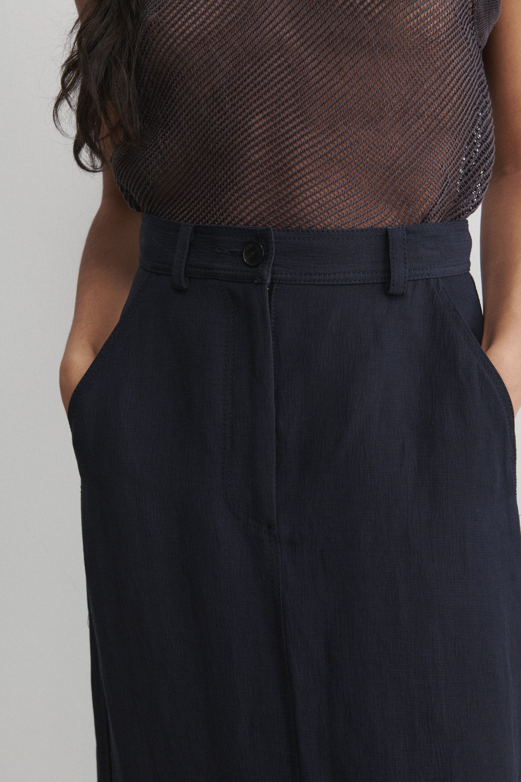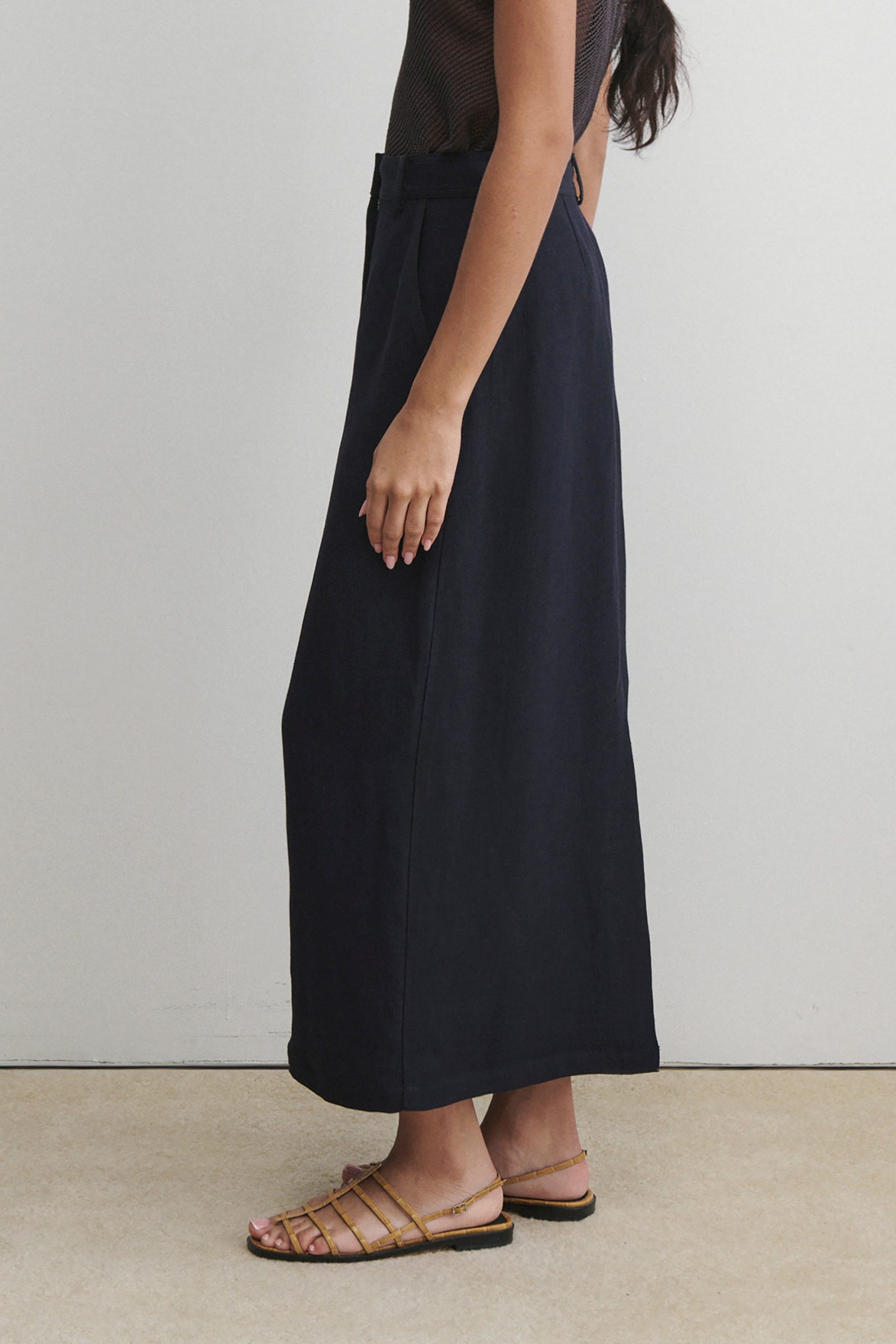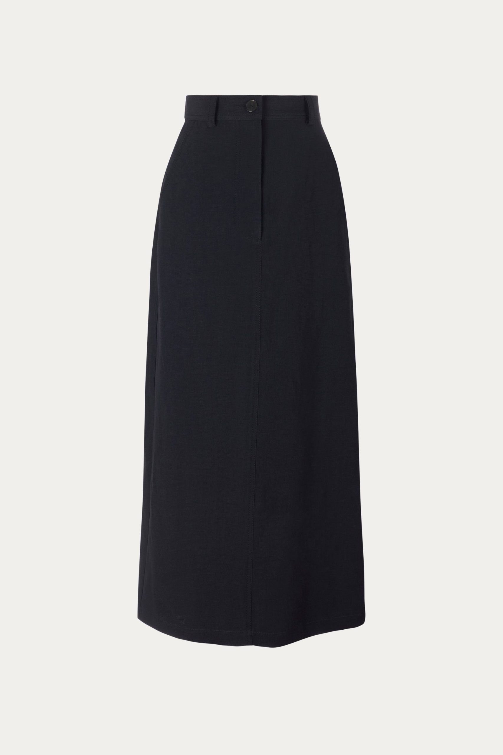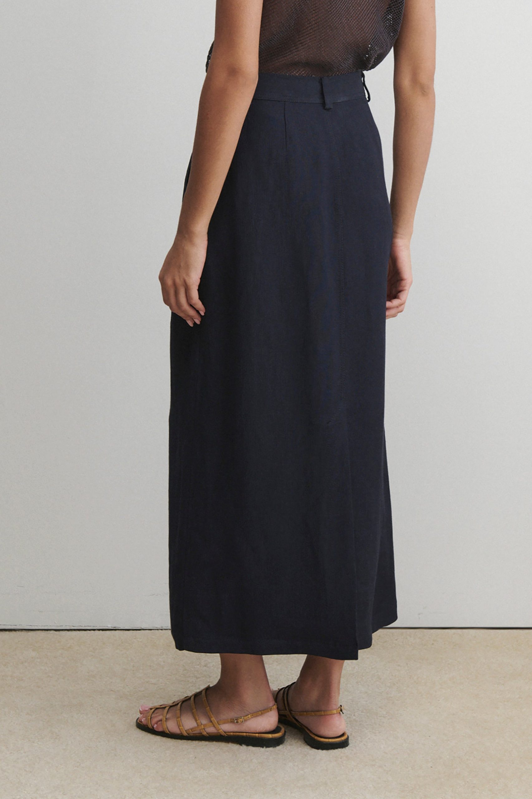 Long, straight, tailored skirt, in our exclusive textured Cresposo linen. Features exaggerated pockets, a slit at the back for ease of movement, and a double needle stritch finish for a denim-like look. Wear as a suit with our matching Rior Blazer.