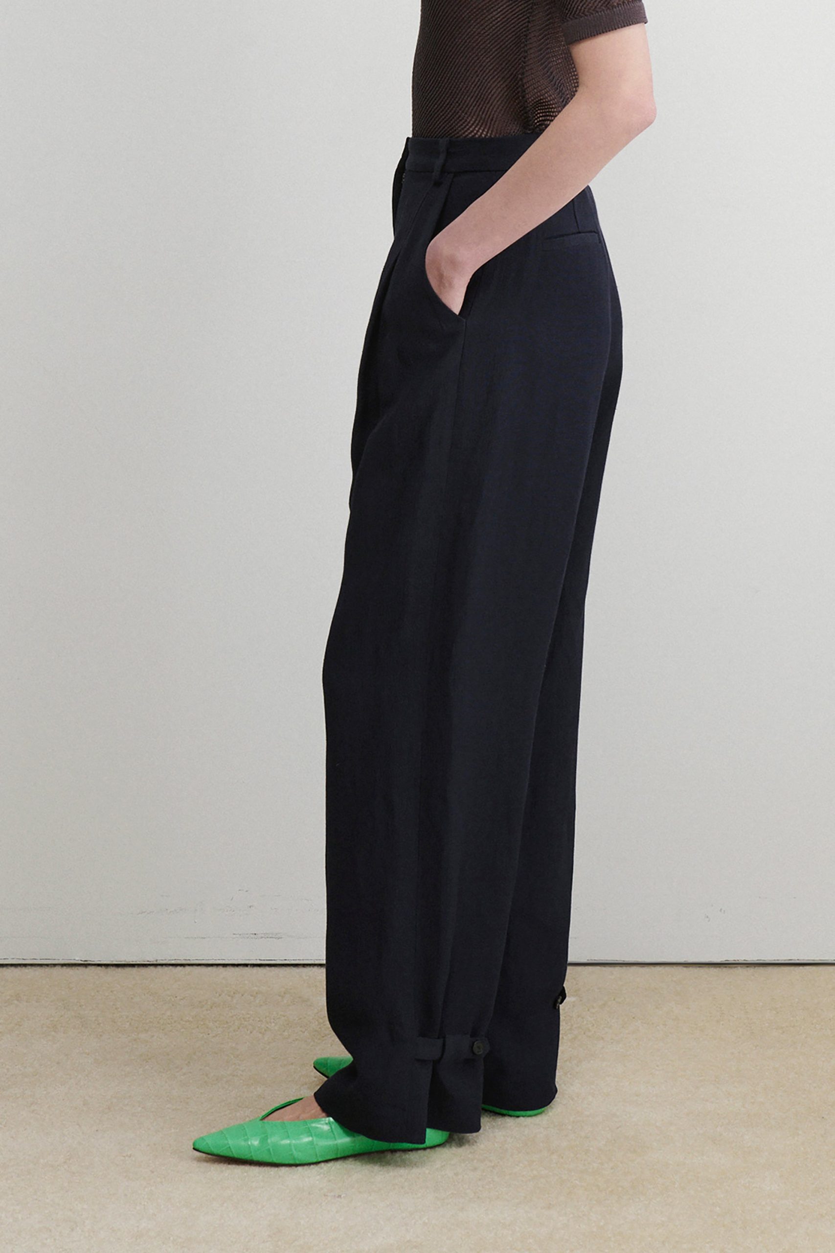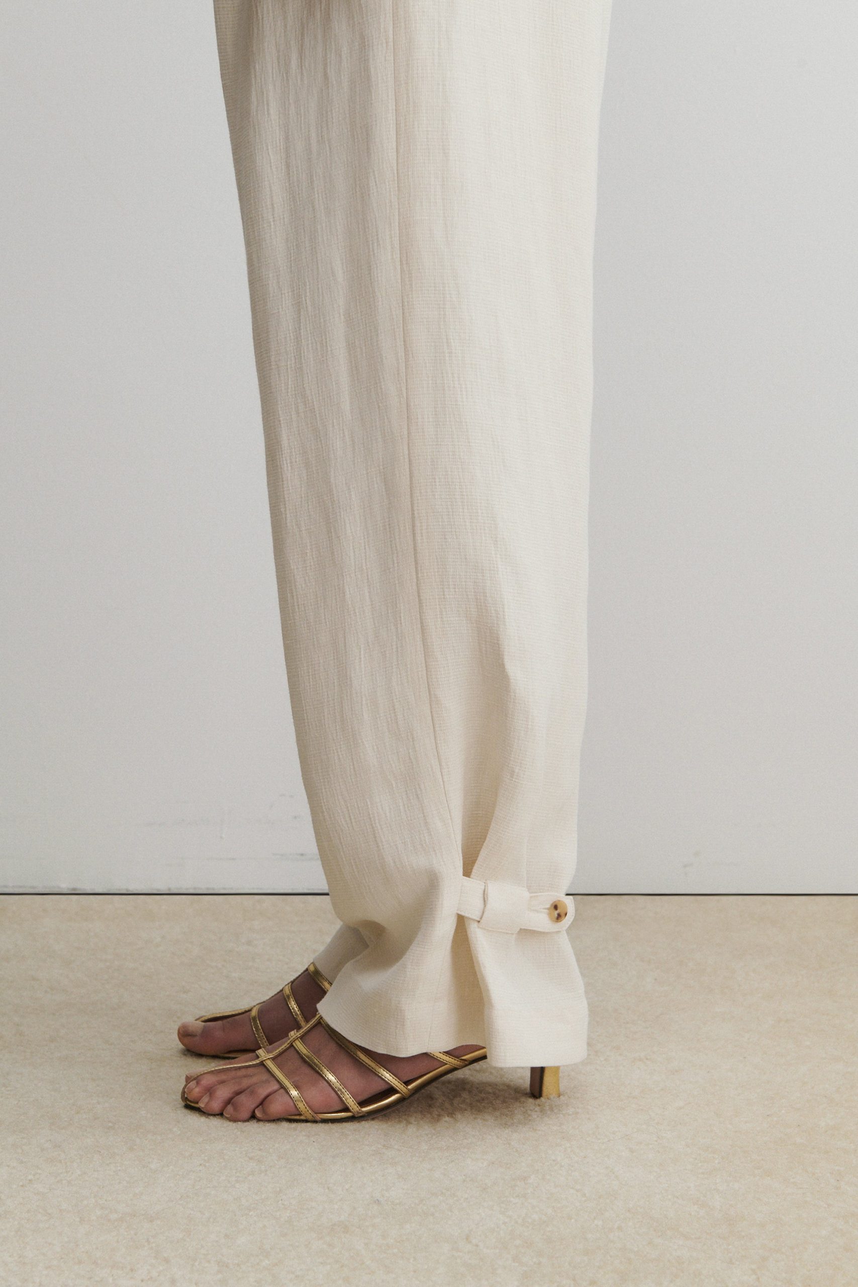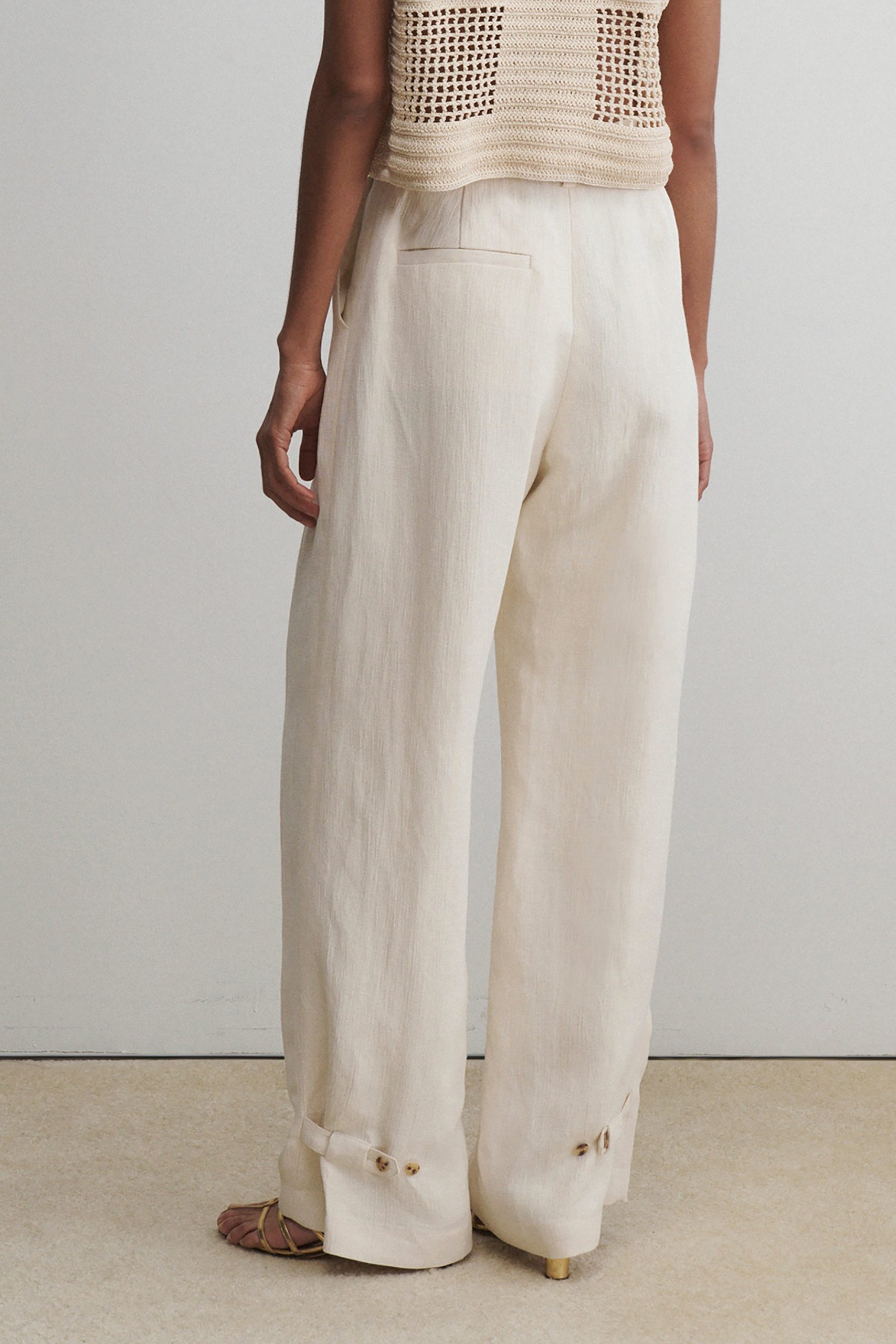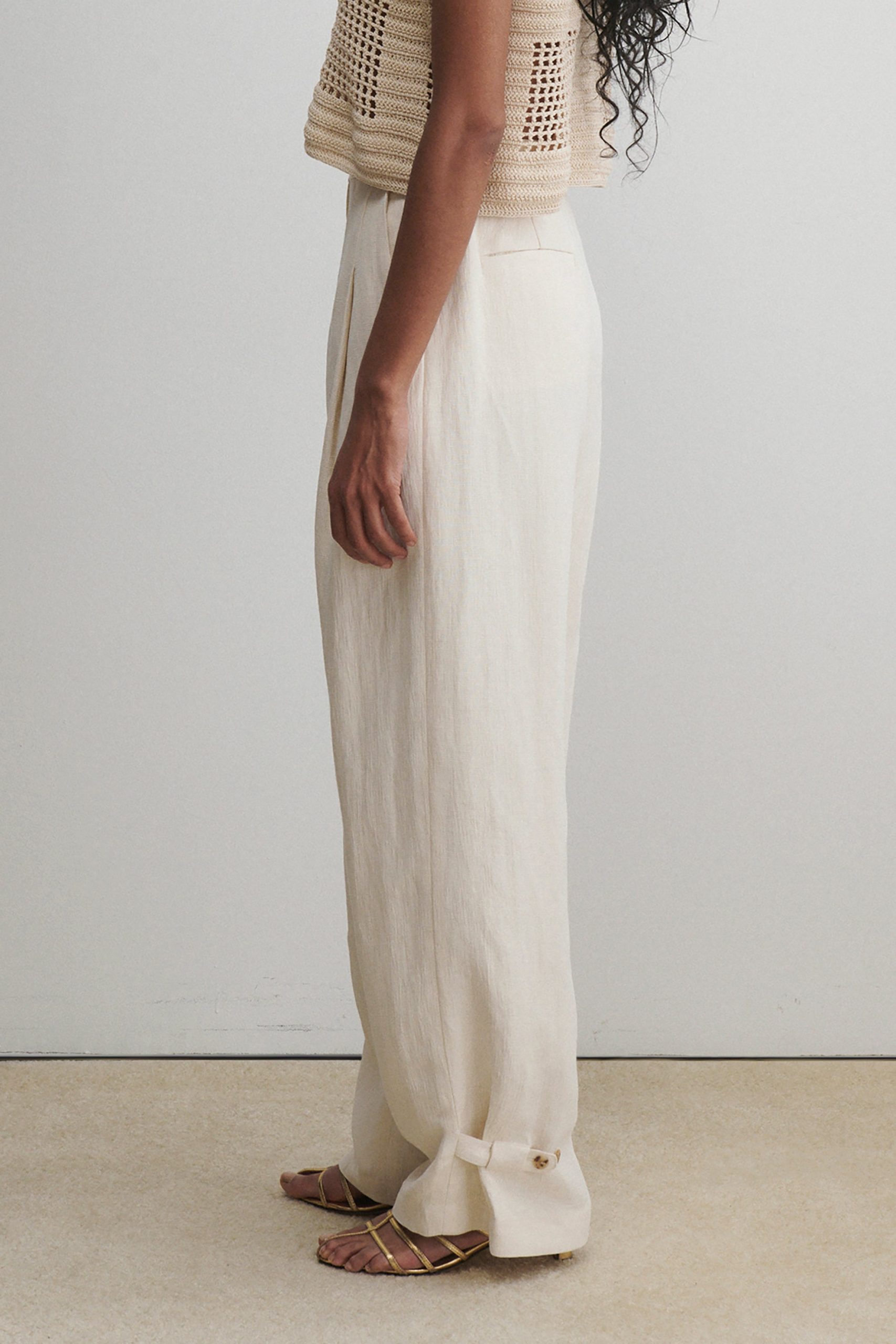 Pleat-front high-waisted pants with a wide leg, in our textured viscose Cresposo linen. Button tie tabs at the back of the ankle create a subtle taper at the ankle, accentuating the voluminous silhouette. Wear with the matching Labriola Top for a monochrome look.