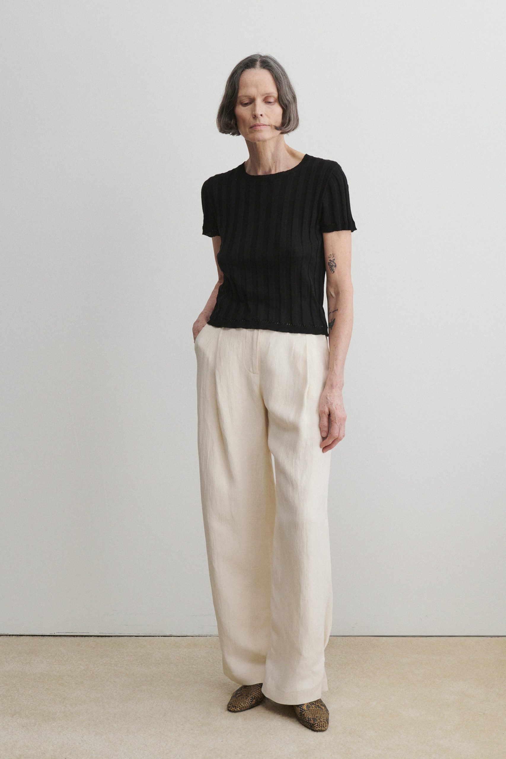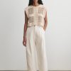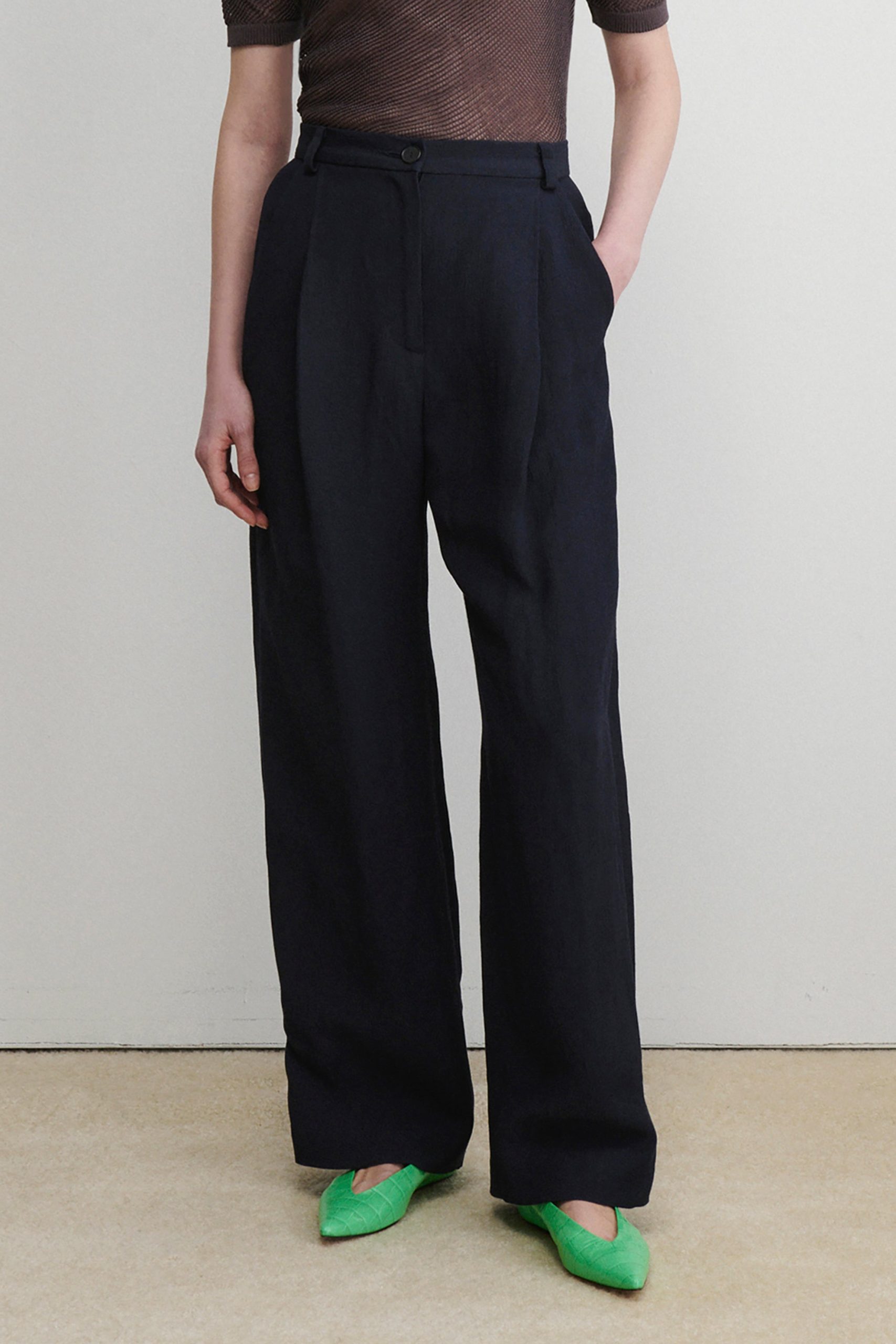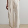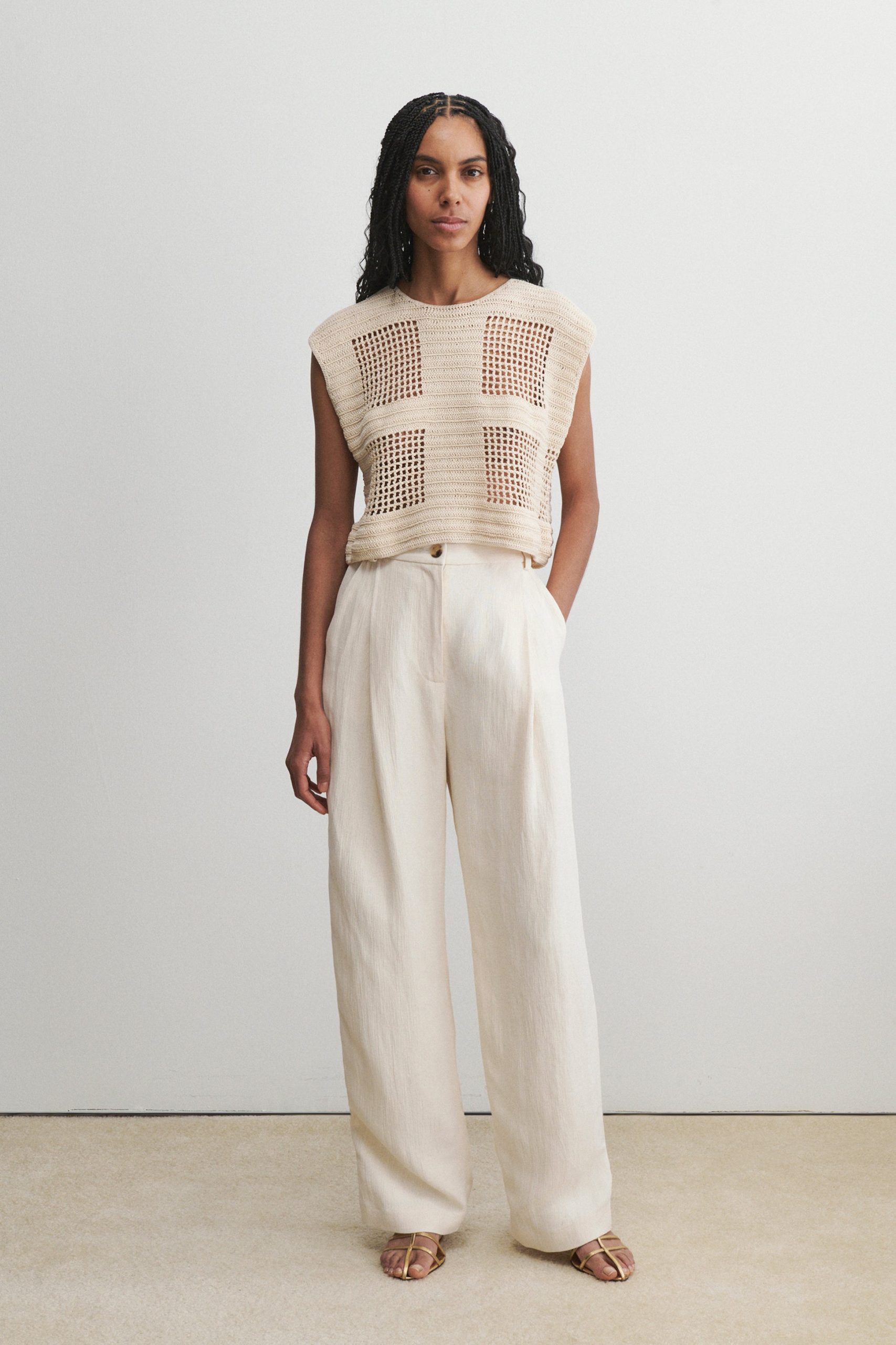 Pleat-front high-waisted pants with a wide leg, in our textured viscose Cresposo linen. Button tie tabs at the back of the ankle create a subtle taper at the ankle, accentuating the voluminous silhouette. Wear with the matching Labriola Top for a monochrome look.