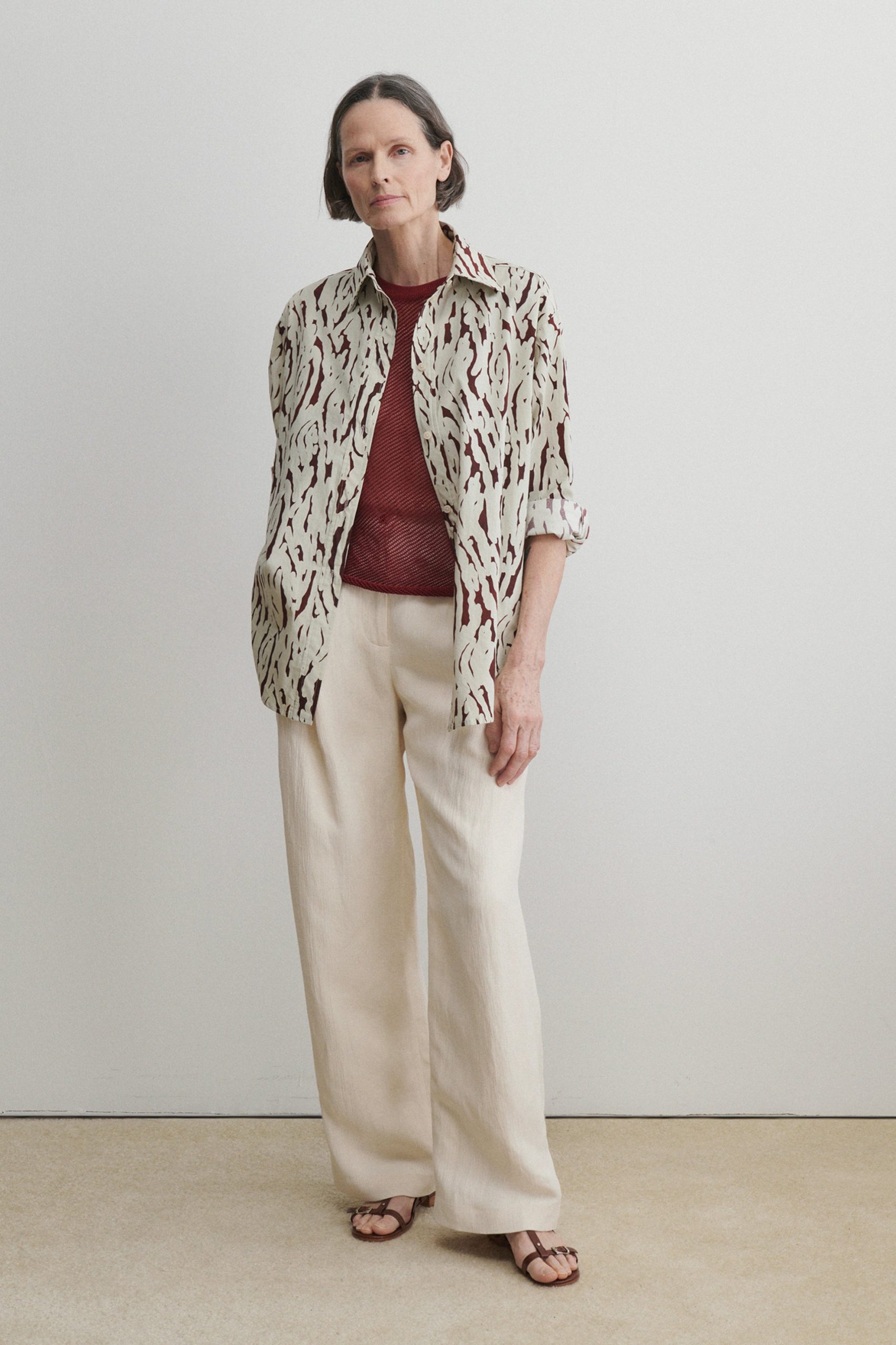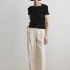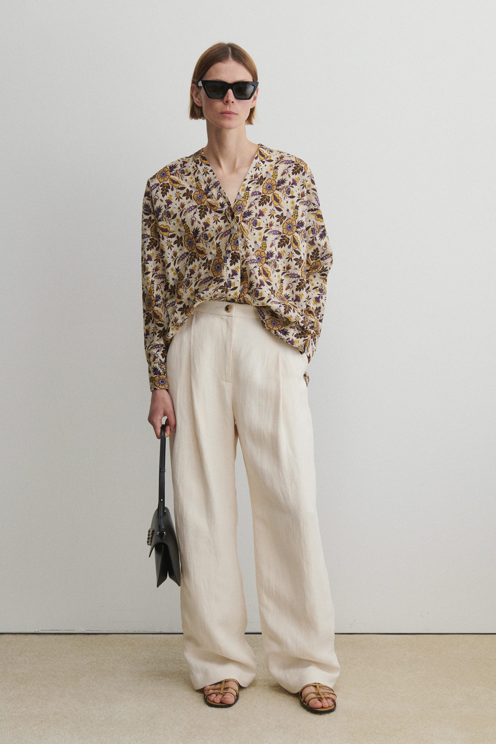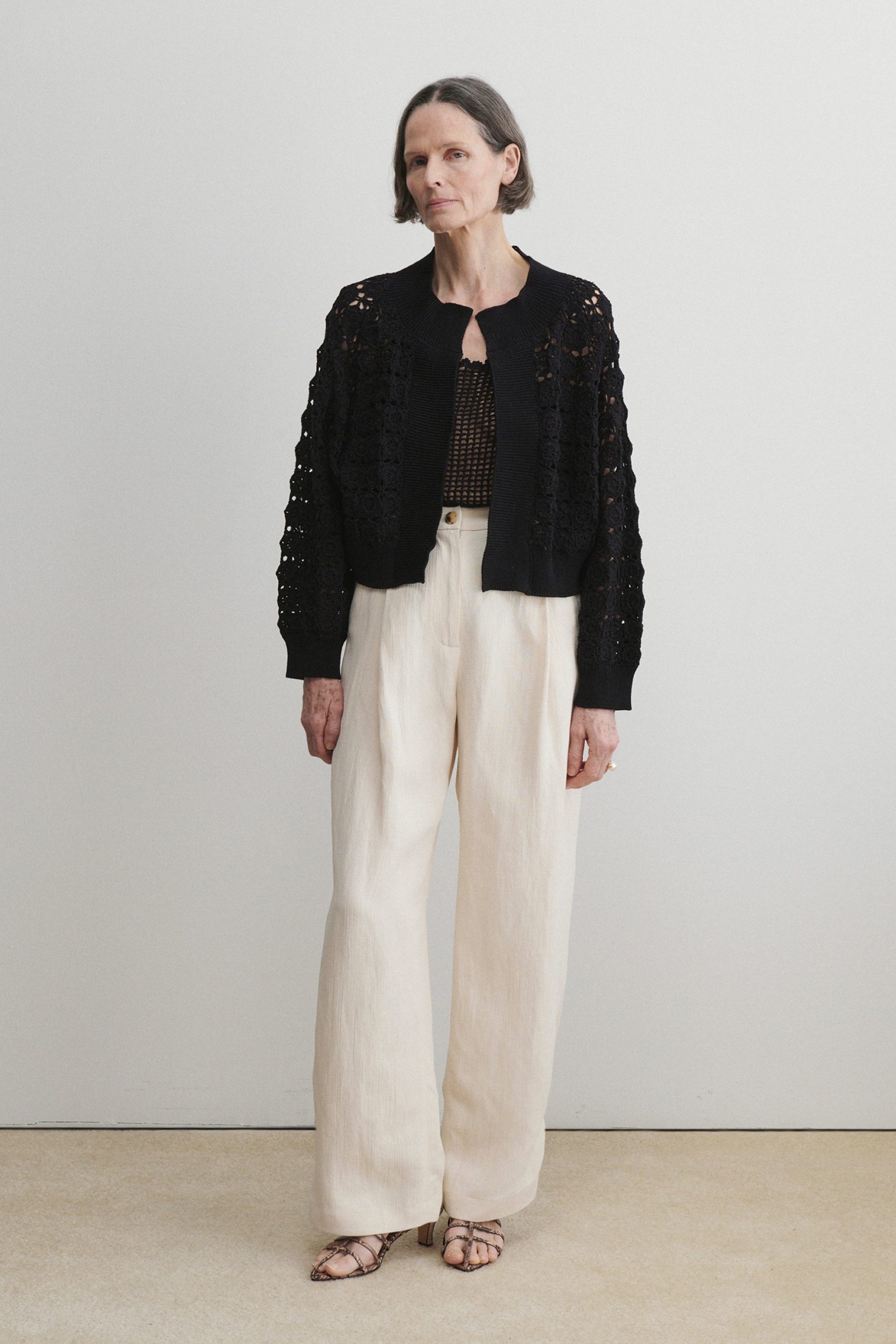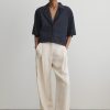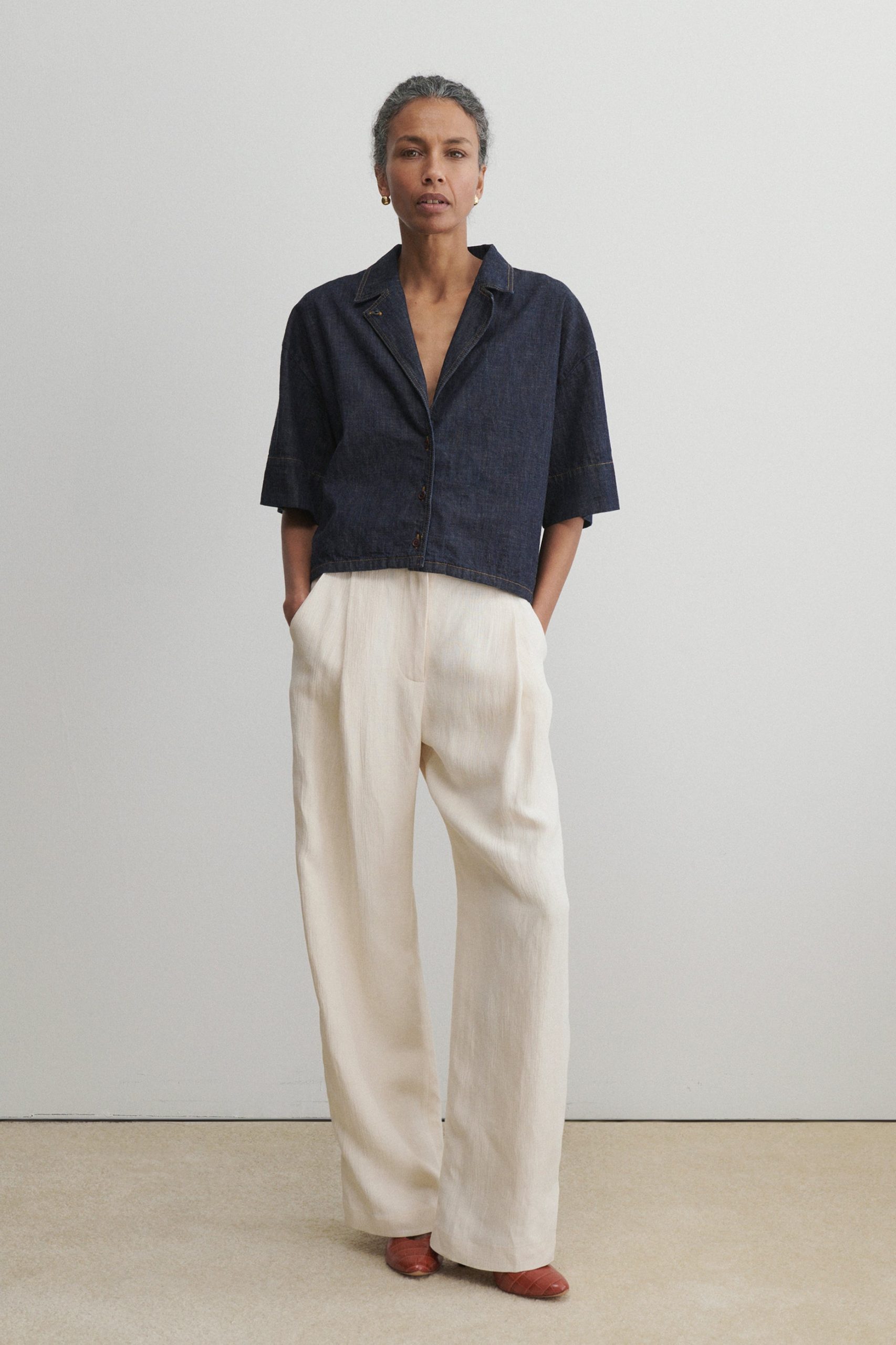 Pleat-front high-waisted pants with a wide leg, in our textured viscose Cresposo linen. Button tie tabs at the back of the ankle create a subtle taper at the ankle, accentuating the voluminous silhouette. Wear with the matching Labriola Top for a monochrome look.