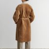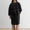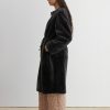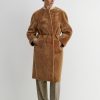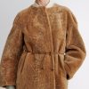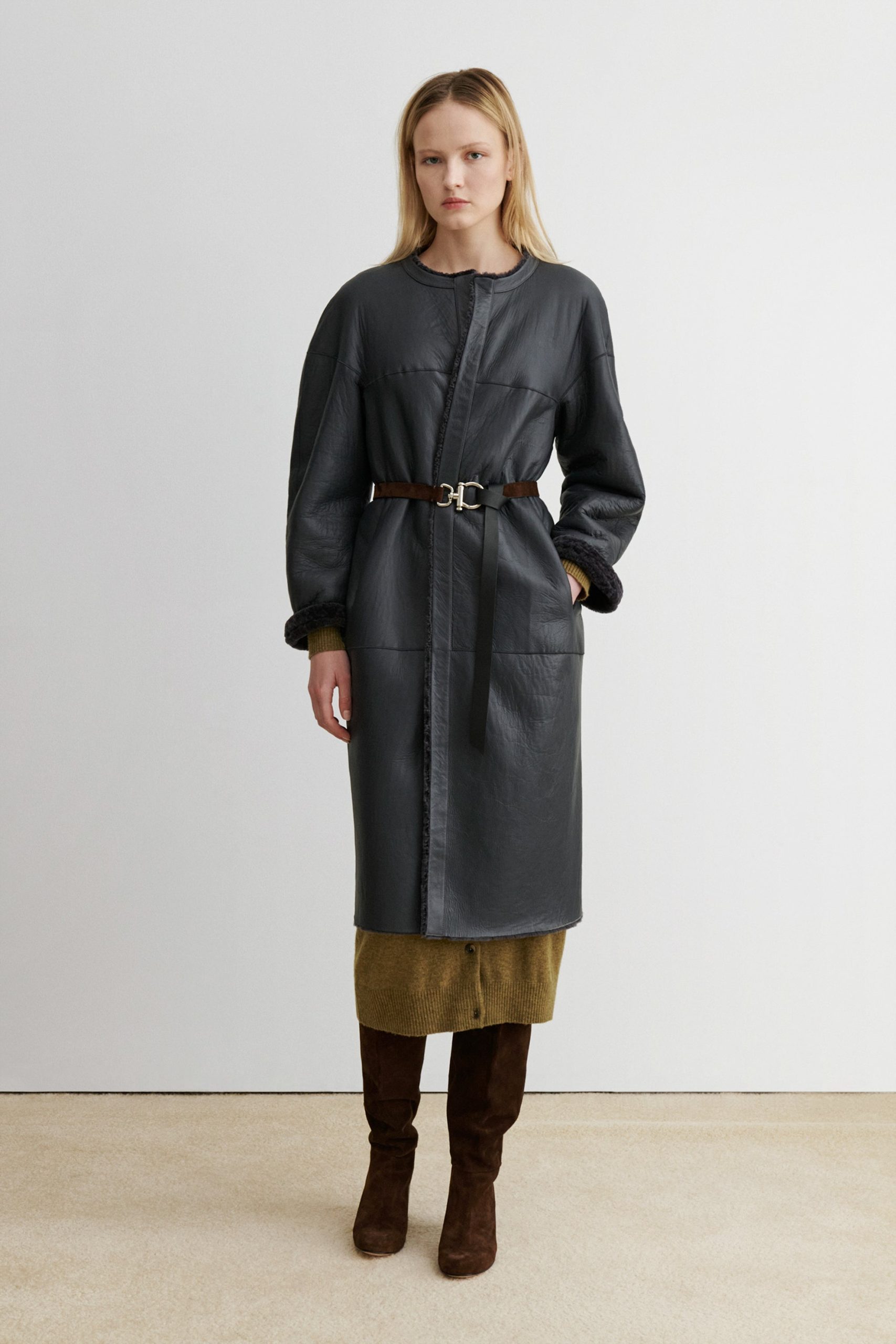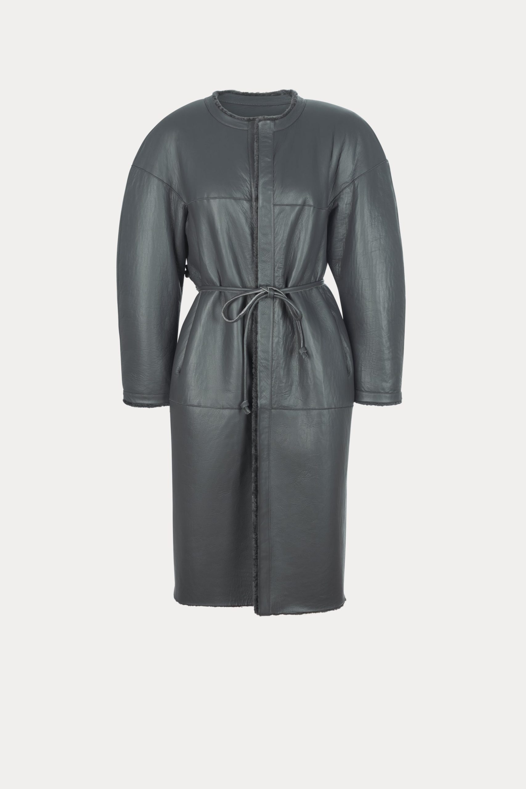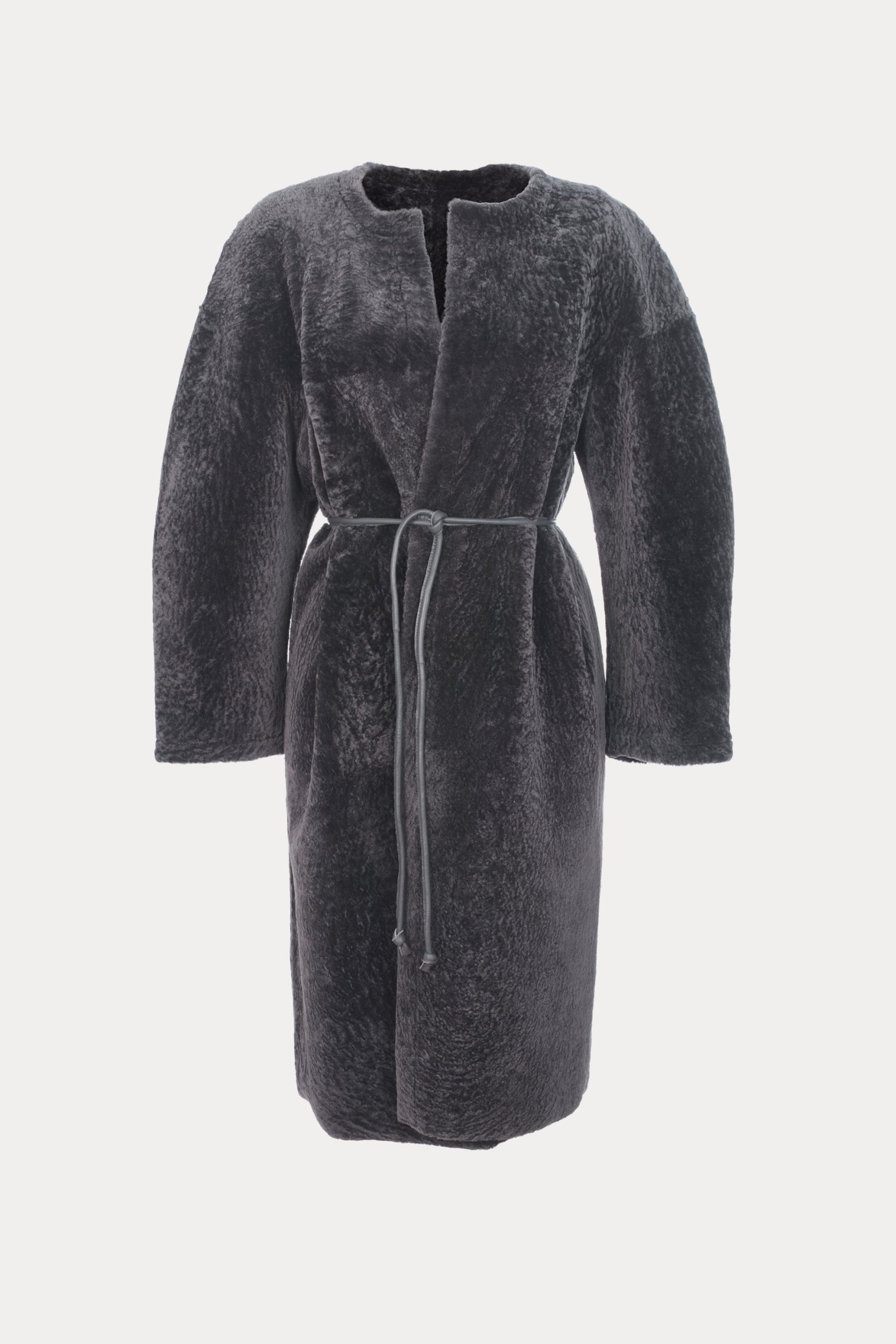 Reversible crew-neck wrap coat cut from ultra-soft shaved shearling. Features front pockets and a self-tie belt for a customizable fit.