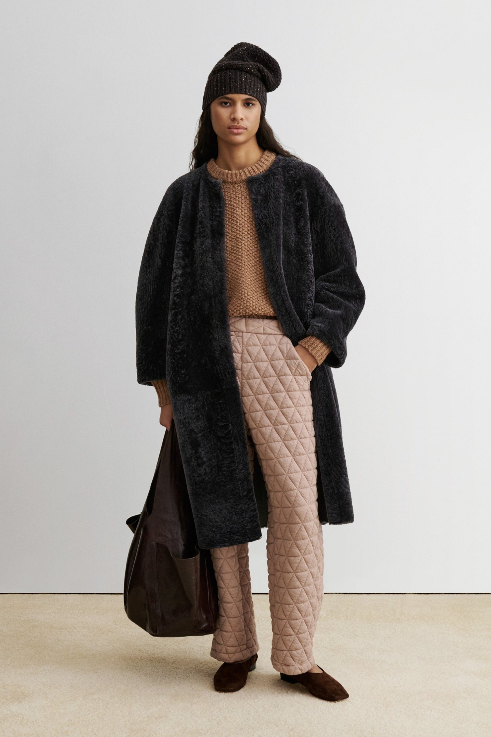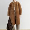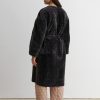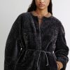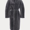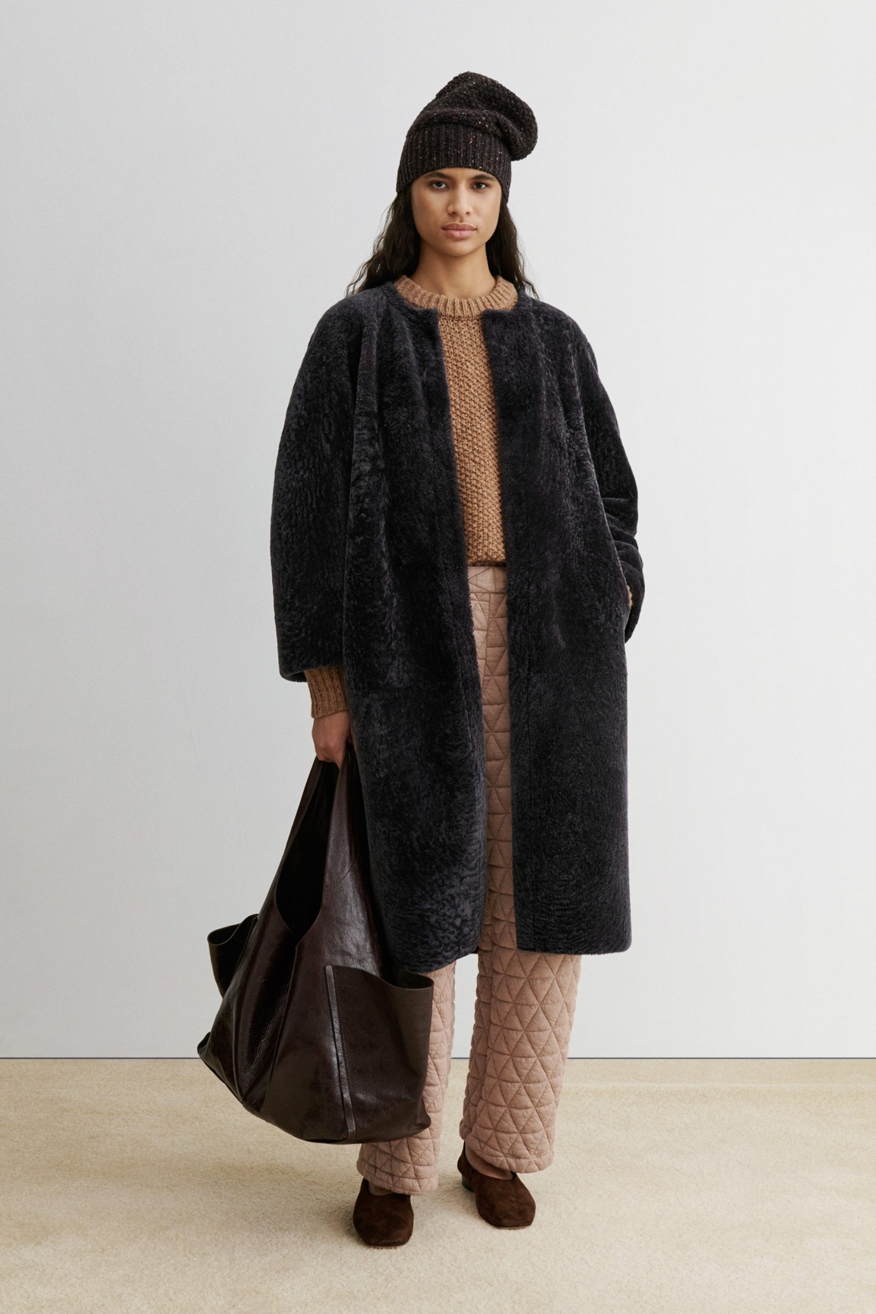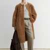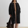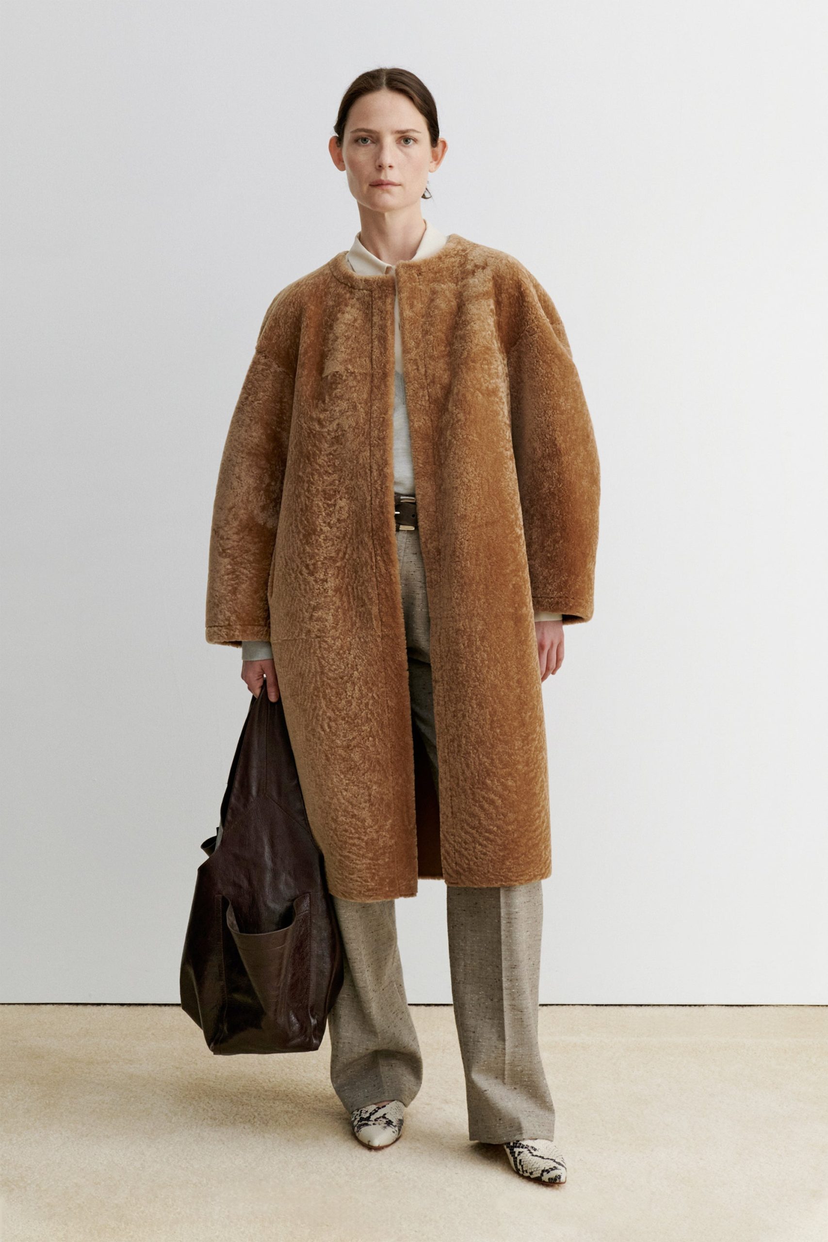 Reversible crew-neck wrap coat cut from ultra-soft shaved shearling. Features front pockets and a self-tie belt for a customizable fit.