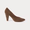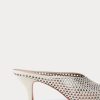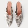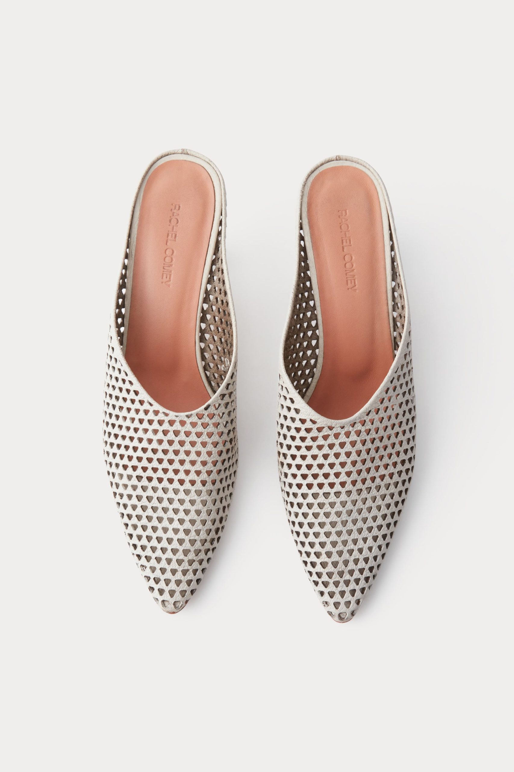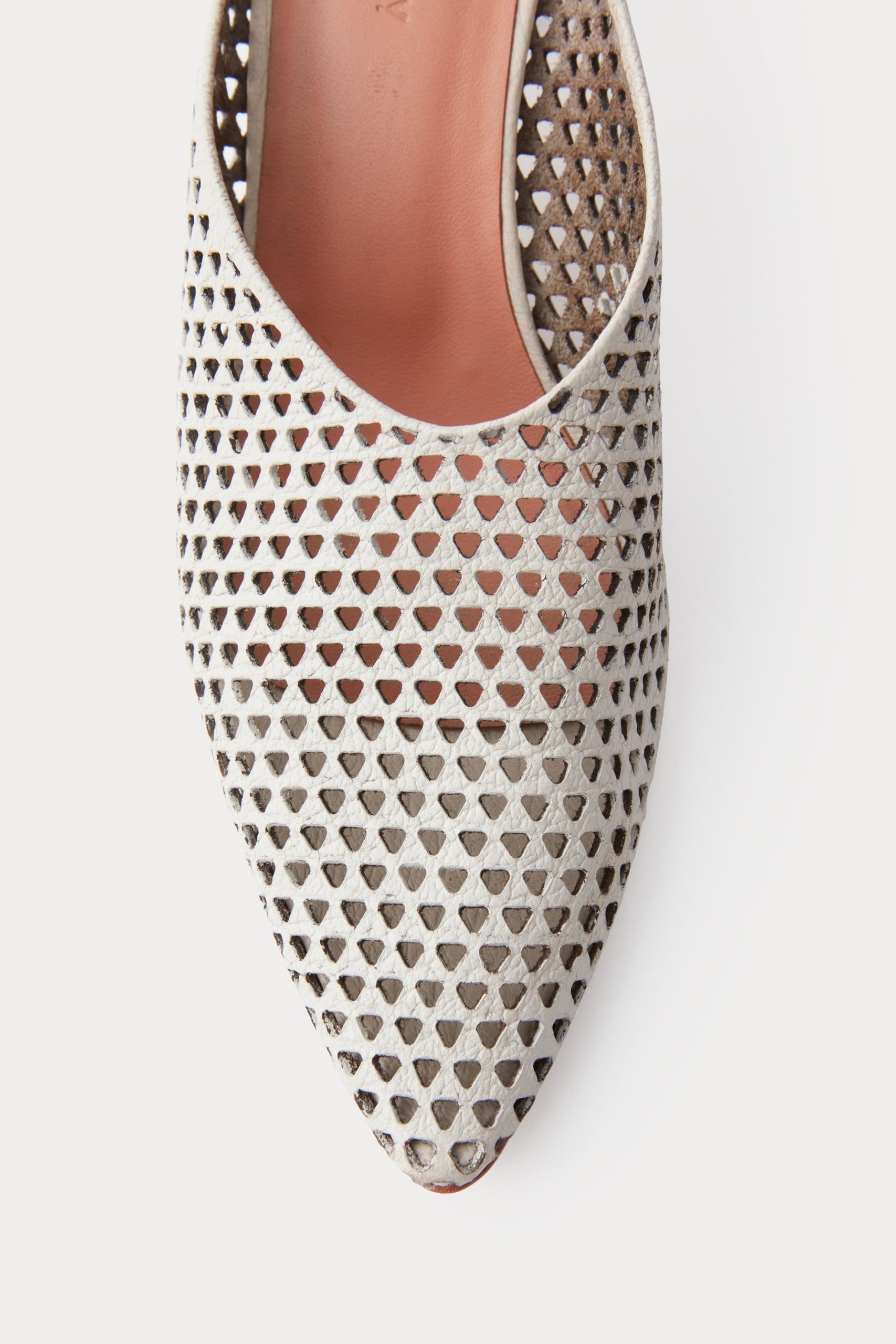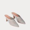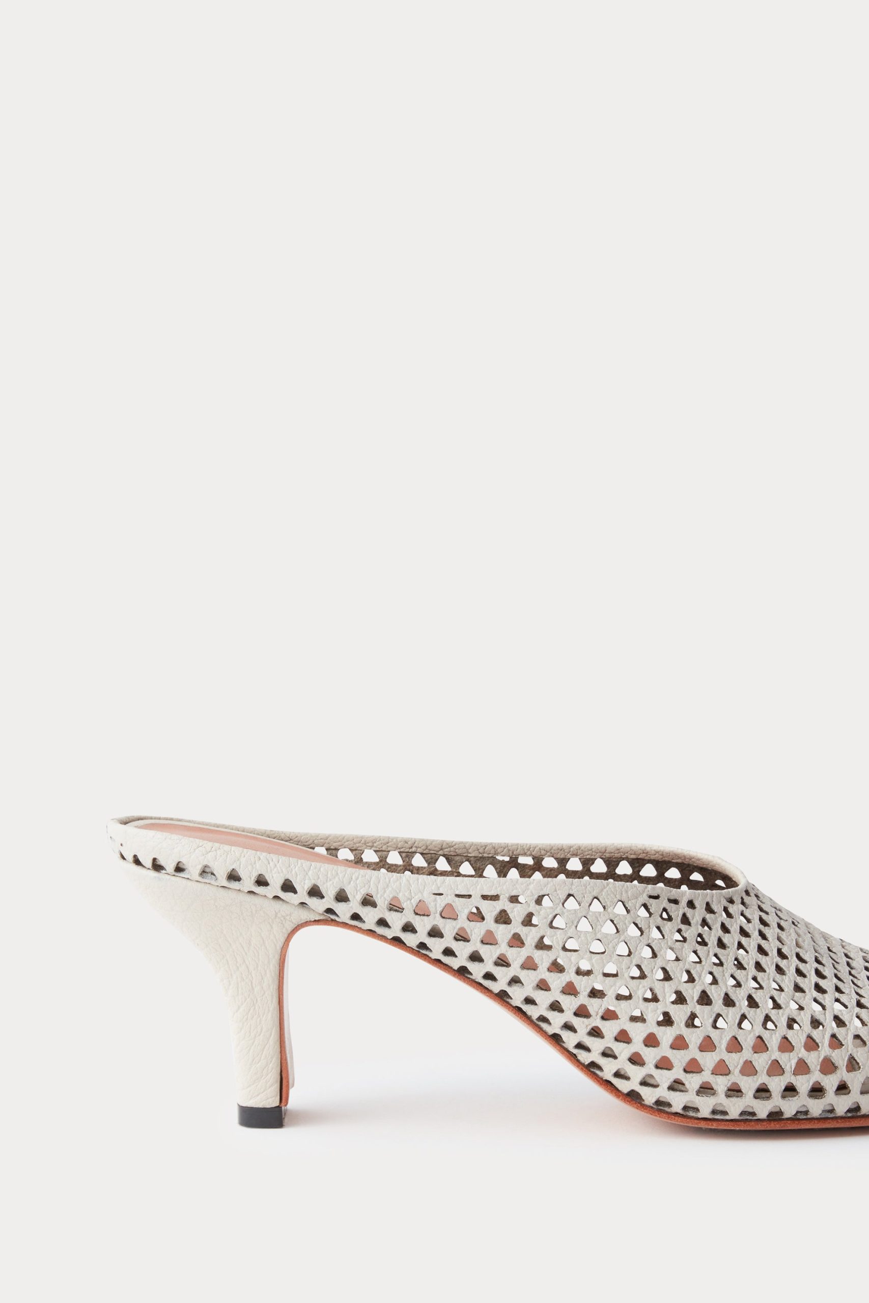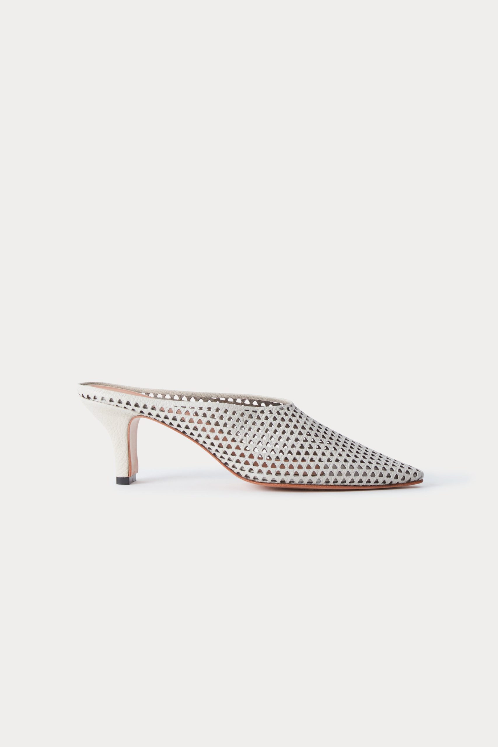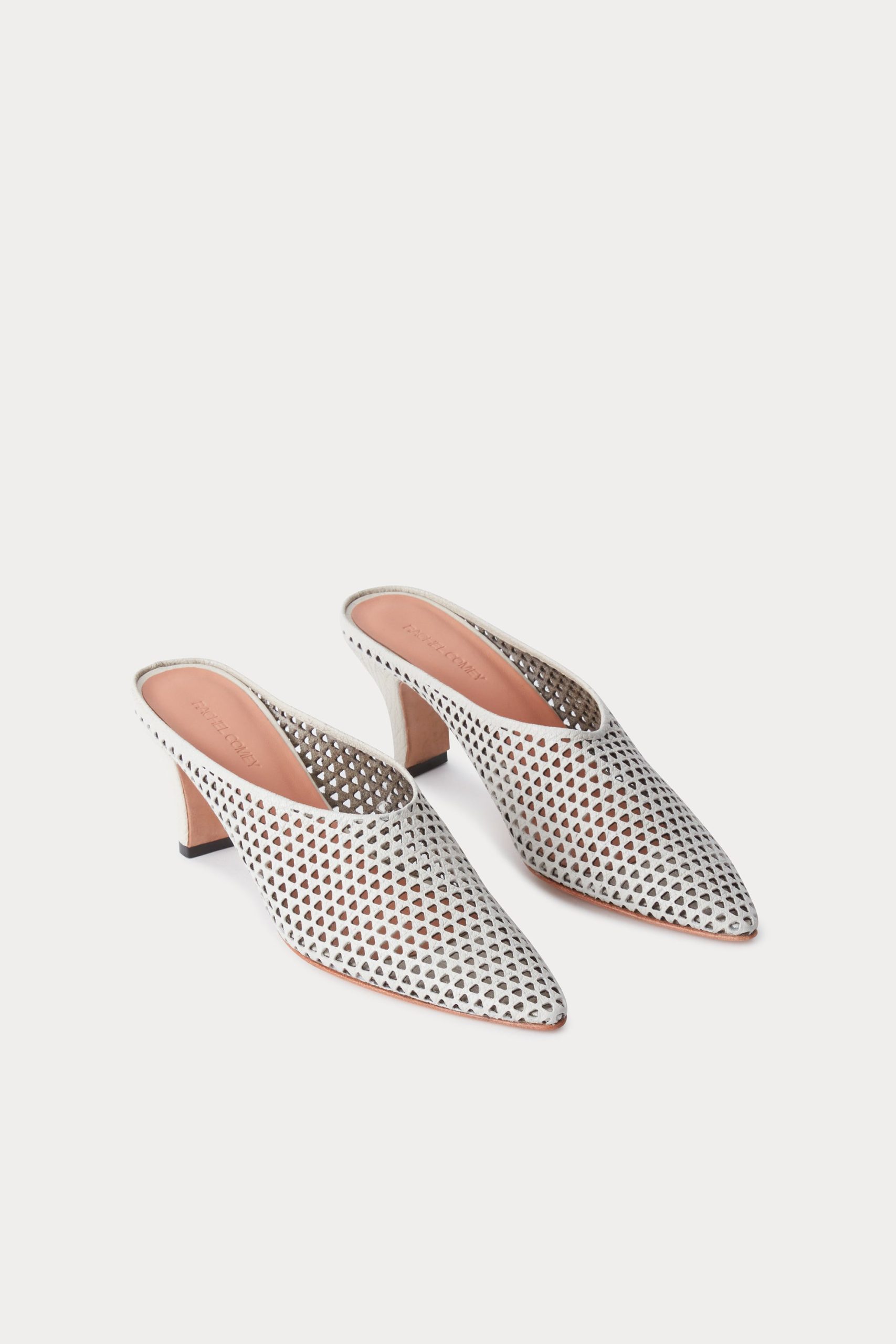 Pointed-toe kitten heel mules in perforated Nappa leather. Adds texture to any look.
