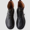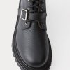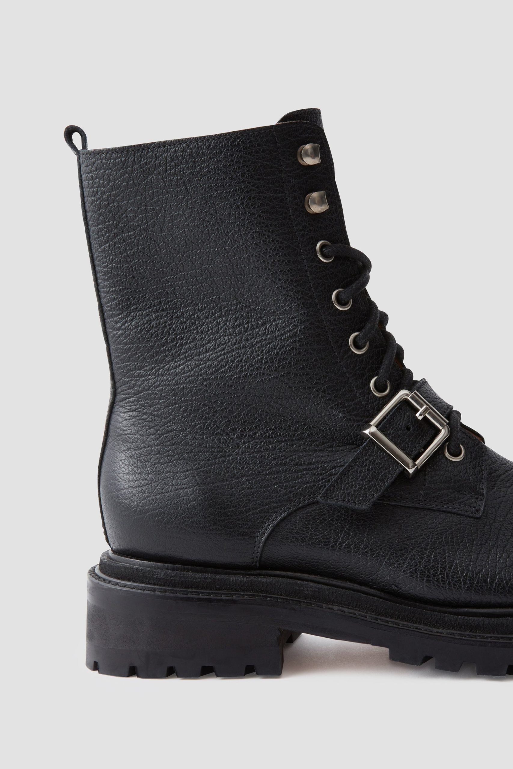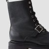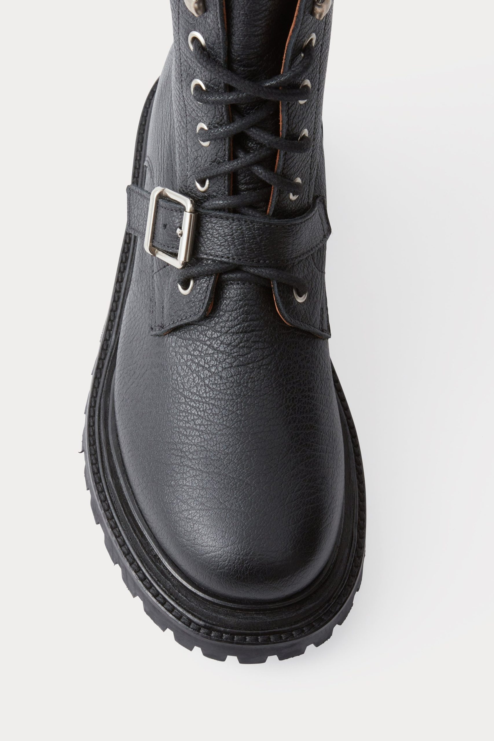 Luxurious Nappa leather combat boots with a round toe and chunky platform sole. Features metal buckle detail and lace-up closure.
