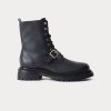 Luxurious Nappa leather combat boots with a round toe and chunky platform sole. Features metal buckle detail and lace-up closure.